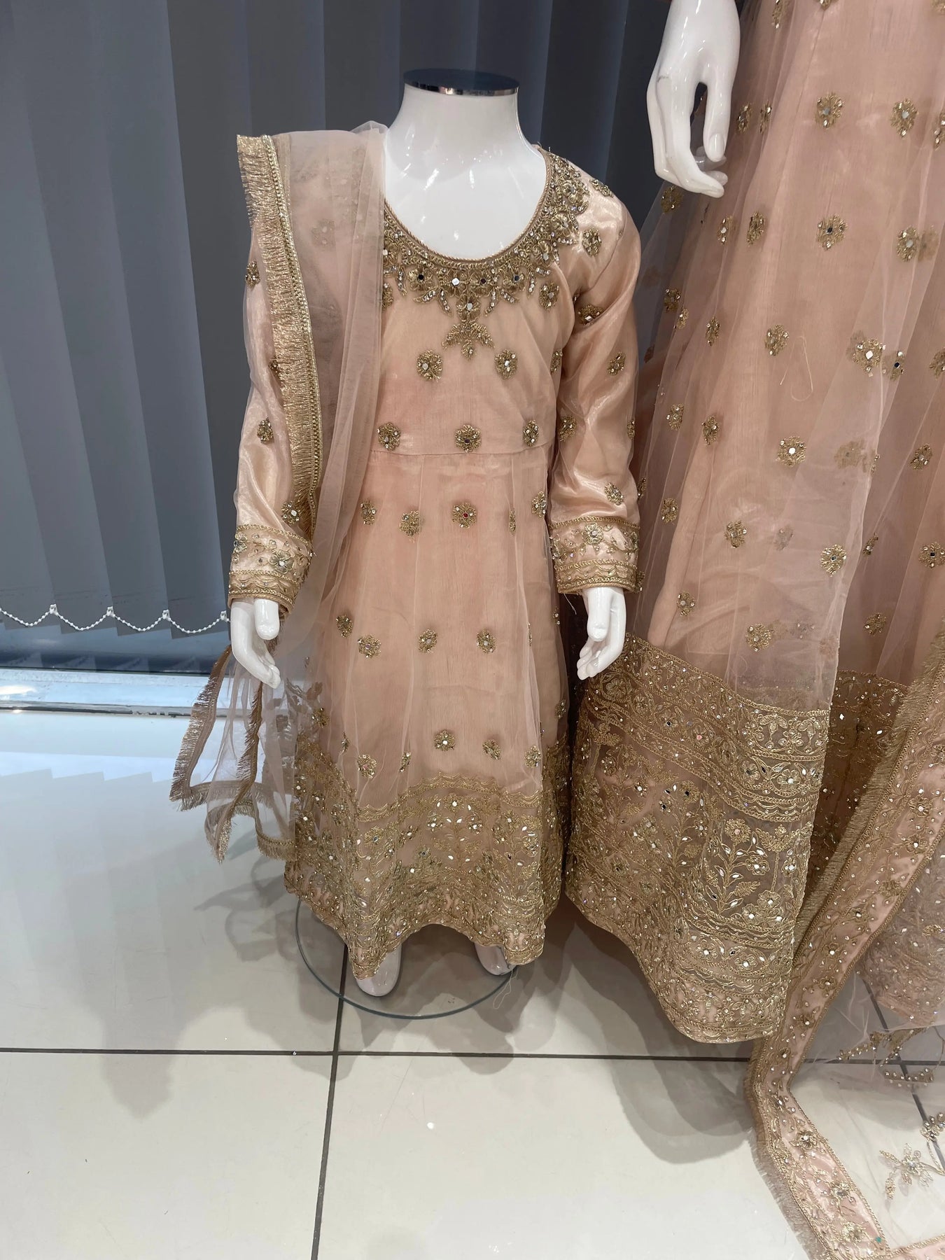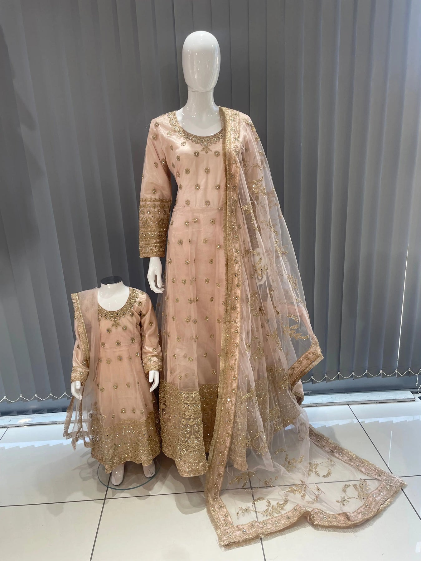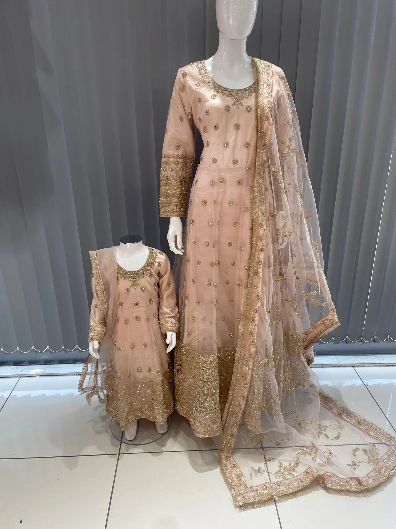 ASHA | Embroidered Net Mother & Daughter Ready To Wear Beige Pink| AS77