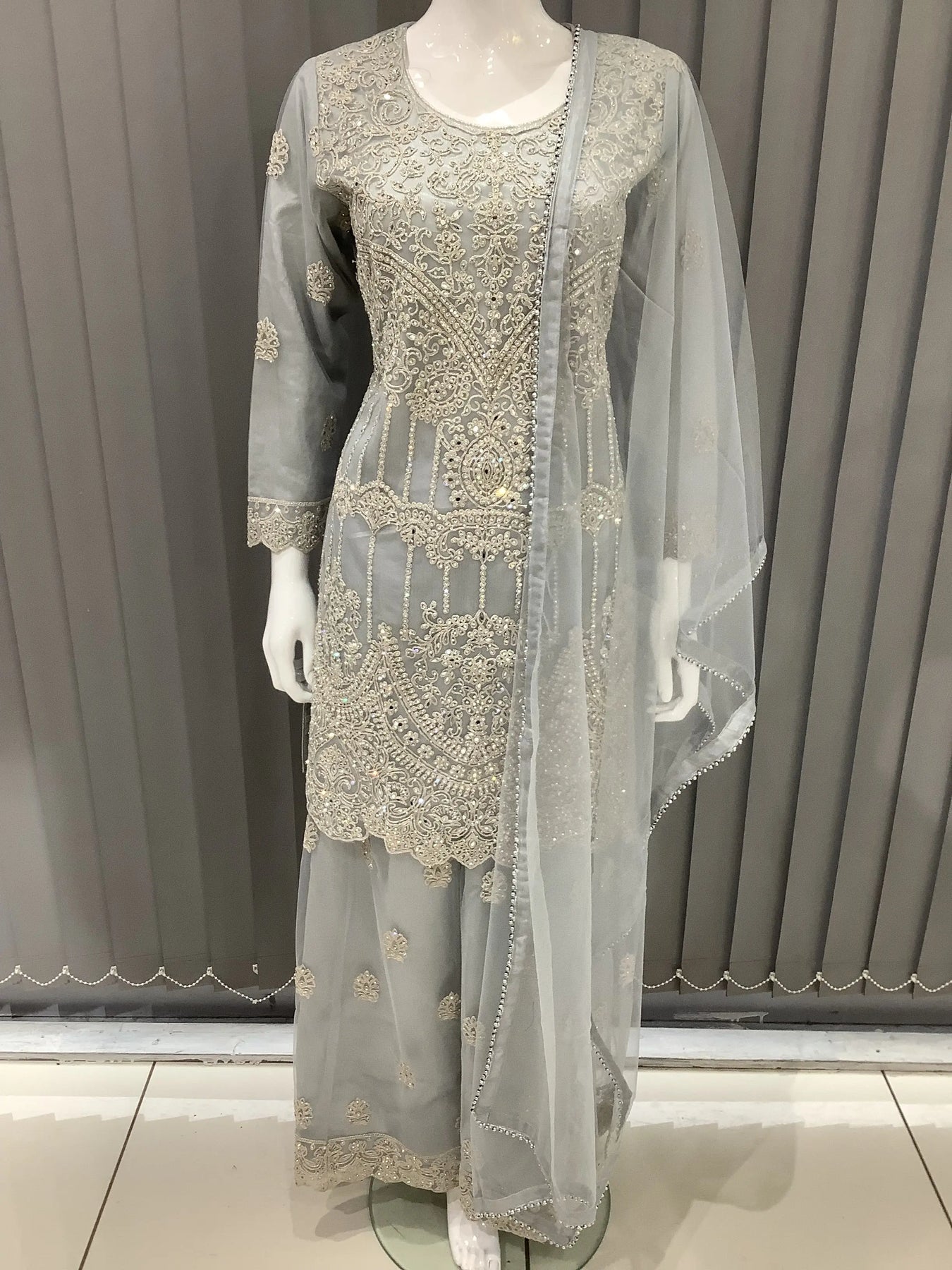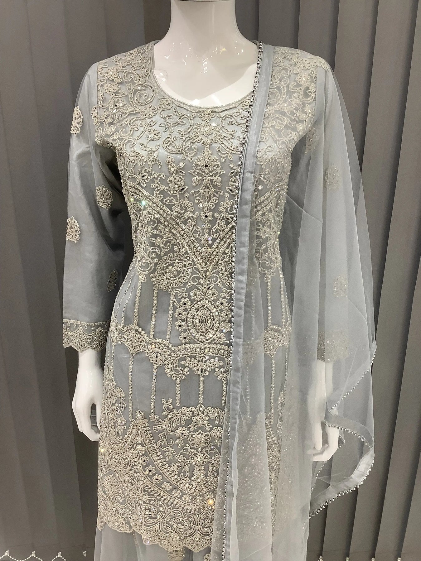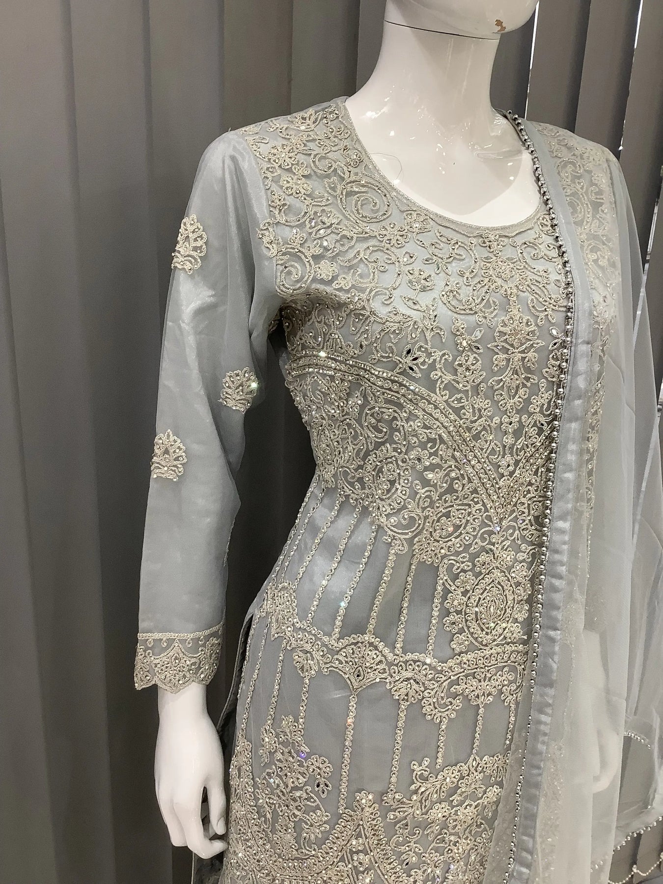 Embroidered Net dress with an embroidered Chiffon Dupatta. The dress includes heavy embroidery with intricate details.