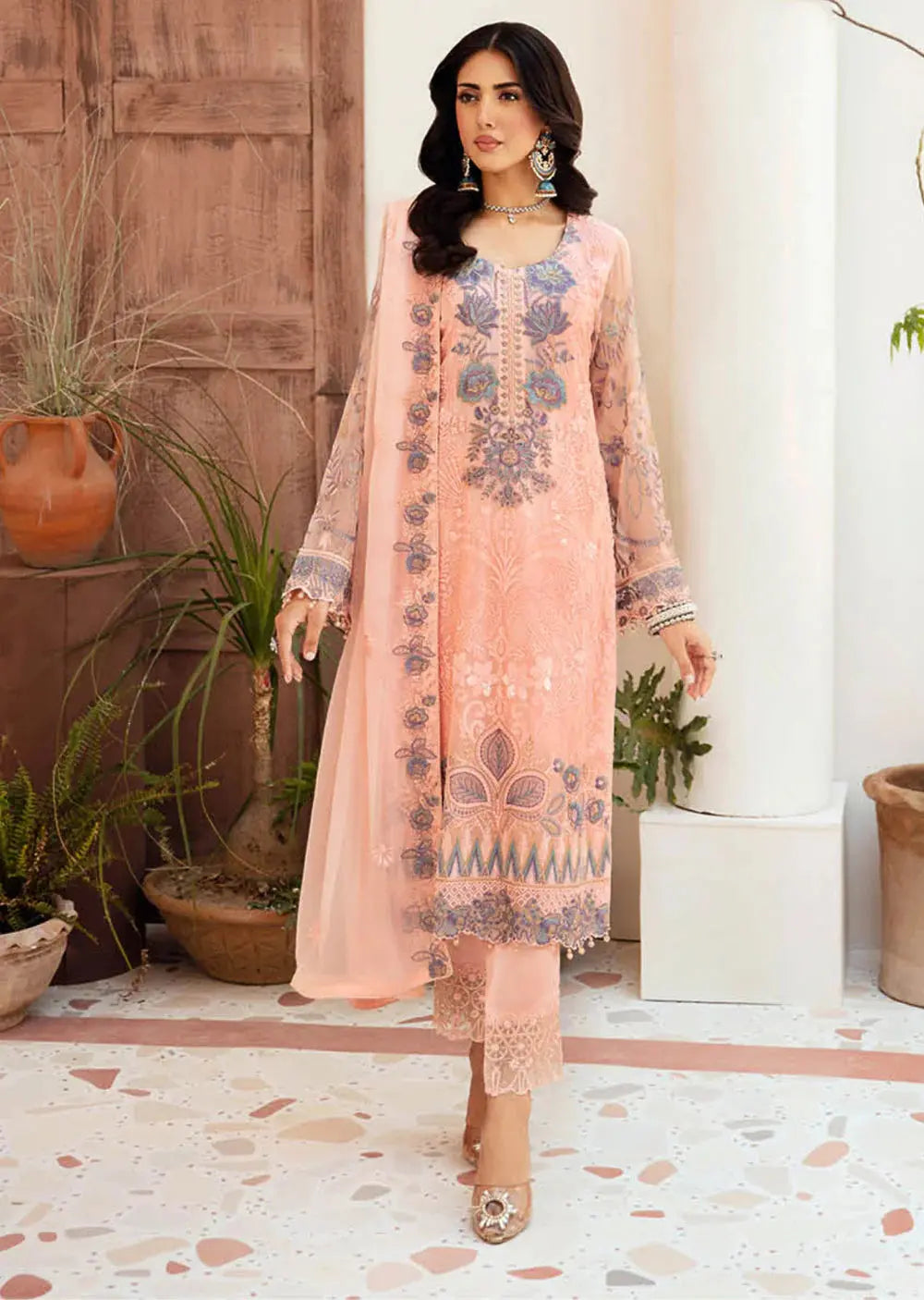 Featuring a sequined embroidered chiffon front, an embroidered chiffon back, and chiffon sleeves adorned with intricate lace. The organza lace detailing on the daman adds a touch of sophistication, while the embroidered chiffon dupatta completes the look with graceful charm. This ensemble is the epitome of timeless beauty and luxury.