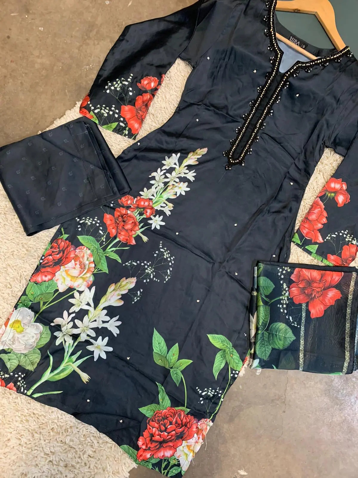 Stylish and trendy 3pc printed silk that is perfect for everyday wear. To complete this, it comes at an unbeatable price that makes it a must have!