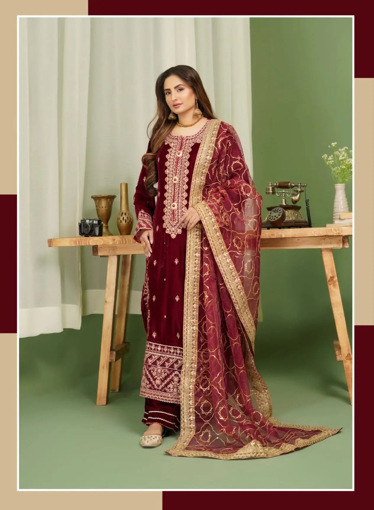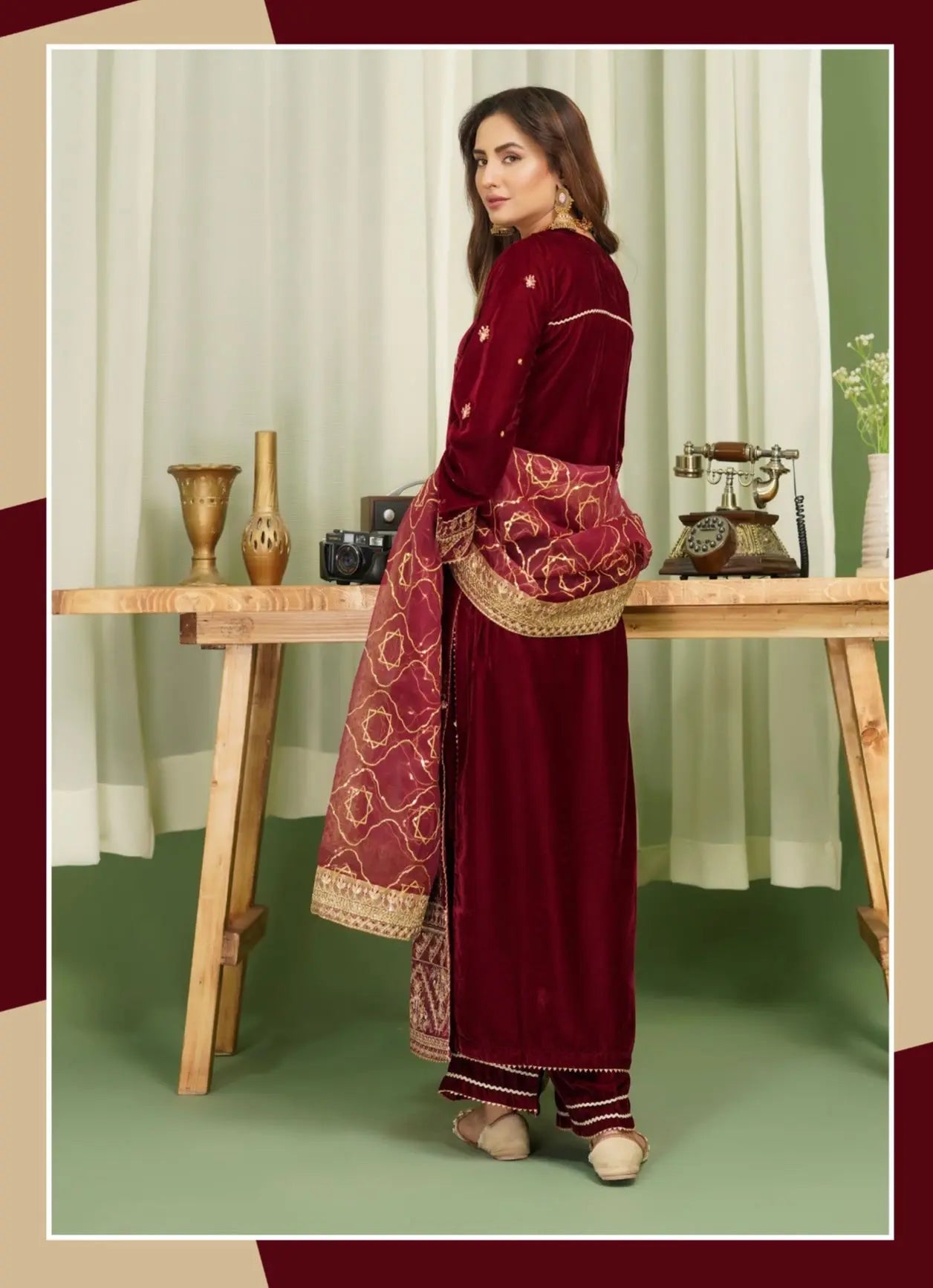 SIMRANS ‘Makhmali’ | Embroidered Velvet Fancy Dupatta Readymade | SM718 (Maroon)