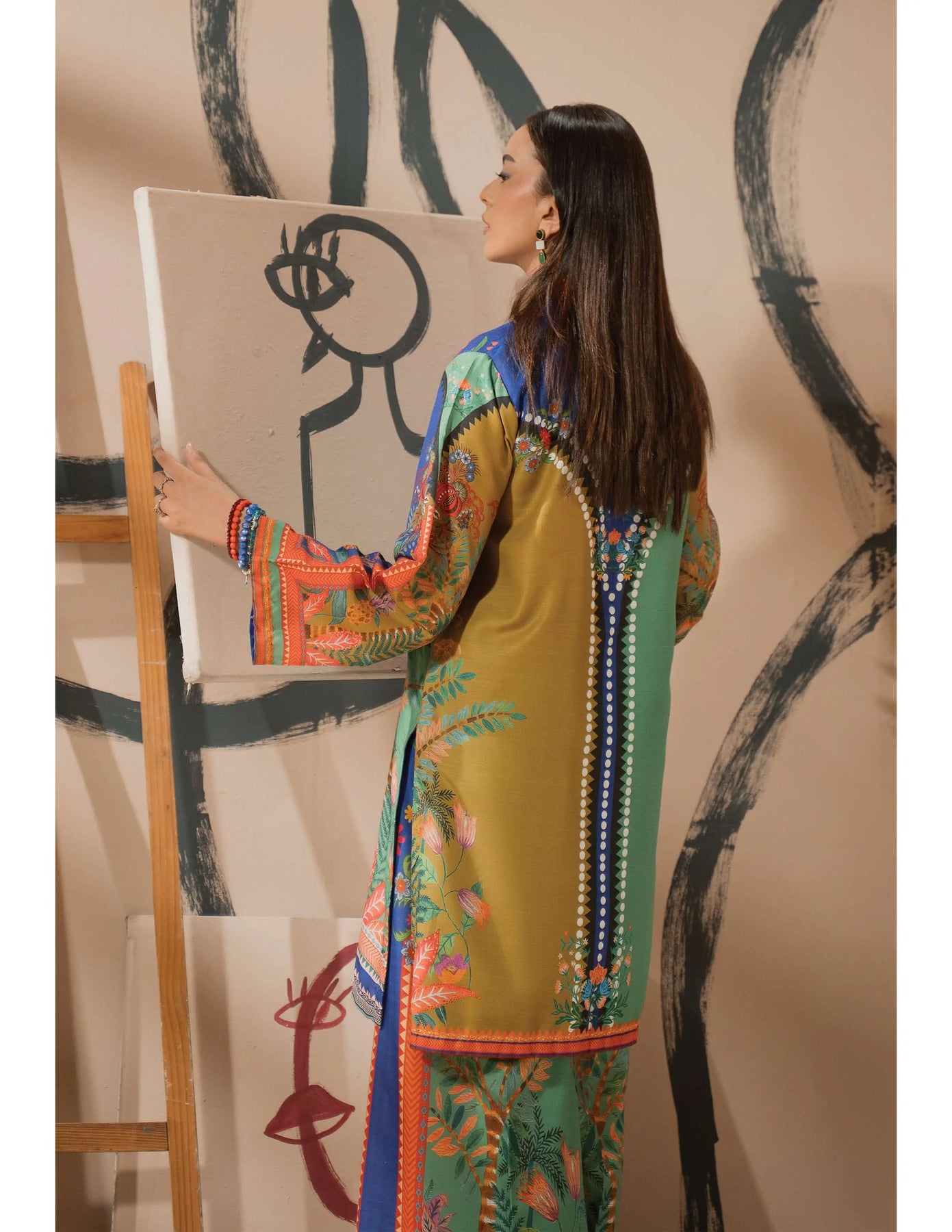 Perfect for desi brunches, kitty parties, daawats, or casual hangouts – this outfit blends vibrant colours with everyday sophistication. A true reflection of Pakistani chic fashion.