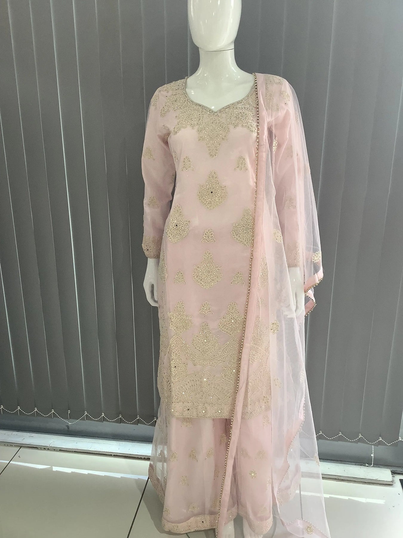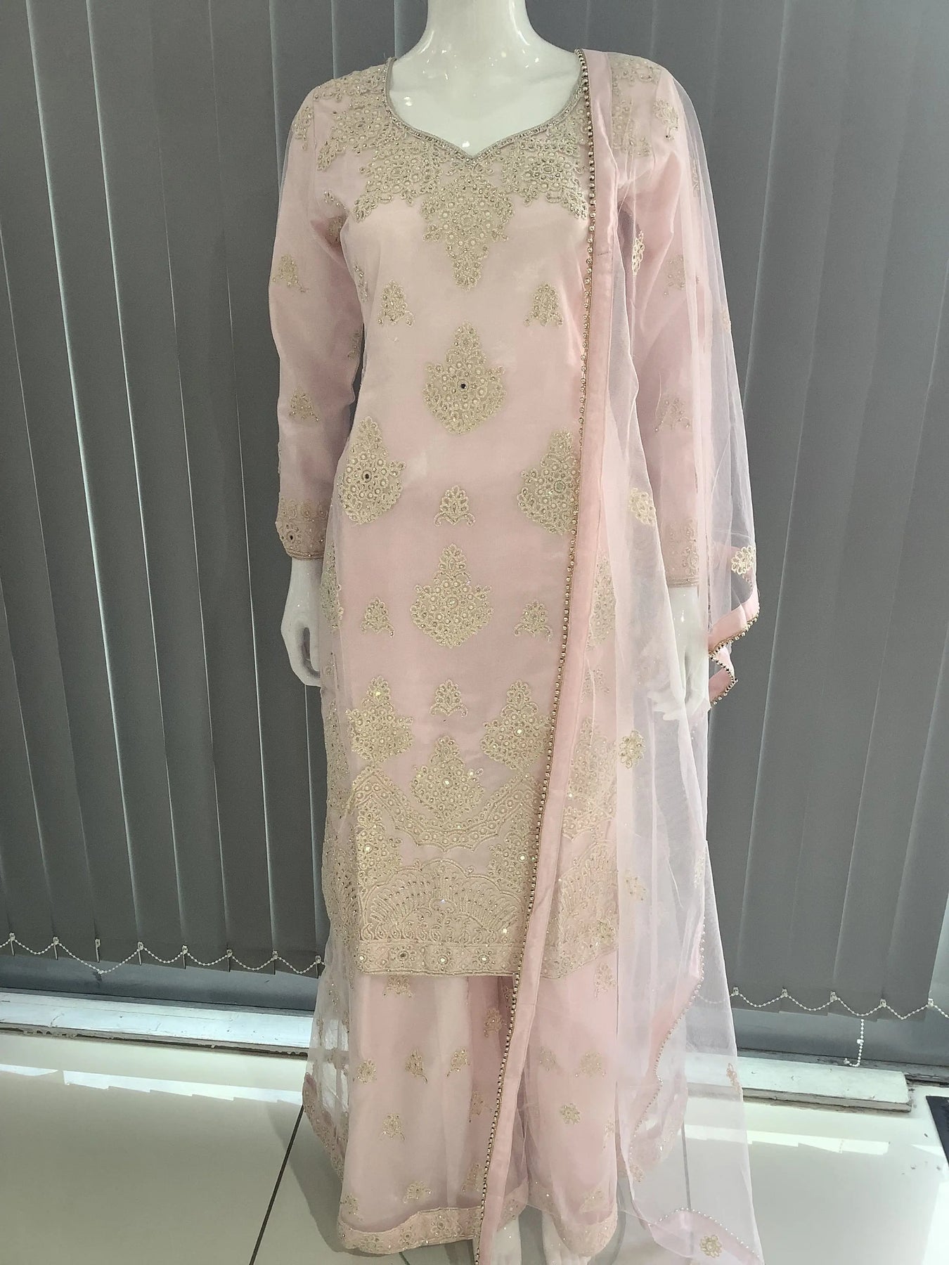 Embroidered Net kameez and Plazo with an embroidered  Dupatta. The Dress includes heavy embroidery with intricate details.