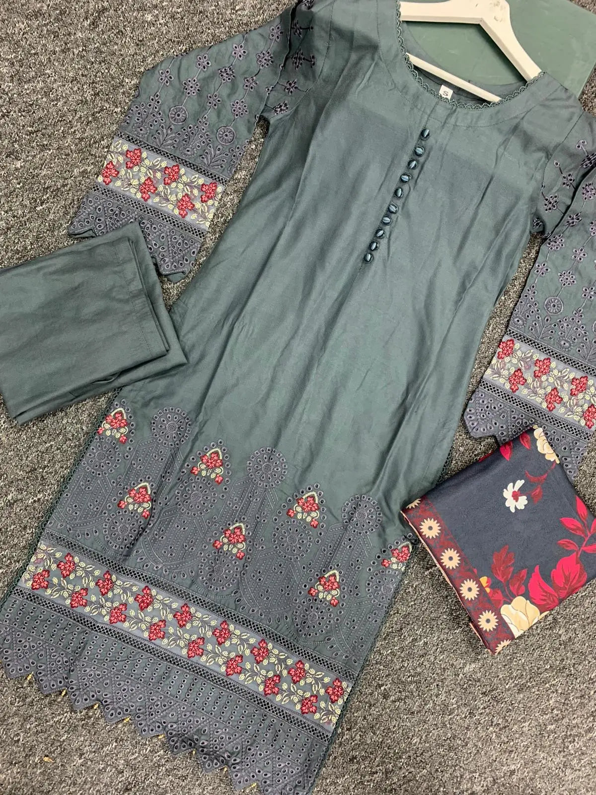 Elevate your wardrobe with this Soft Dhanak Kameez Set, a perfect blend of elegance and comfort. The kameez is adorned with intricate embroidery, enhanced by delicate cutwork and organza detailing, giving it a refined and graceful appeal. Paired with a matching trouser for effortless style and a beautifully crafted shawl, this outfit is ideal for any formal or semi-formal occasion. Experience the softness of premium dhanak fabric while showcasing timeless sophistication.