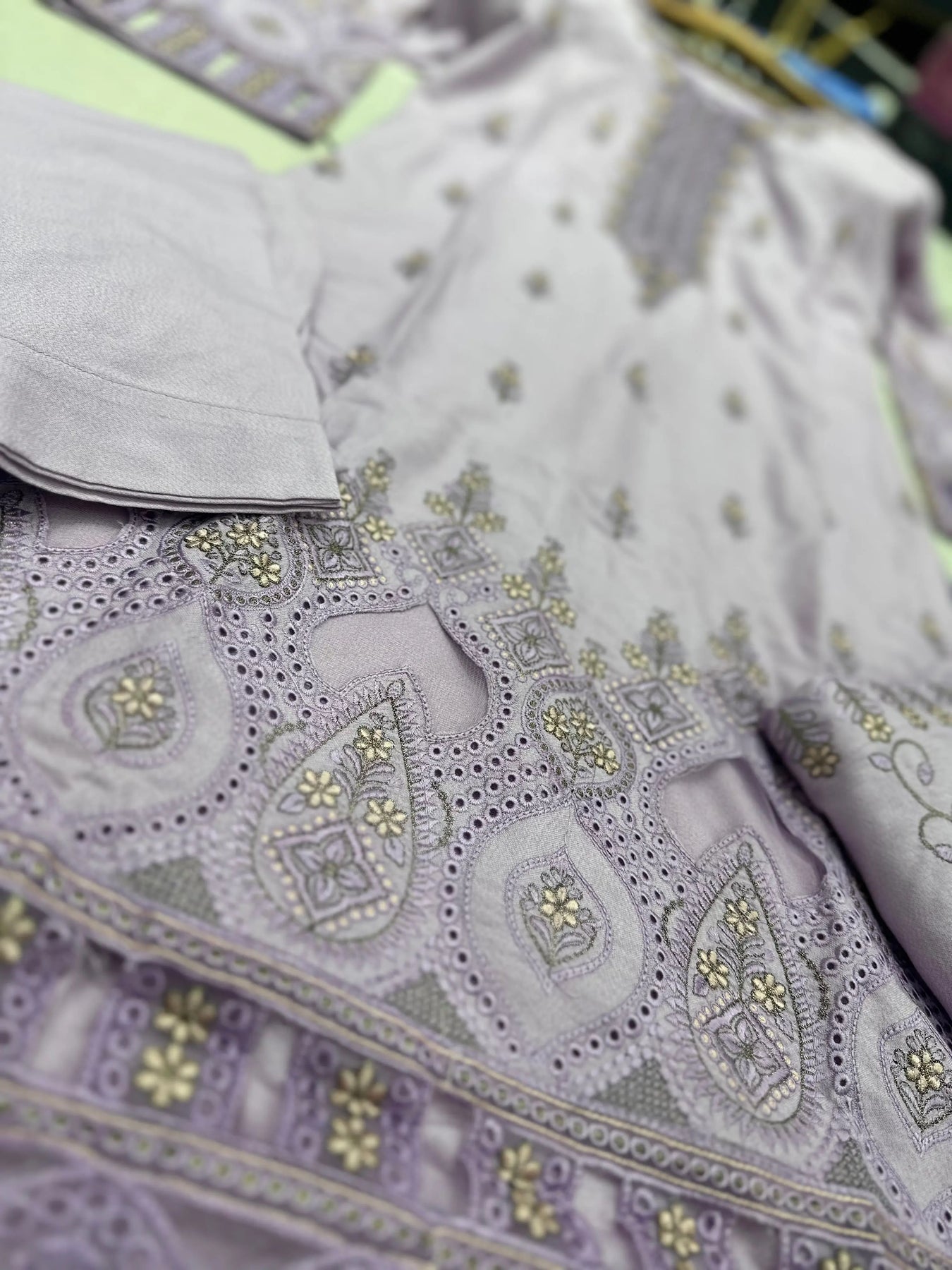 • Design: Intricate embroidery with elegant cutwork and organza details.
