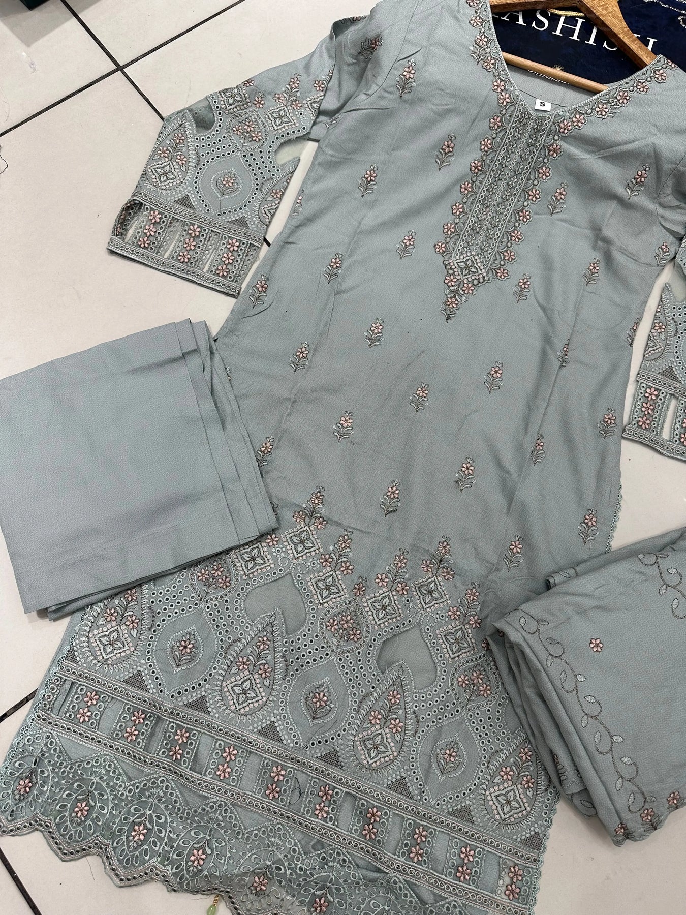 - Design: Intricate embroidery with elegant cutwork and organza details.