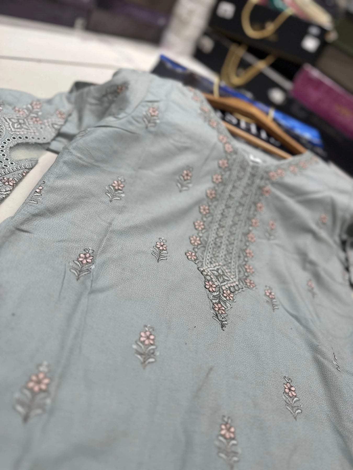 Hand Embroidered items are delicate in nature and can break of beading can become displaced. There is also a possibility in embroidery designs and prints which is unavoidable. By placing an order on our website you agree and accept the possibility of variation in comparison to the advertised images displayed on the website. We make every effort to minimise variations.