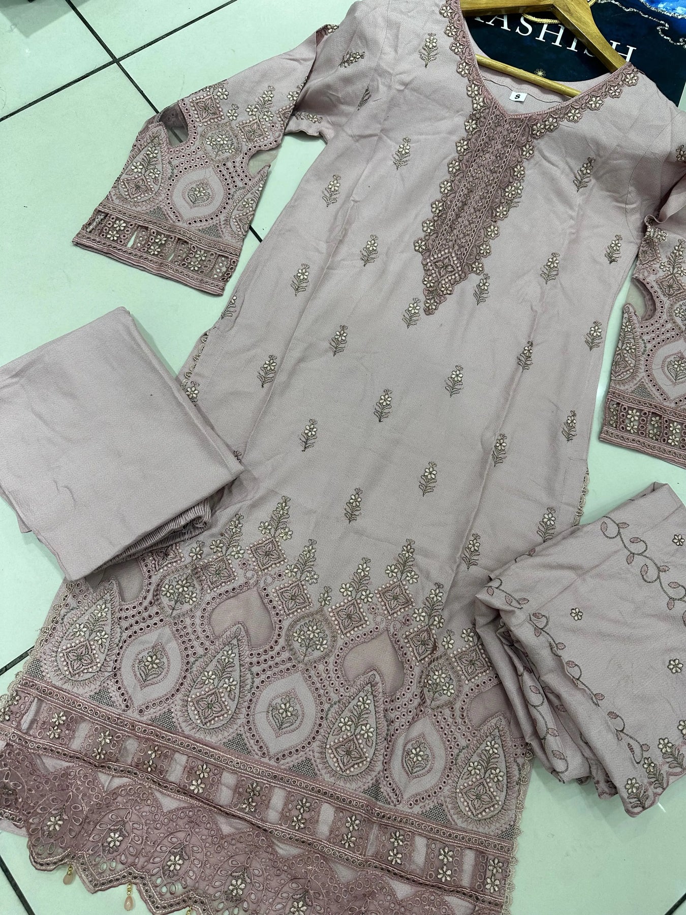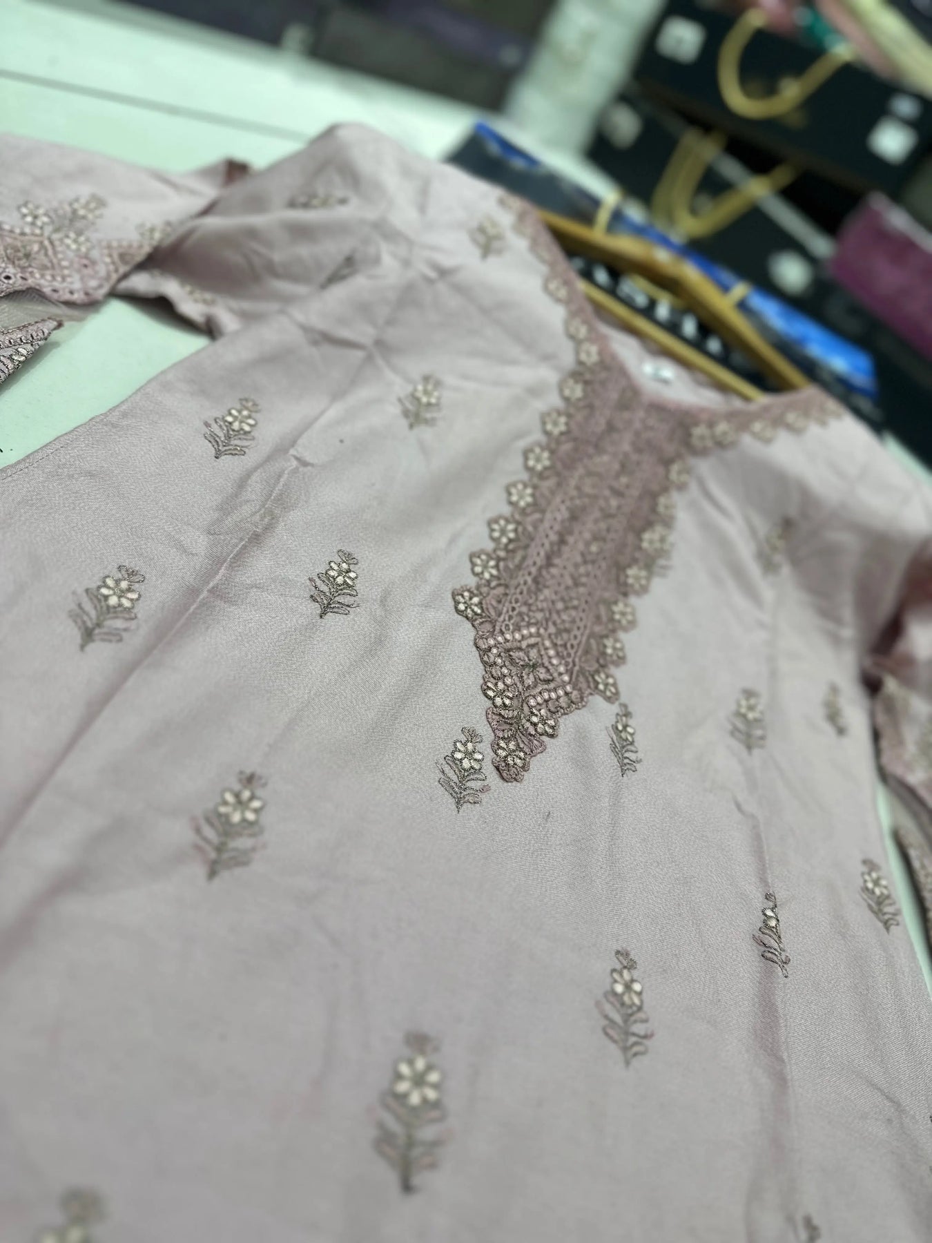 Elevate your wardrobe with this Soft Dhanak Kameez Set, a perfect blend of elegance and comfort. The kameez is adorned with intricate embroidery, enhanced by delicate cutwork and organza detailing, giving it a refined and graceful appeal. Paired with a matching trouser for effortless style and a beautifully crafted shawl, this outfit is ideal for any formal or semi-formal occasion. Experience the softness of premium dhanak fabric while showcasing timeless sophistication.