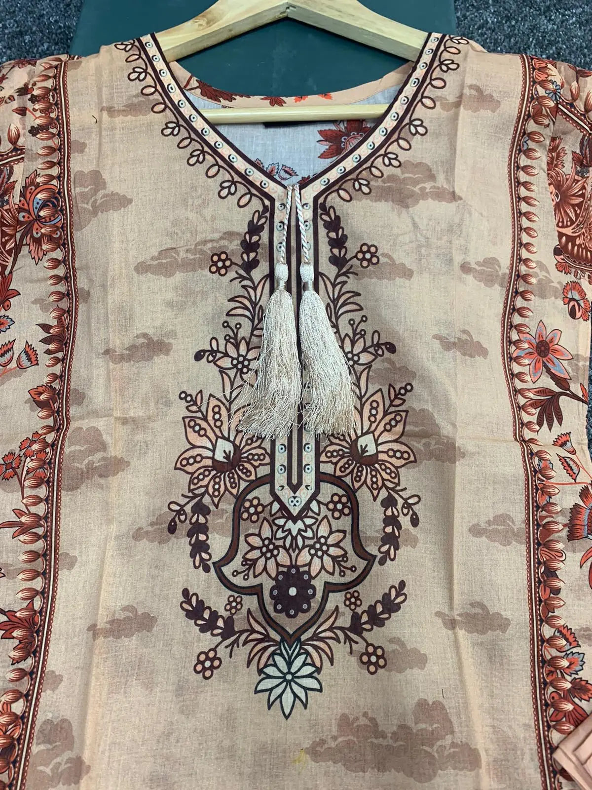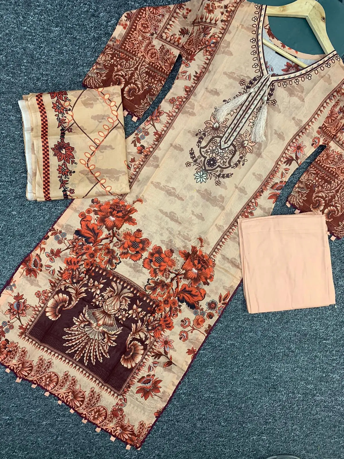 Embrace timeless elegance with our Embroidered Lawn with digital printed chiffon dupatta ensemble. Crafted from luxurious lawn, this outfit offers both comfort and style, making it perfect for both casual and formal occasions. The intricate embroidery on the fabric adds a touch of sophistication, highlighting the artistry and attention to detail that goes into every stitch.