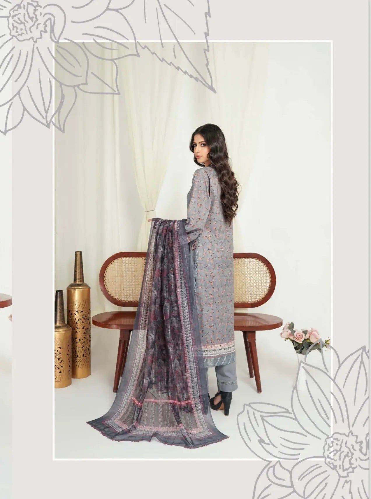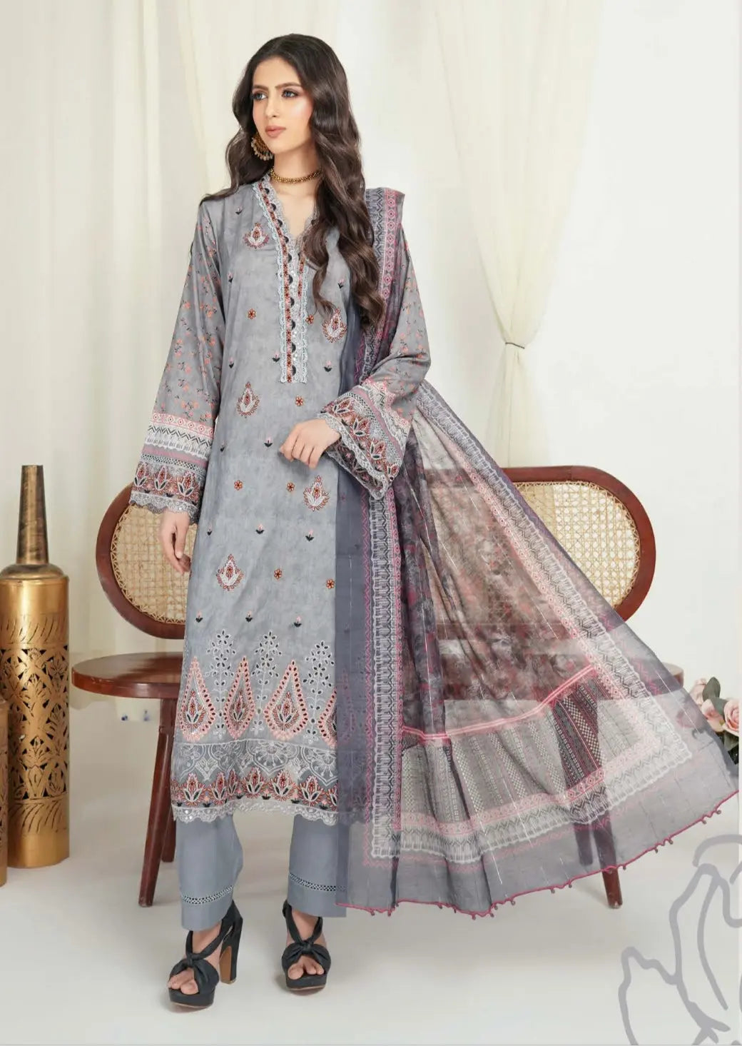 Elevate your spring wardrobe with this elegant embroidered linen kameez, designed for both comfort and style. Delicate embroidery adorns the daman, neckline, and arms, adding a touch of sophistication to this timeless piece. Paired with a vibrant digital print dupatta, this outfit effortlessly blends tradition with modern charm.