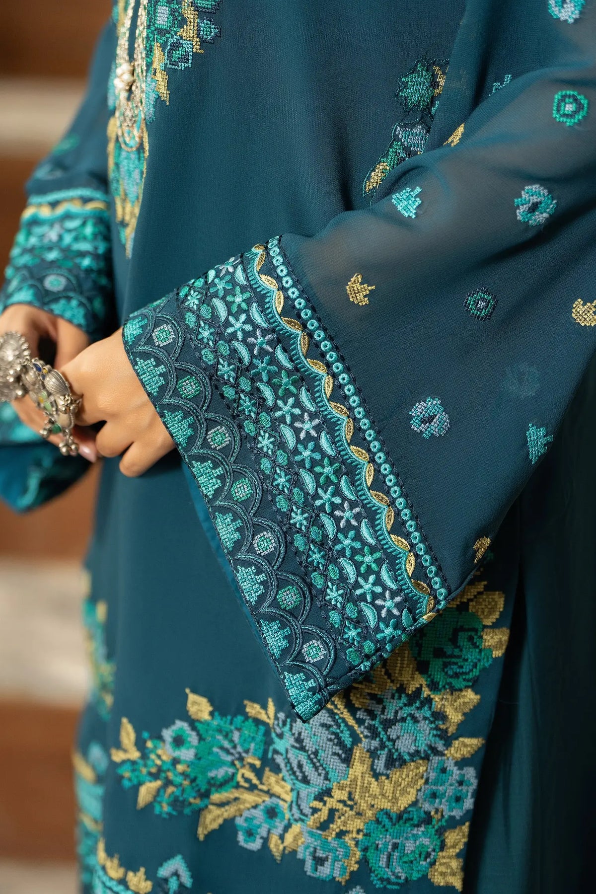 A beautifully tailored Georgette Chiffon shirt adorned with intricate cross-stitch embroidery that reflects the craftsmanship of our heritage. The neckline is finished with elegant metal buttons, adding a hint of modern charm to a timeless classic. ✨
