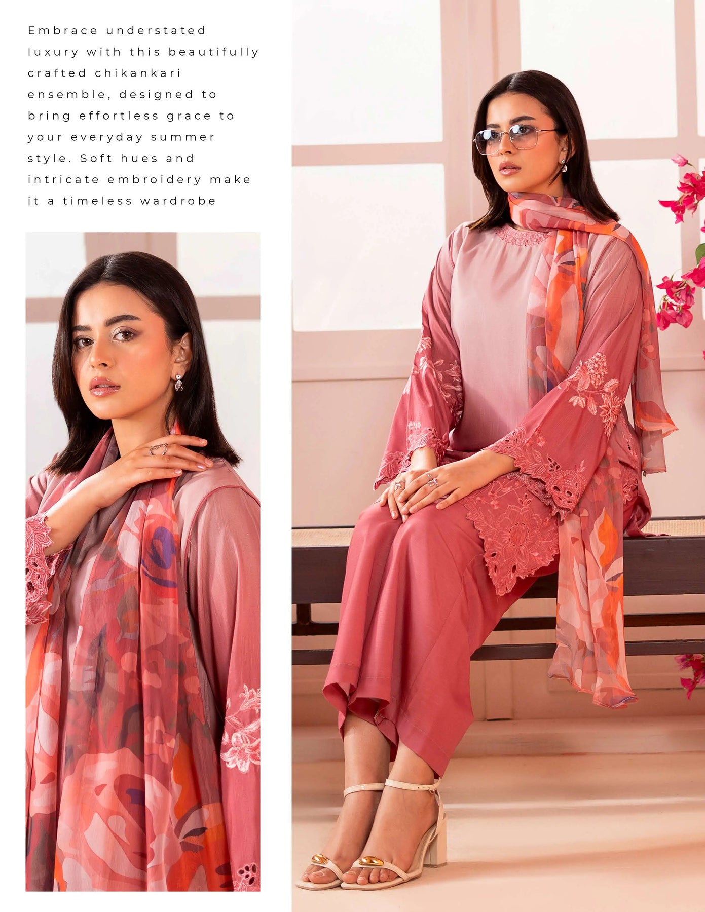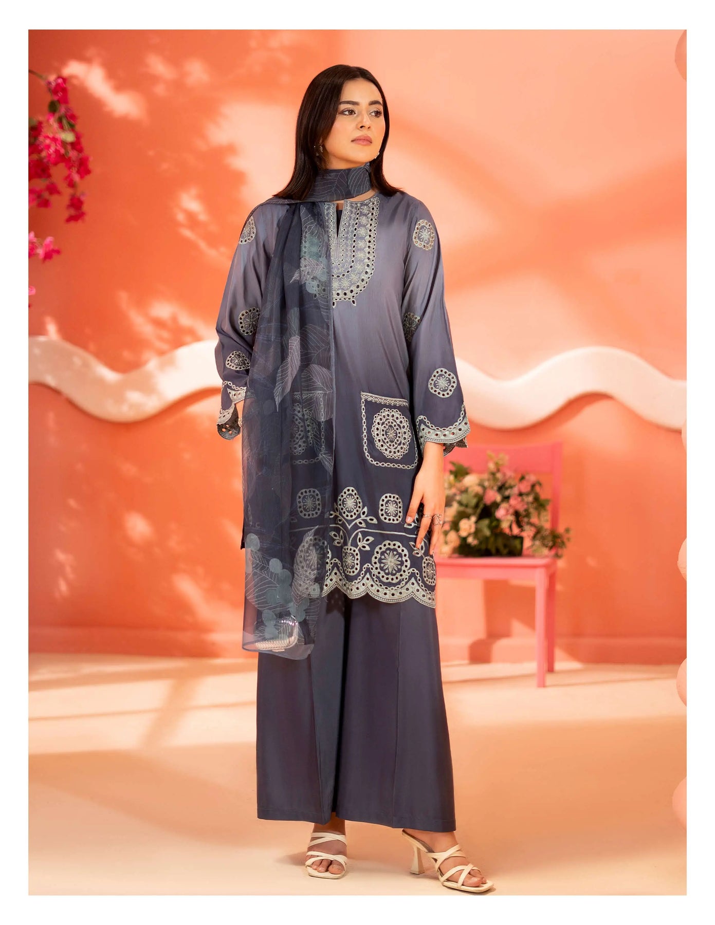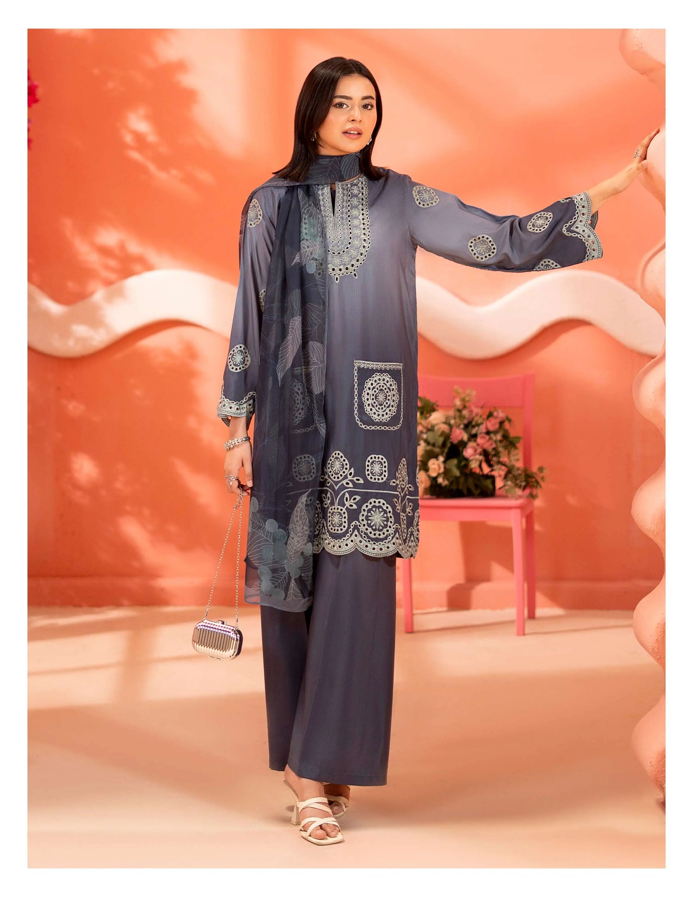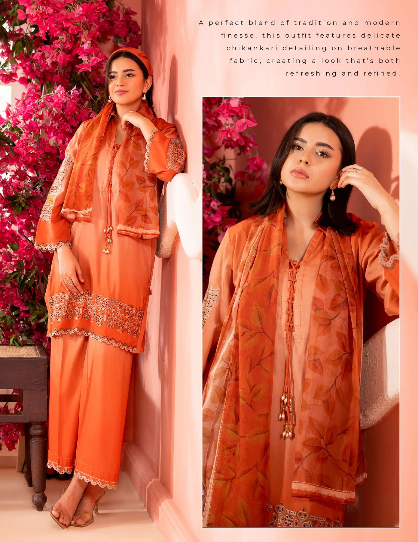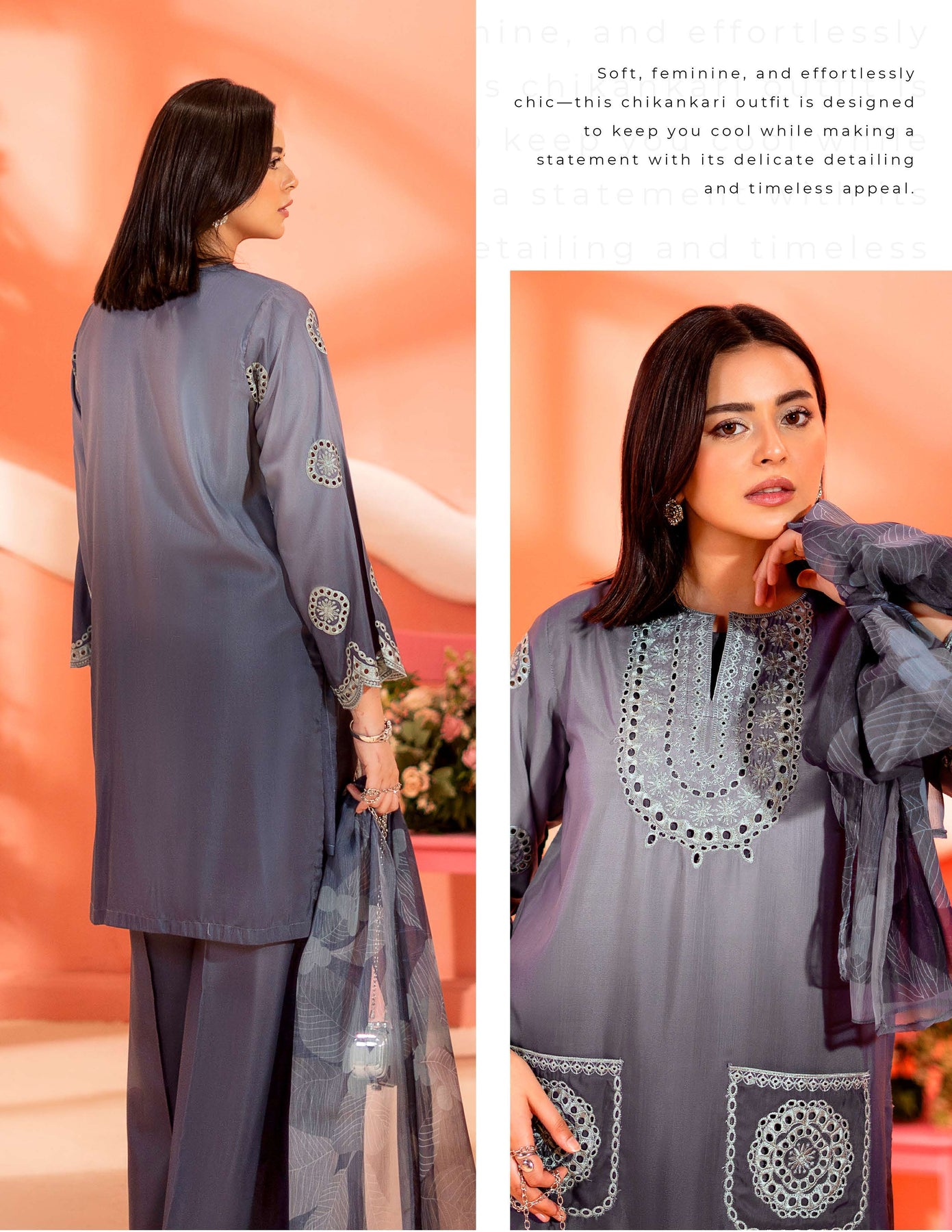 3-piece embroidered cotton chikankari “Mummy & Me” matching set, designed for both mother and daughter. Each set includes a delicately embroidered shirt, comfortable trousers, and a coordinated dupatta. Crafted from soft, breathable cotton with traditional chikankari detailing, it offers a graceful and timeless look. Perfect for festive occasions, family gatherings, and creating stylish matching moments.