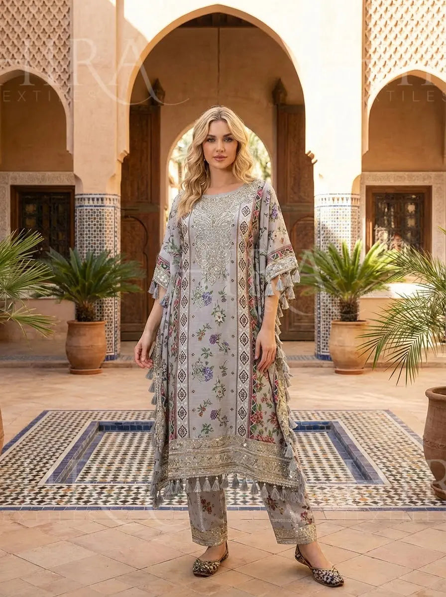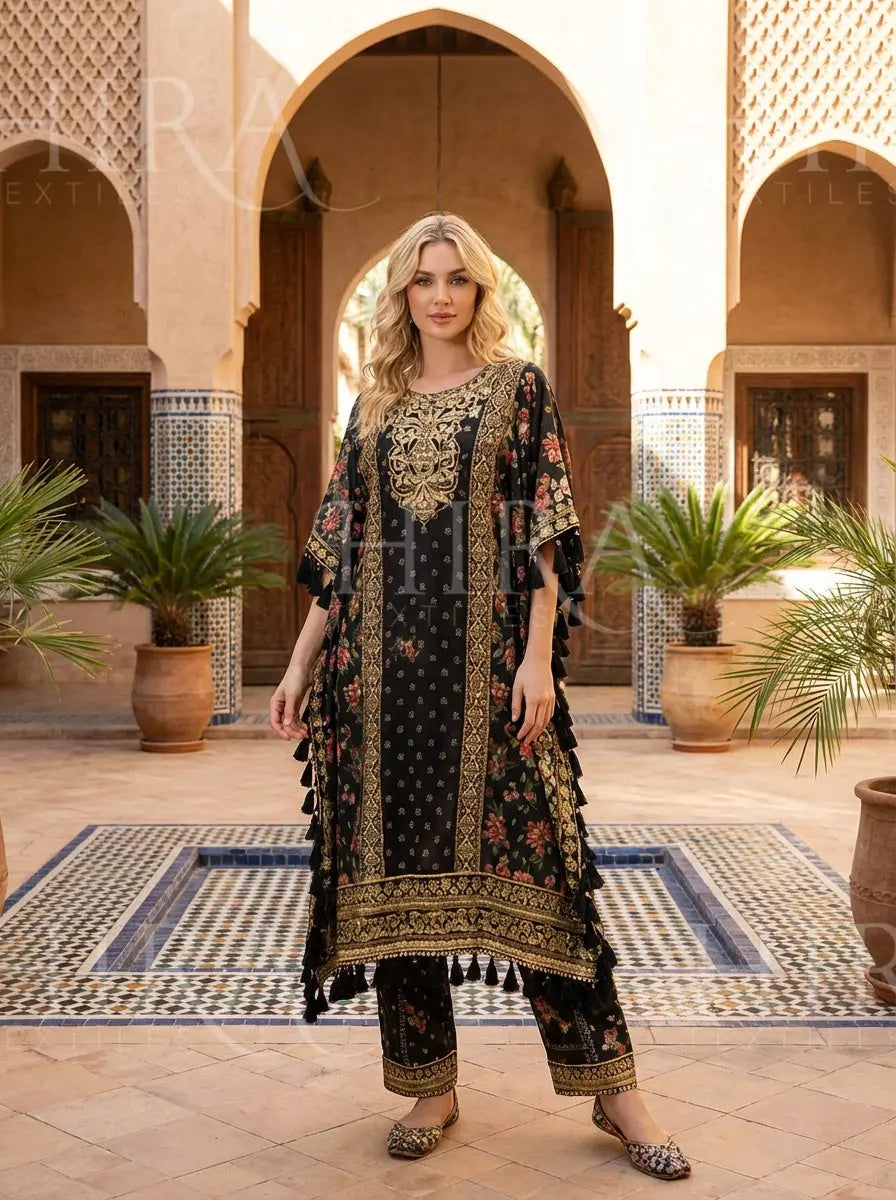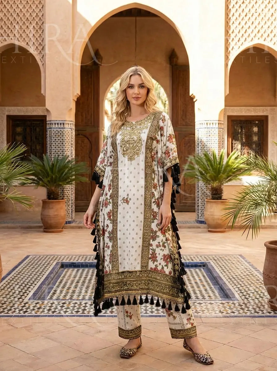 This elegant embroidered kaftan is designed to offer effortless style with a touch of refined sophistication. The flowing silhouette provides comfort and grace, making it a perfect choice for both casual gatherings and festive occasions.