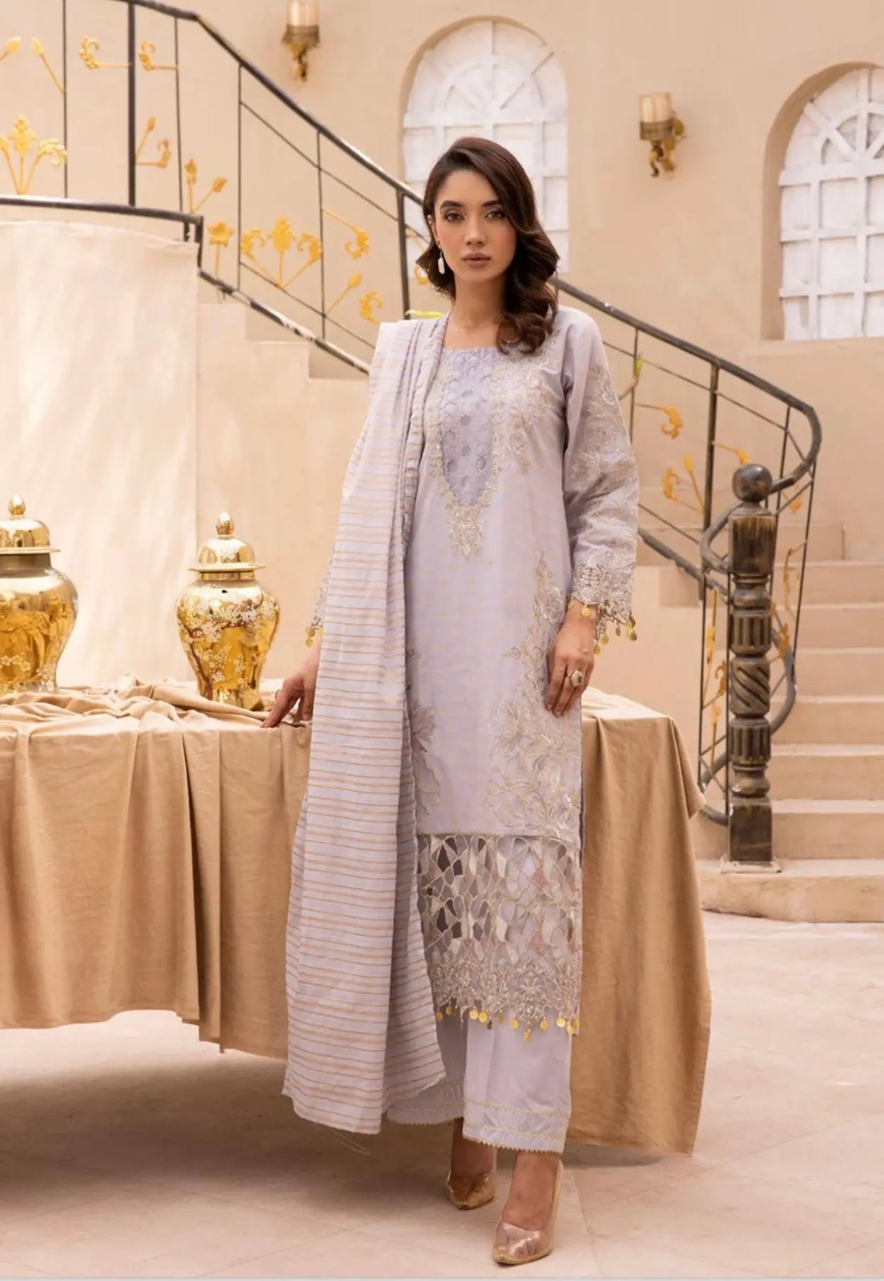 Hand Embroidered items are delicate in nature and can break of beading can become displaced. There is also a possibility in embroidery designs and prints which is unavoidable. By placing an order on our website you agree and accept the possibility of variation in comparison to the advertised images displayed on the website. We make every effort to minimise variations.