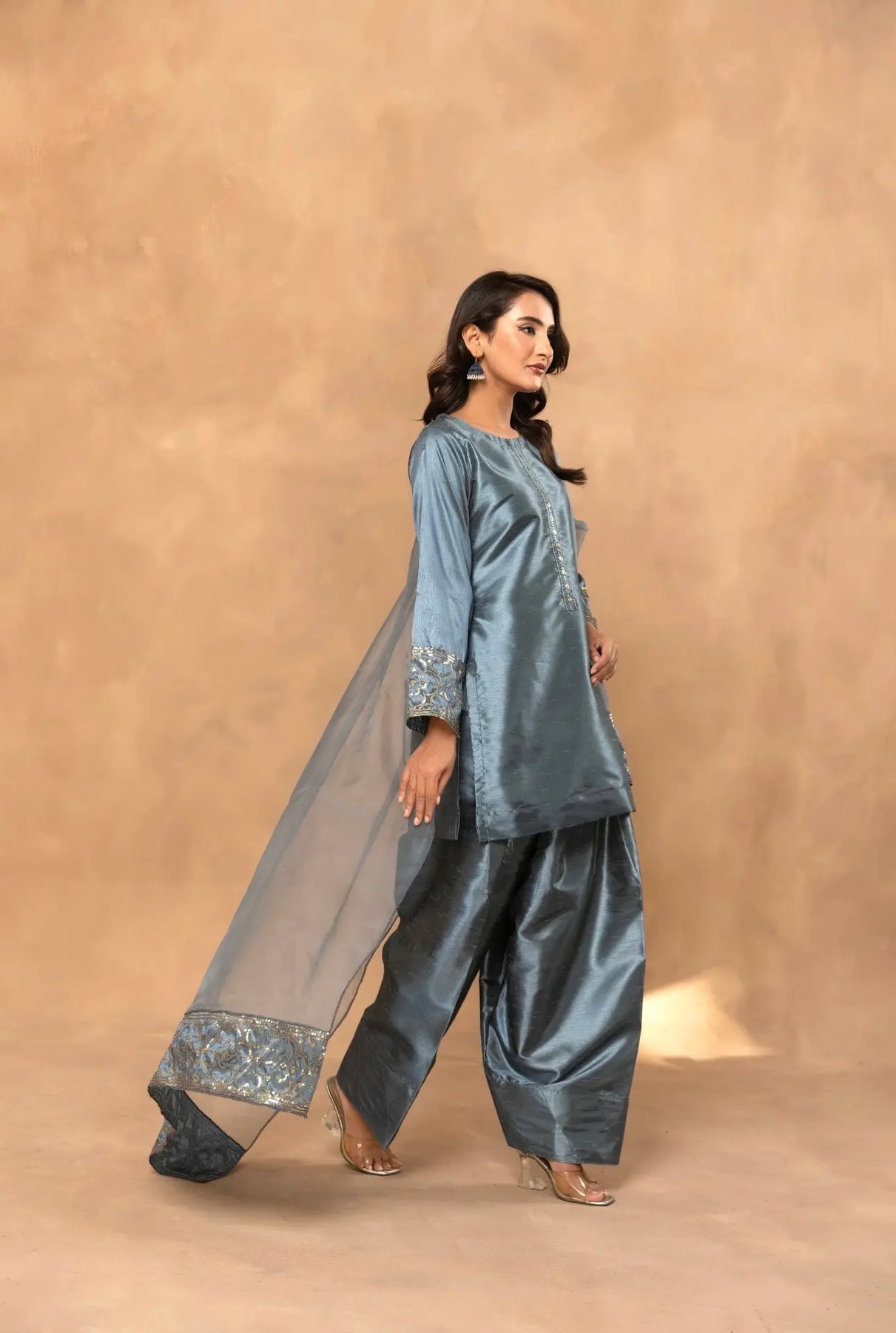 Turn heads this season in our luxuriously embroidered raw silk ensemble, paired with the most sought-after farshi shalwar trend straight from the runways!