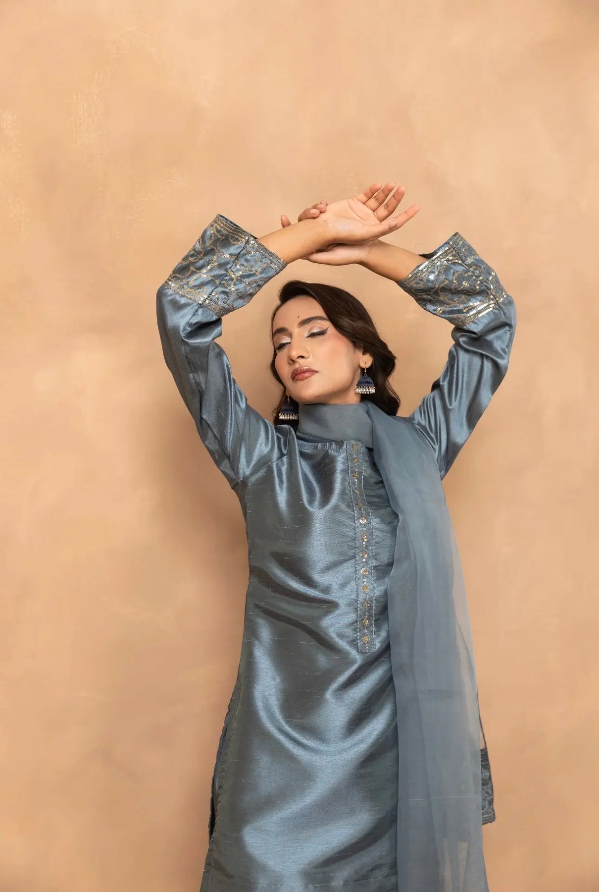From time to time beading/ sequences may get displaced and this is not thought of as a fault but is due to the nature of the work. These articles of clothing should be worn with care.