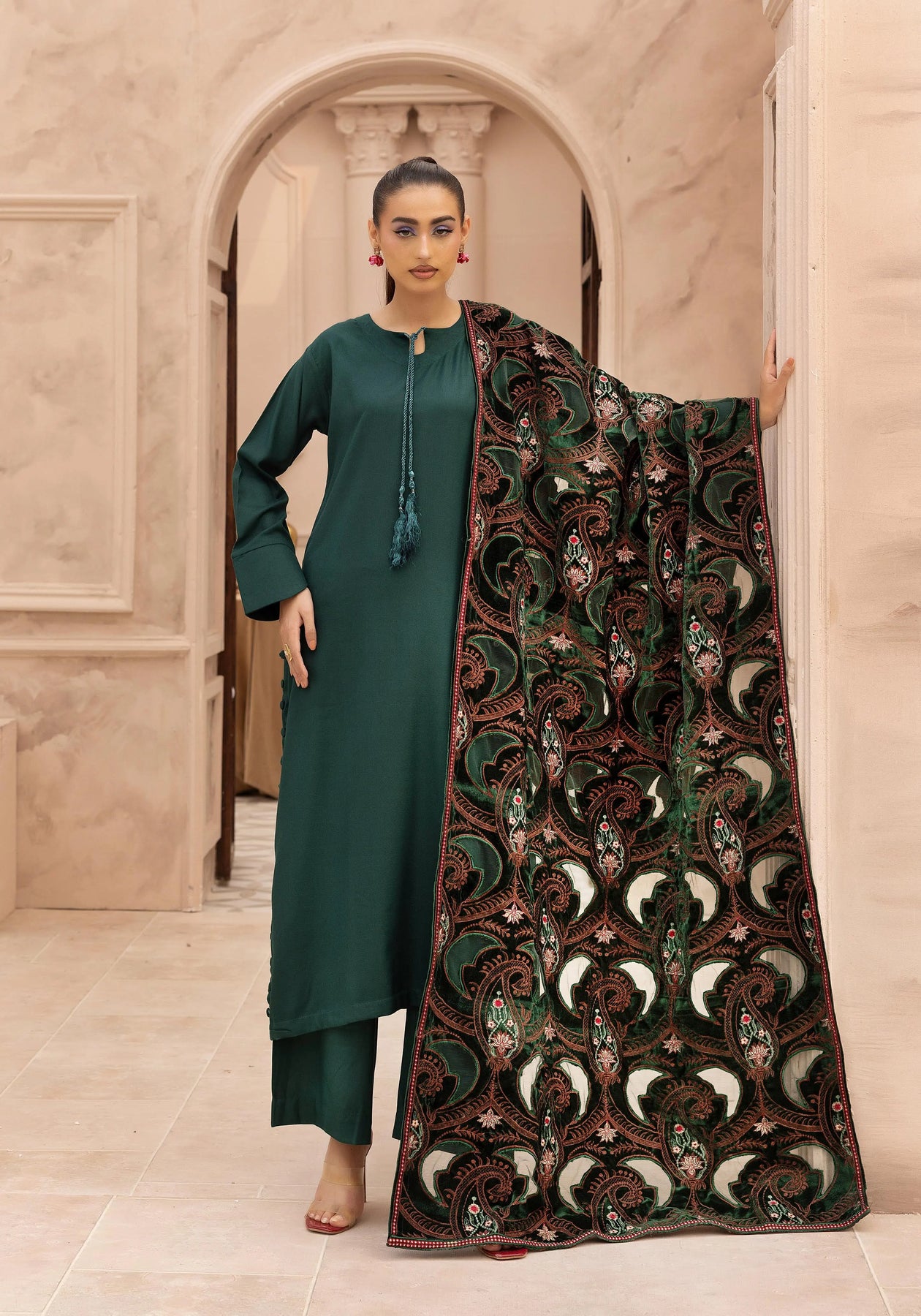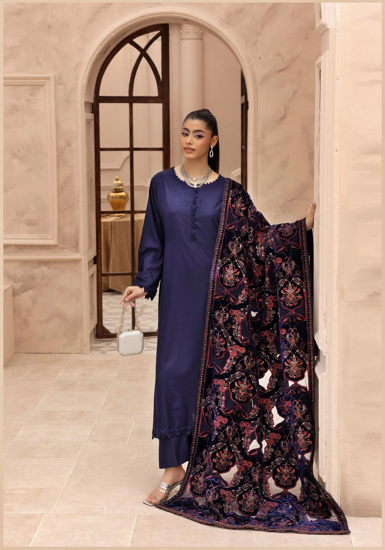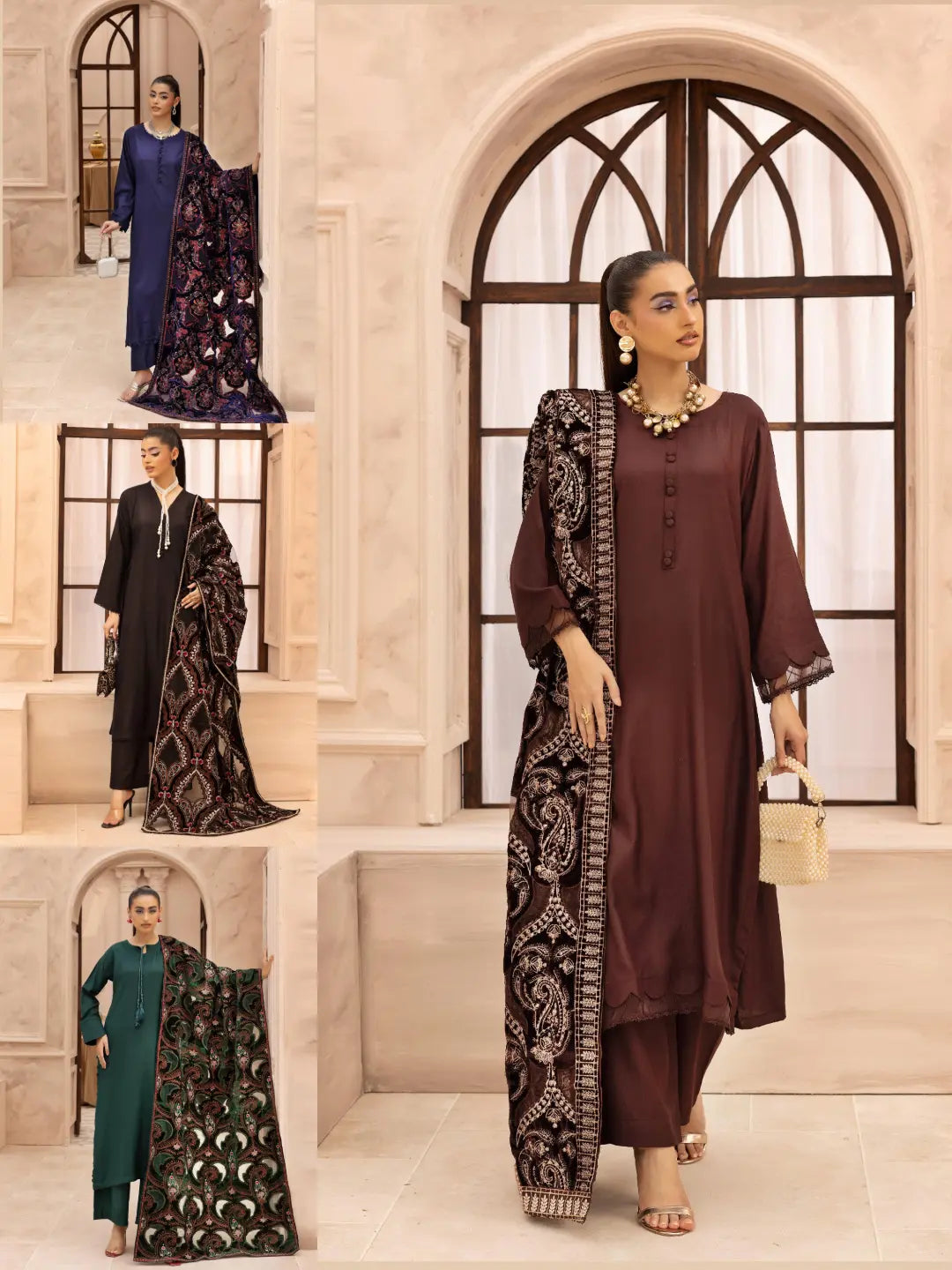 Crafted from premium Dhanak fabric, this suit features delicate embroidery that adds grace and refinement to every stitch. The soft texture and elegant detailing make it ideal for both casual gatherings and festive winter occasions. 🌸✨