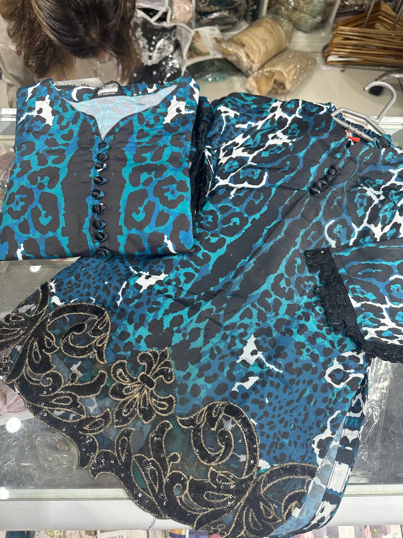 From time to time beading/ sequences may get displaced and this is not thought of as a fault but is due to the nature of the work. These articles of clothing should be worn with care.