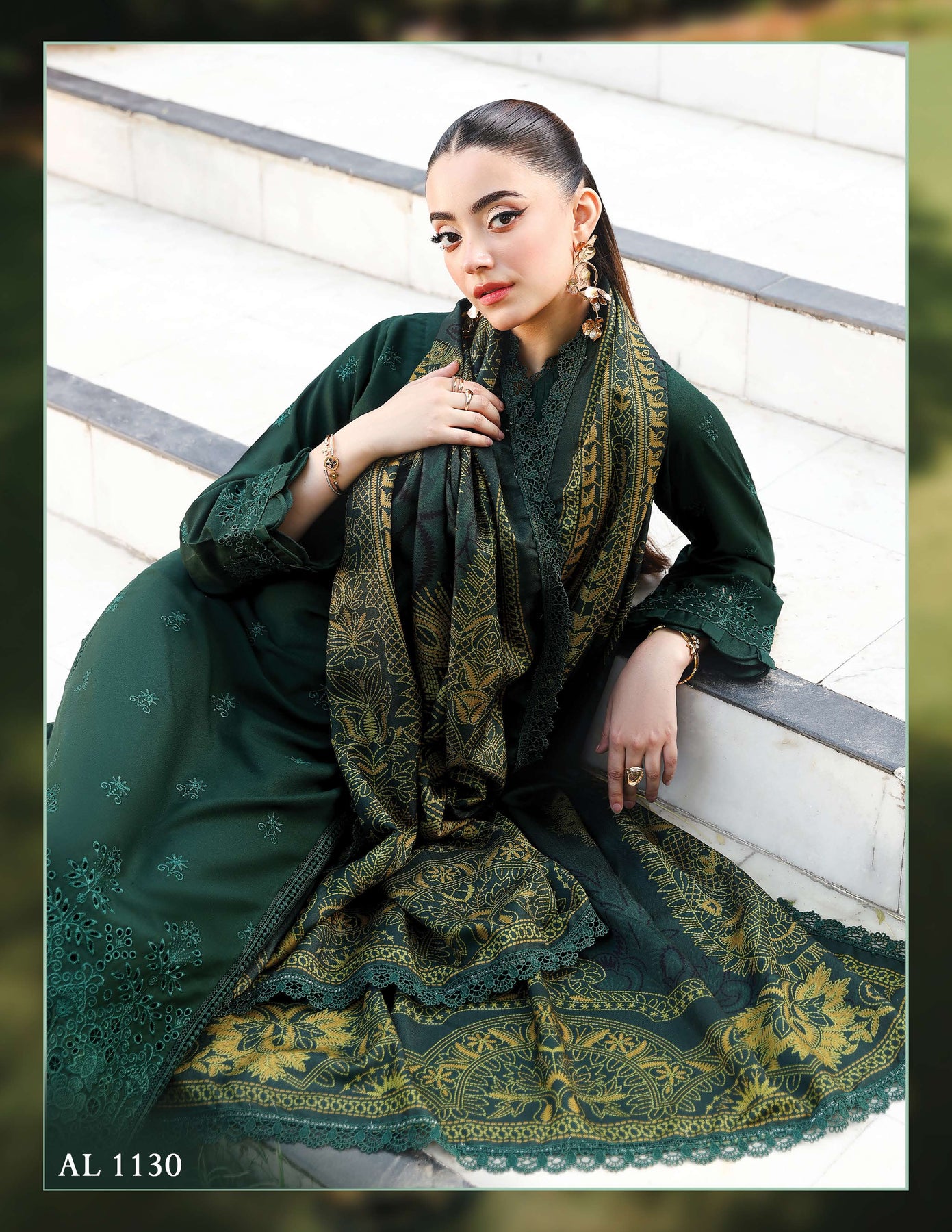The look is elevated with a wool shawl showcasing dual-sided digital printing for a rich, luxurious finish. 🌿 Beautifully embellished with pearls, the shawl adds a regal touch and cozy warmth, making it the highlight of the ensemble. 👑