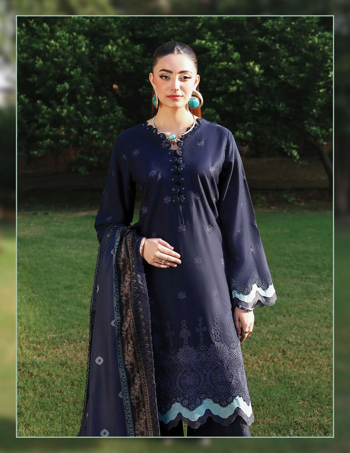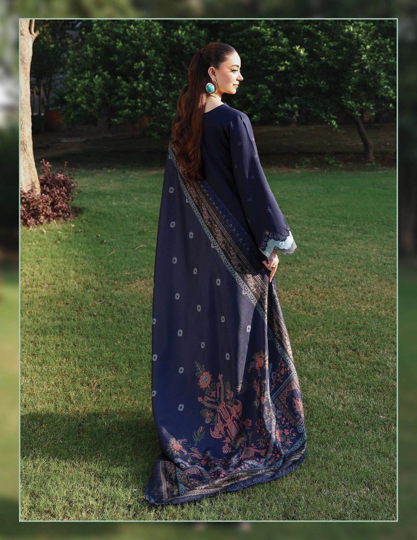 The look is elevated with a wool shawl showcasing dual-sided digital printing for a rich, luxurious finish. 🌿 Beautifully embellished with pearls, the shawl adds a regal touch and cozy warmth, making it the highlight of the ensemble. 👑