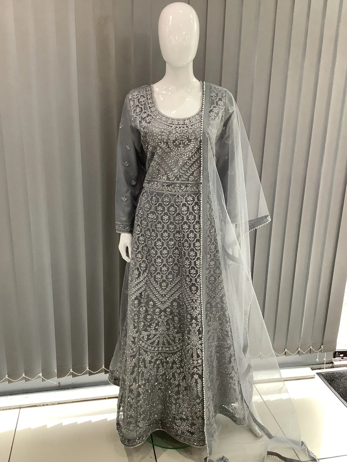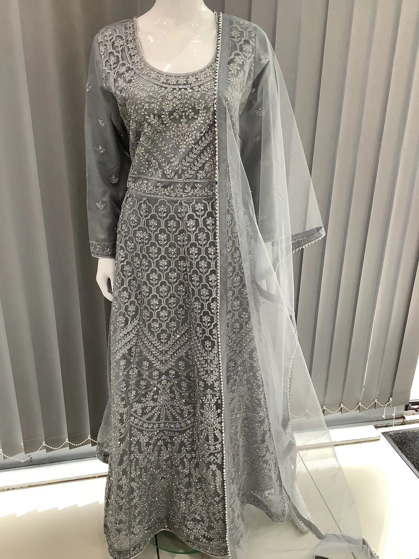 Embroidered Net Kameez with an embroidered Chiffon Dupatta. The kameez includes heavy embroidery with intricate details.
