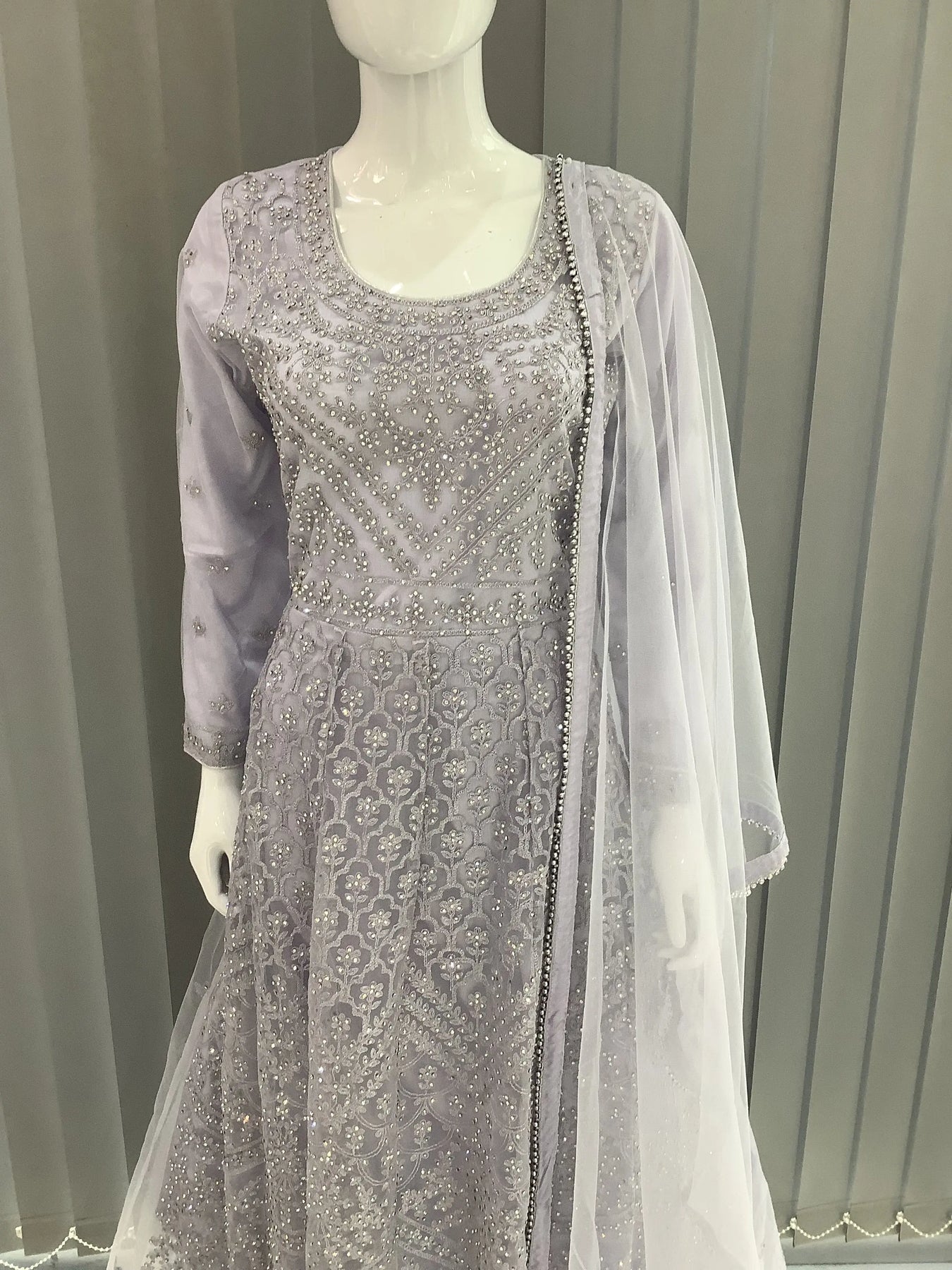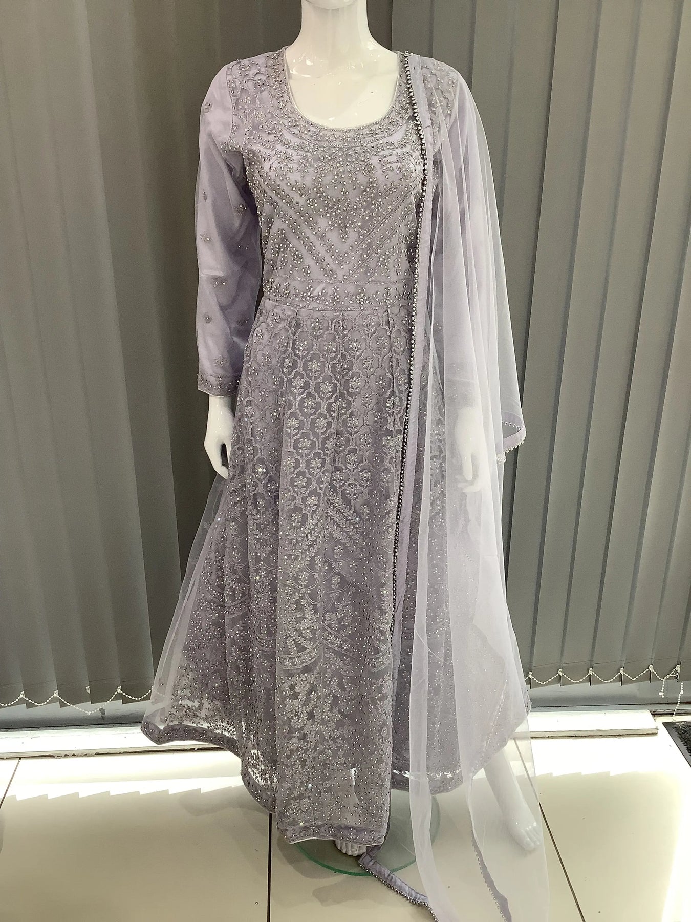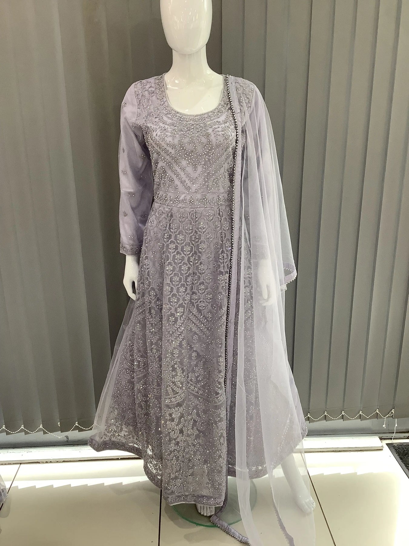 Embroidered Net Kameez with an embroidered Chiffon Dupatta. The kameez includes heavy embroidery with intricate details.