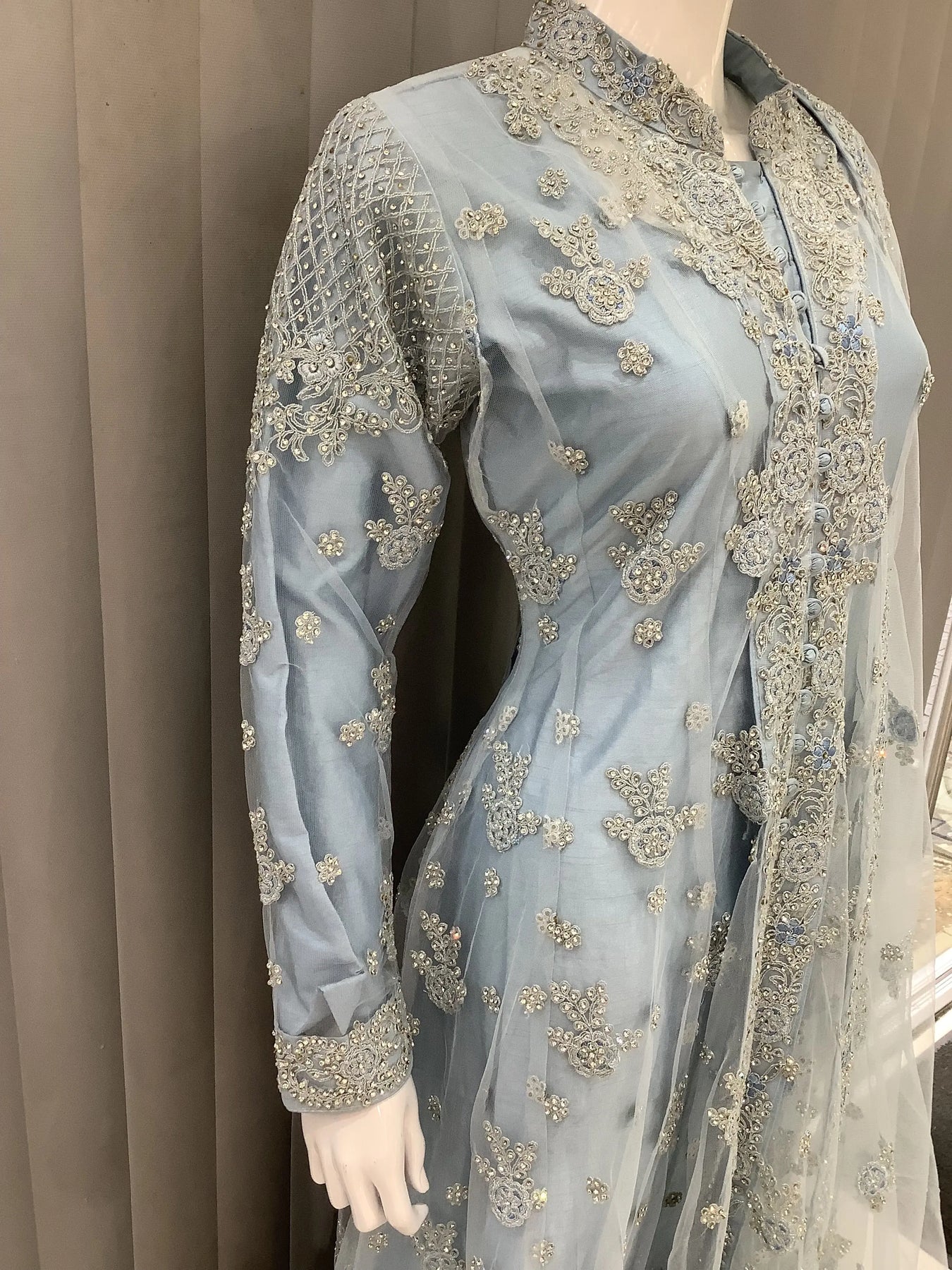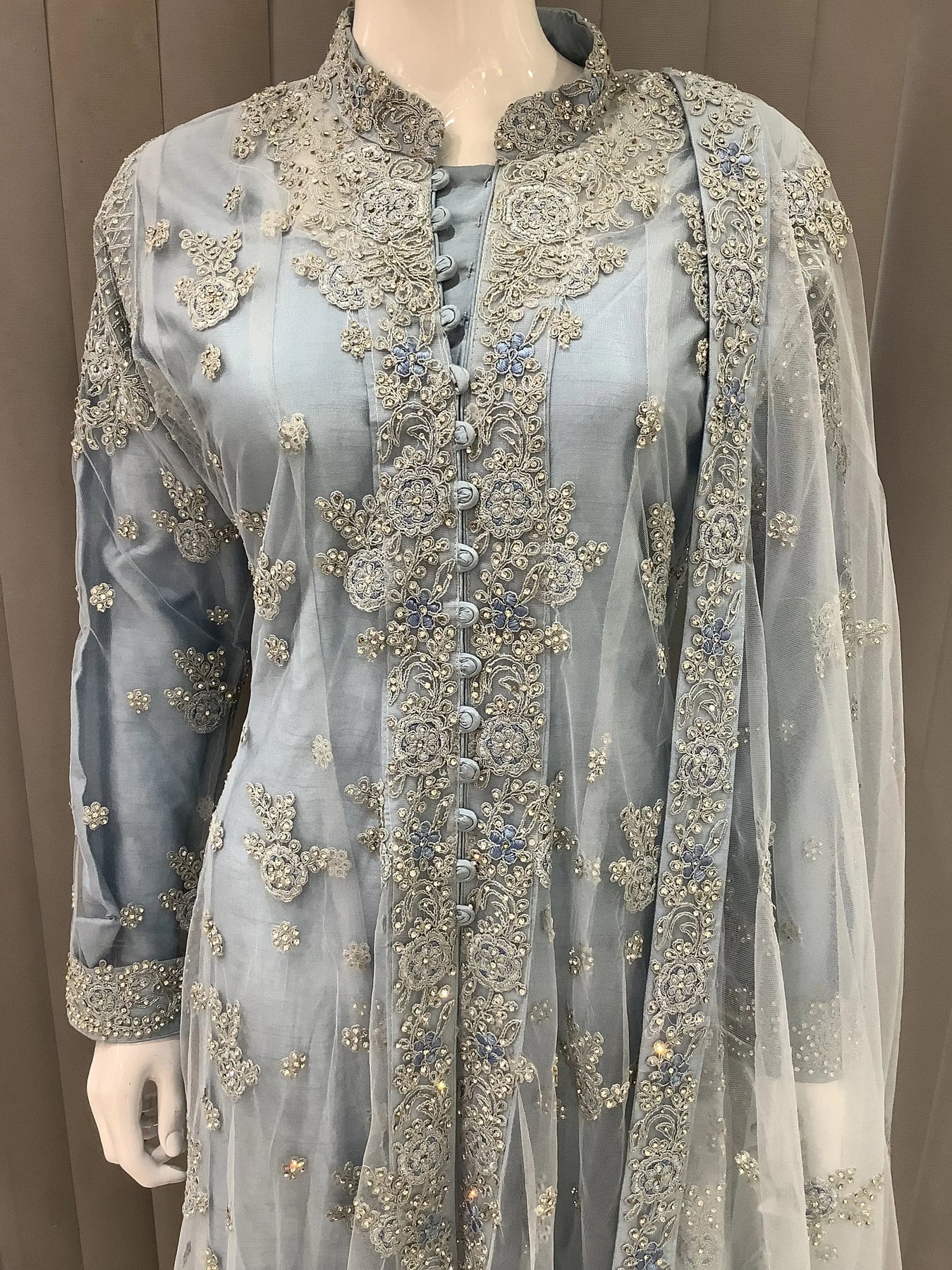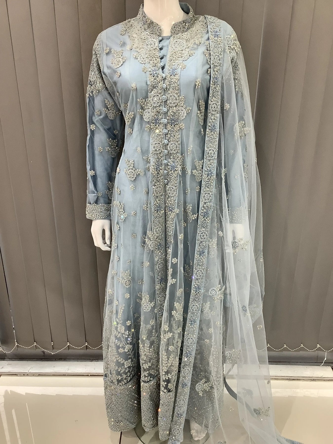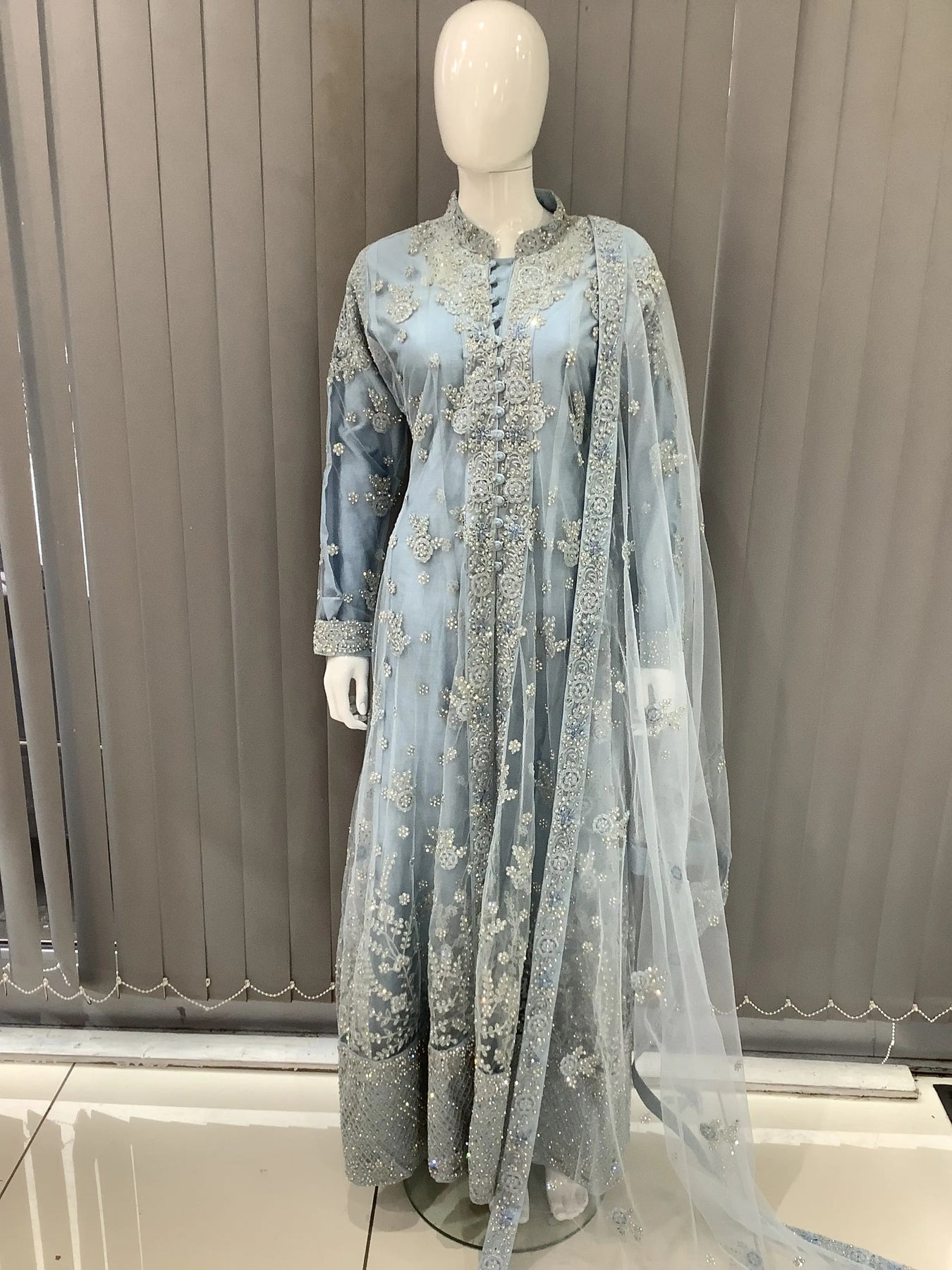 Embroidered Net dress with an embroidered Chiffon Dupatta. The dress includes heavy embroidery with intricate details.