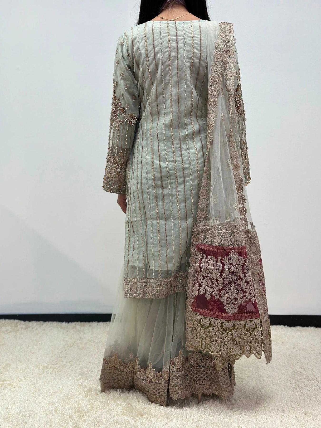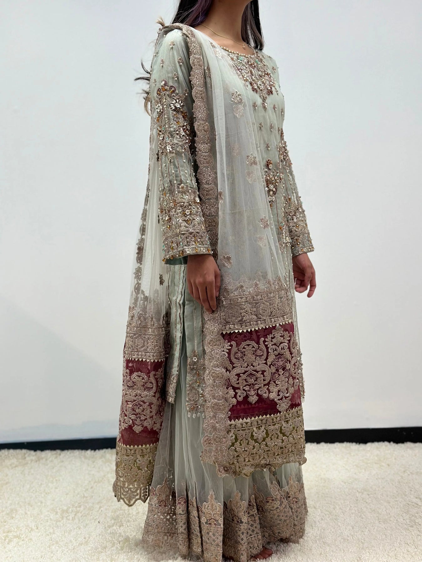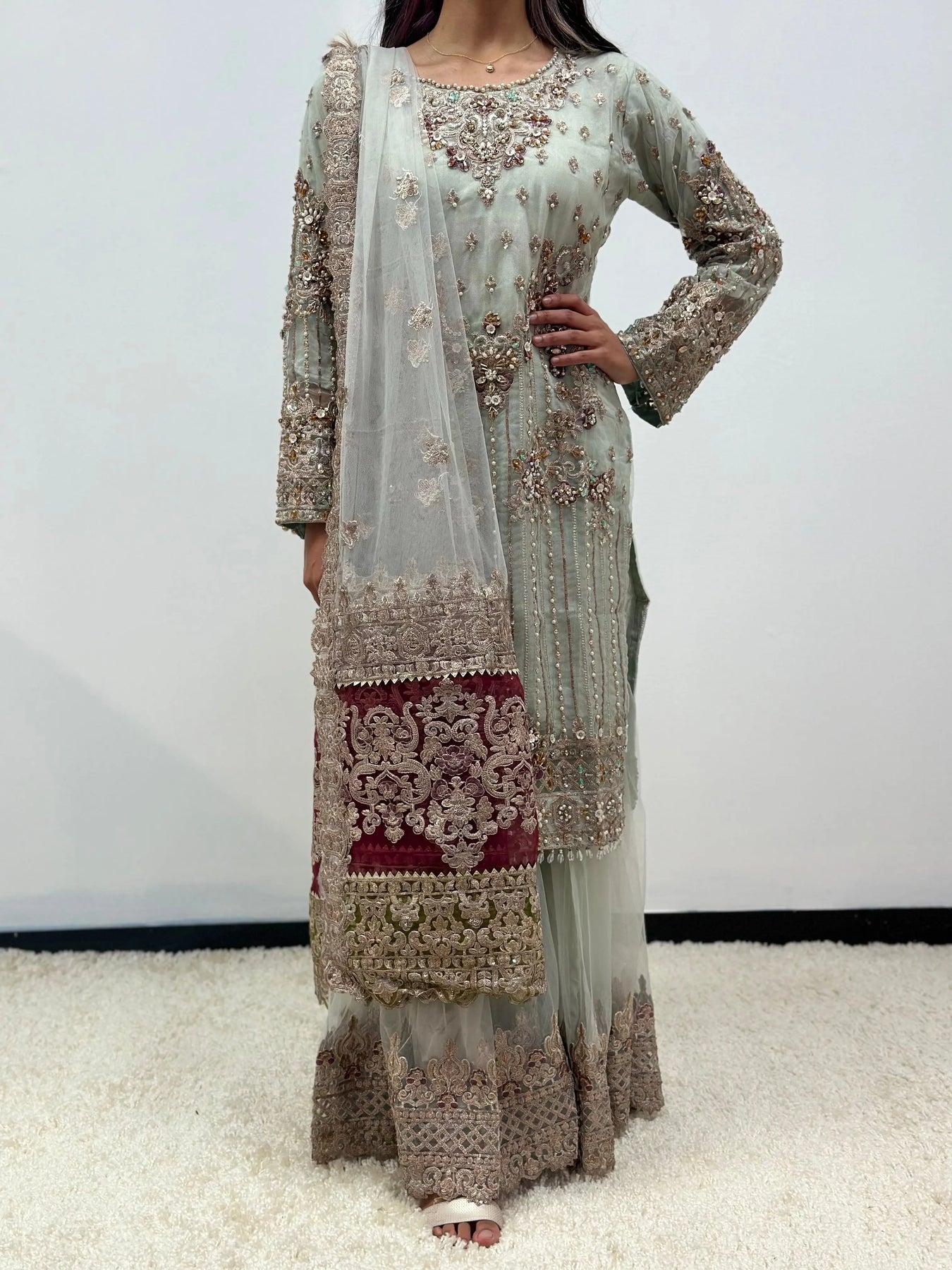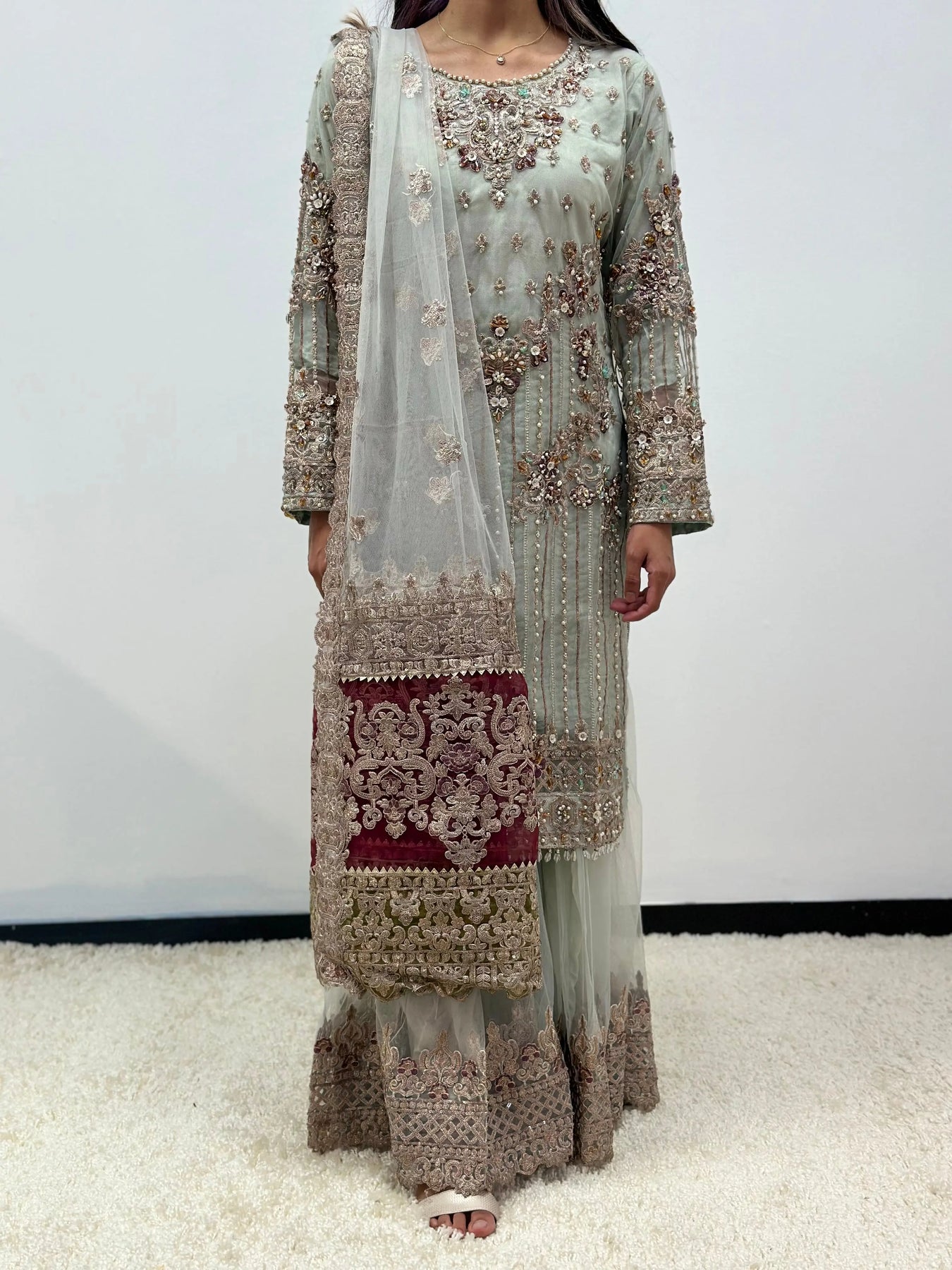 Hand Embroidered items are delicate in nature and can break of beading can become displaced. There is also a possibility in embroidery designs and prints which is unavoidable. By placing an order on our website you agree and accept the possibility of variation in comparison to the advertised images displayed on the website. We make every effort to minimise variations.