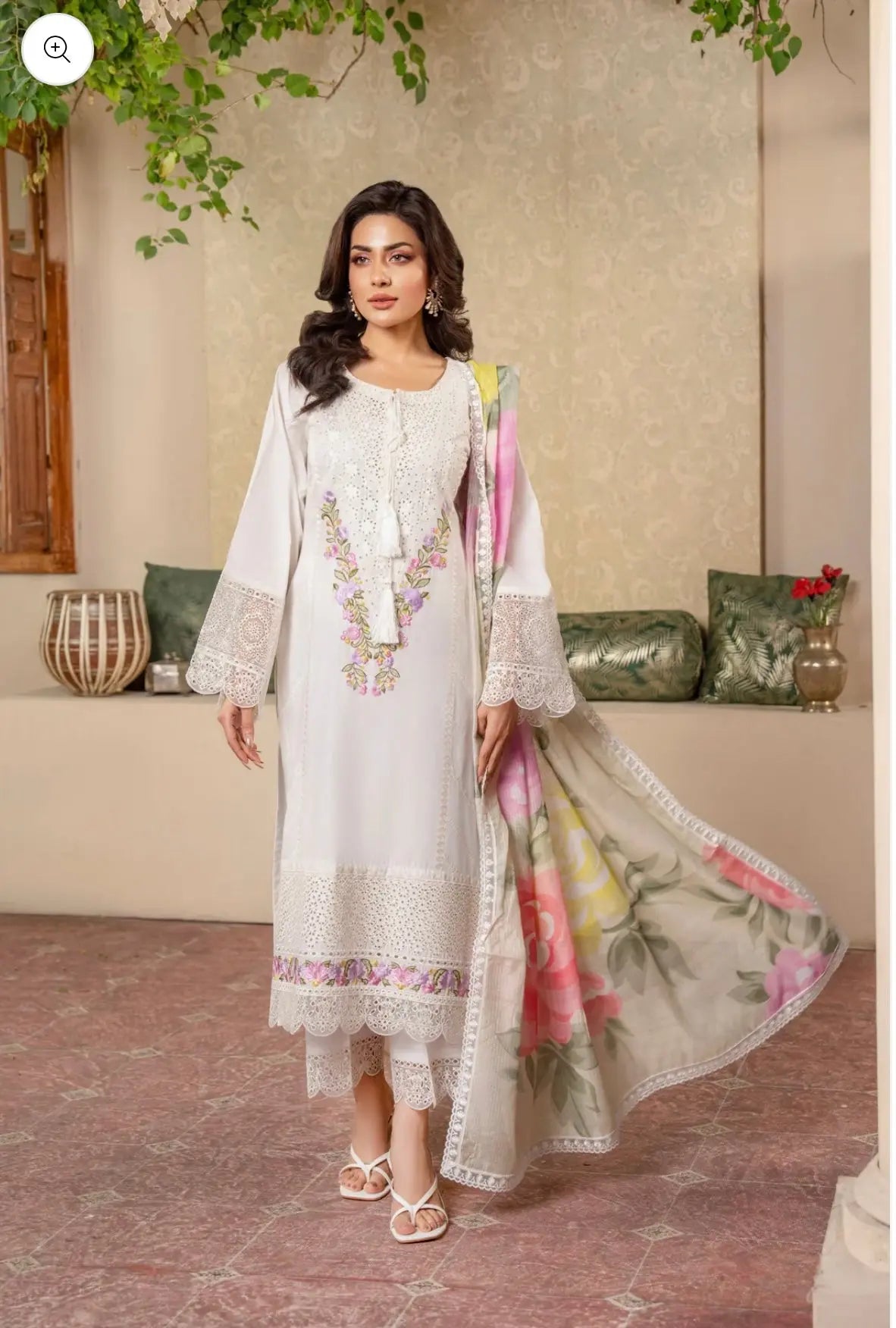 Brighten up your wardrobe with this stunning cotton dress, a perfect blend of elegance and comfort. Featuring intricate embroidery and delicate cutwork on the neckline and hem, this outfit exudes sophistication. The floral motifs and tassel detailing add a graceful charm, making it ideal for festive gatherings and casual outings.