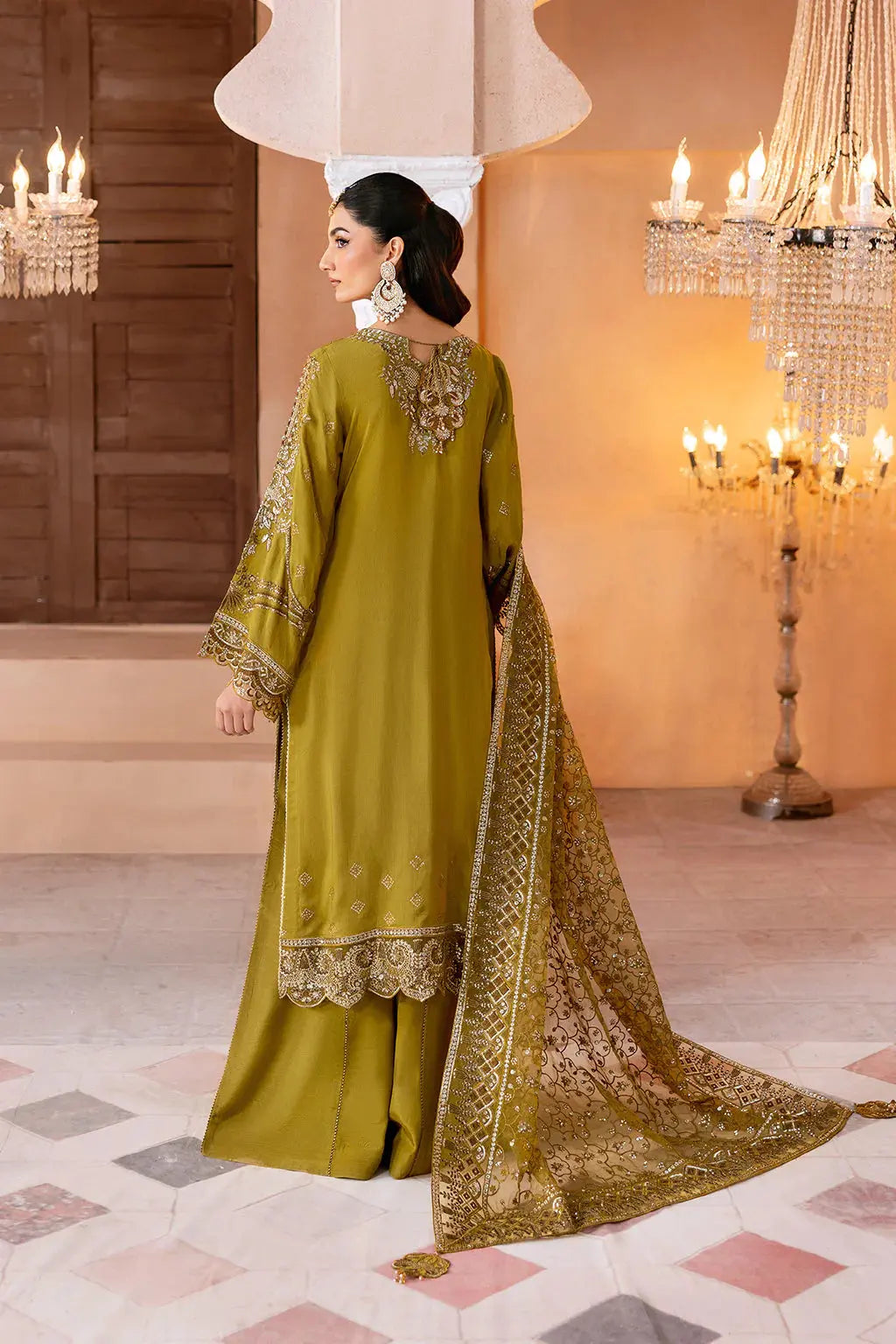 Featuring a sequined embroidered raw silk front, an embroidered raw silk back, and chiffon sleeves adorned with intricate lace. The organza lace detailing on the daman adds a touch of sophistication, while the embroidered organza dupatta completes the look with graceful charm. This ensemble is the epitome of timeless beauty and luxury.
