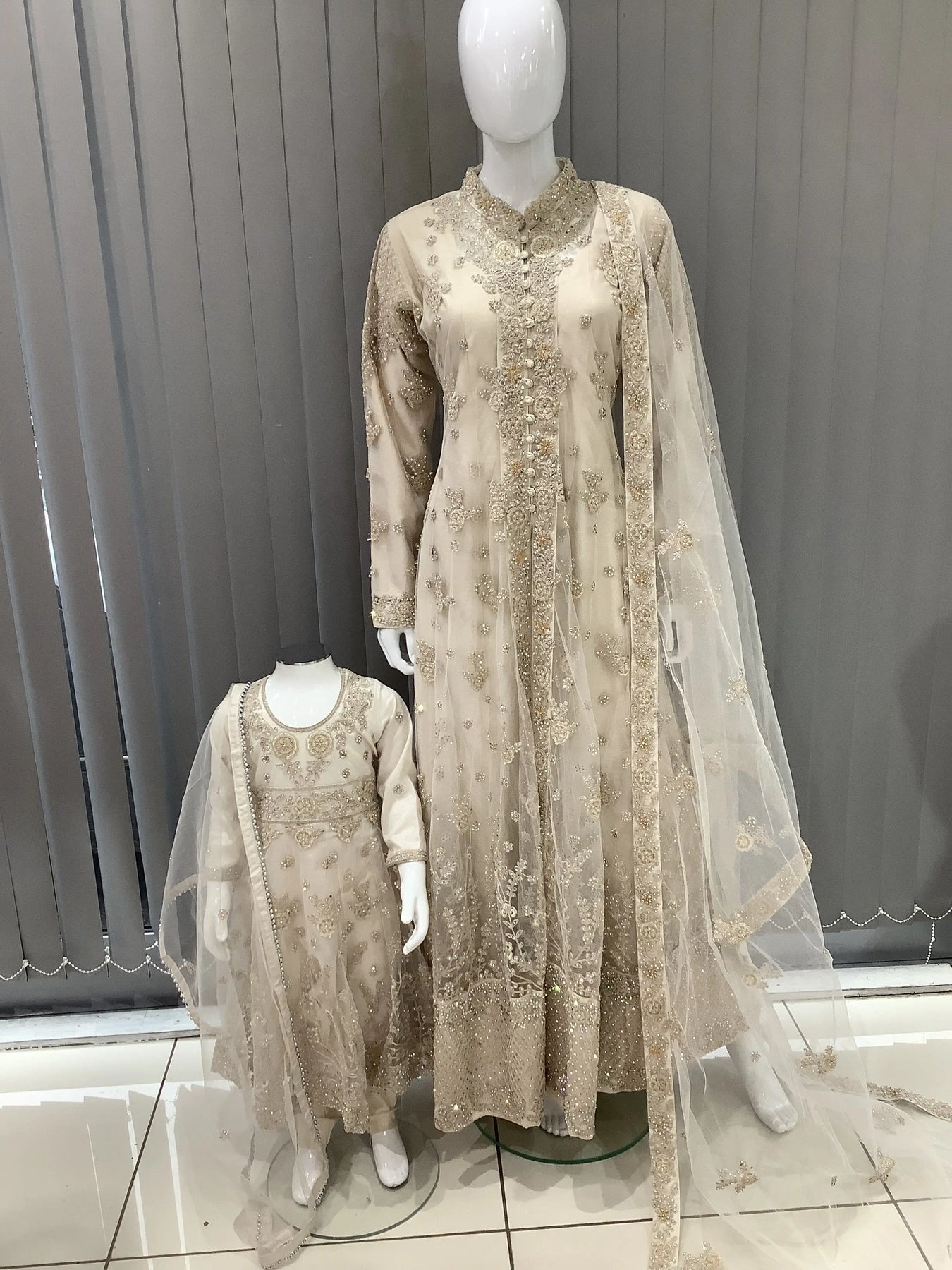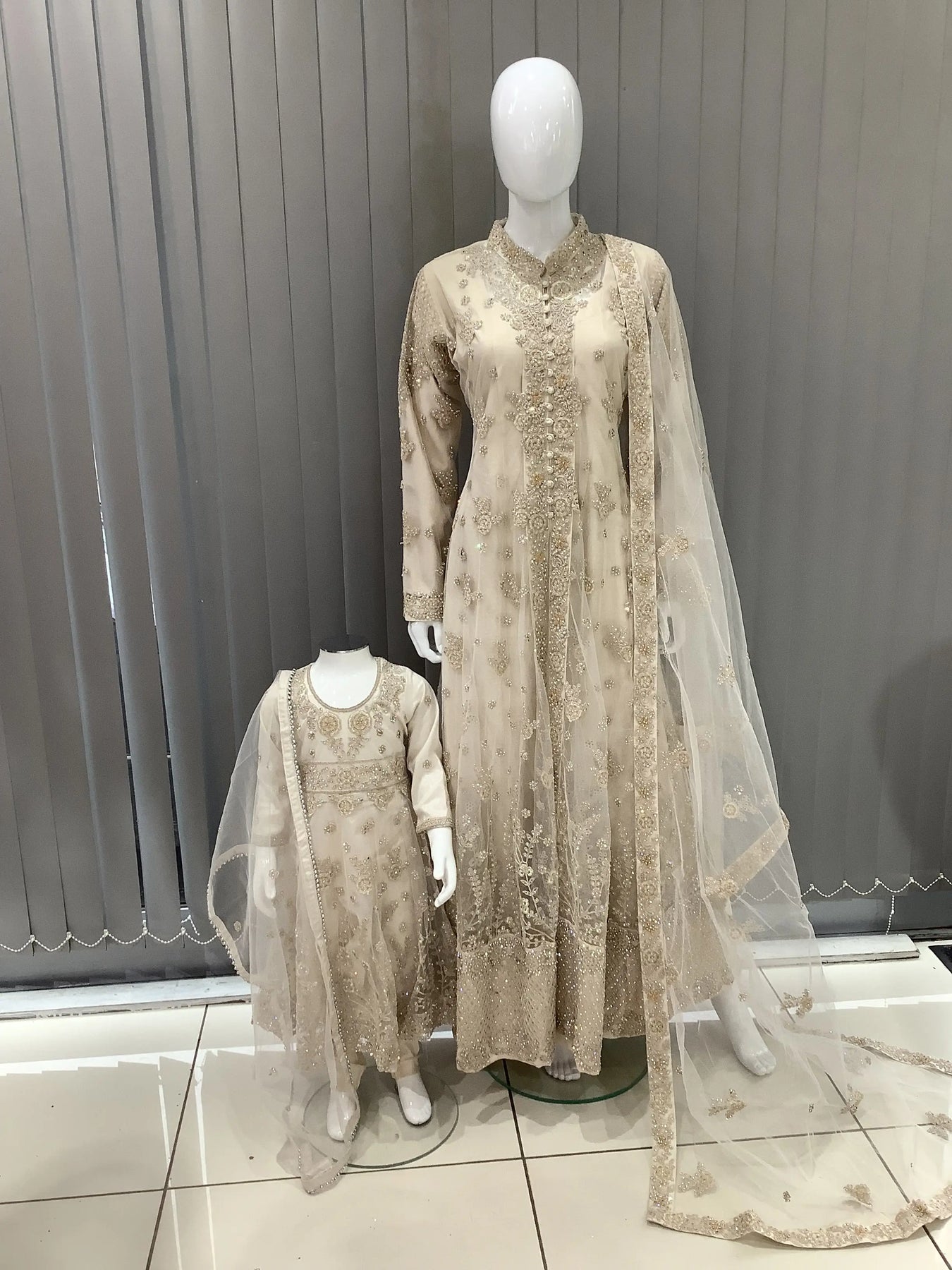 ASHA | Embroidered Net Mother & Daughter Ready To Wear Cream| AS75