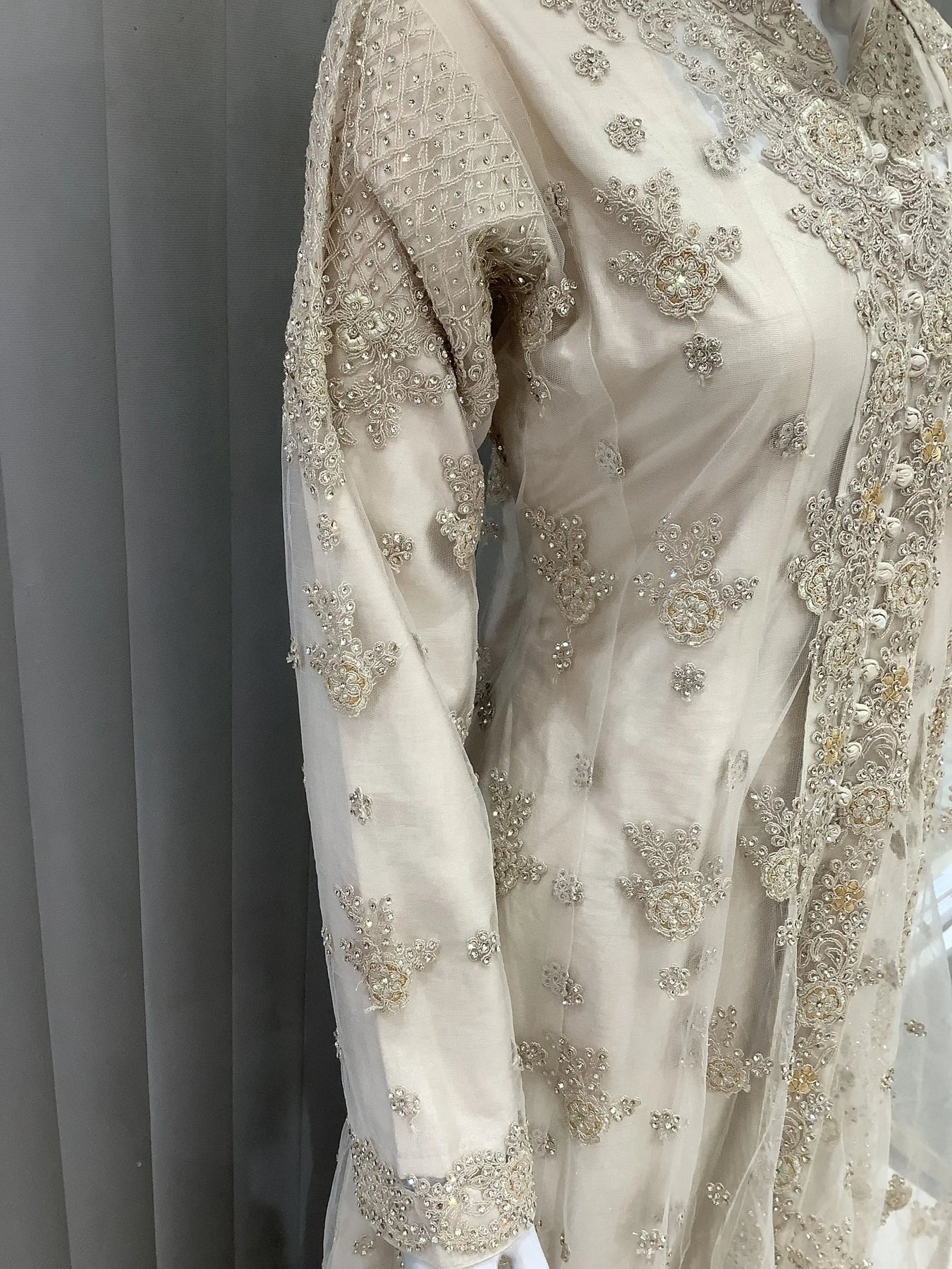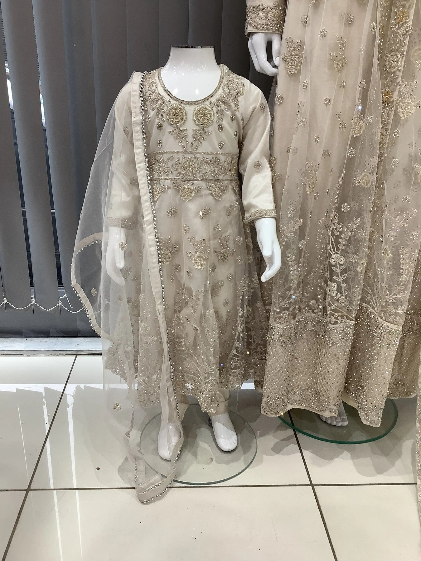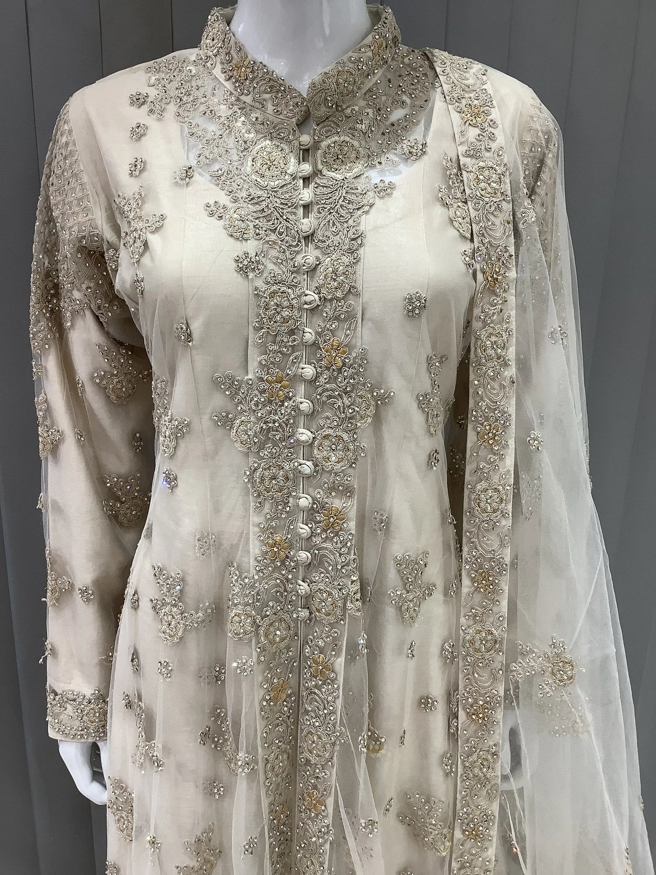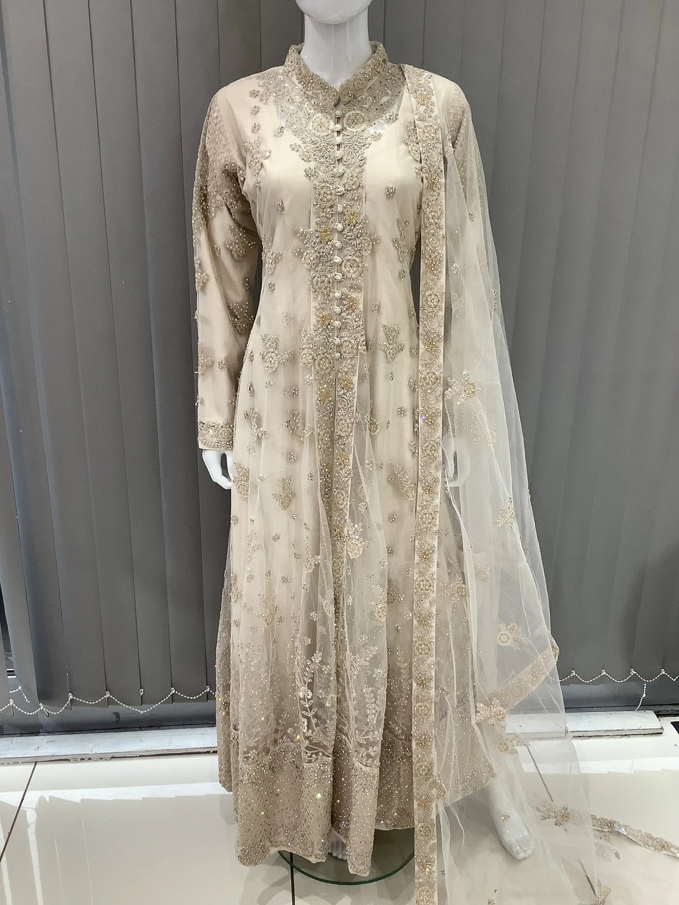 Embroidered Net dress with an embroidered Chiffon Dupatta. The dress includes heavy embroidery with intricate details.
