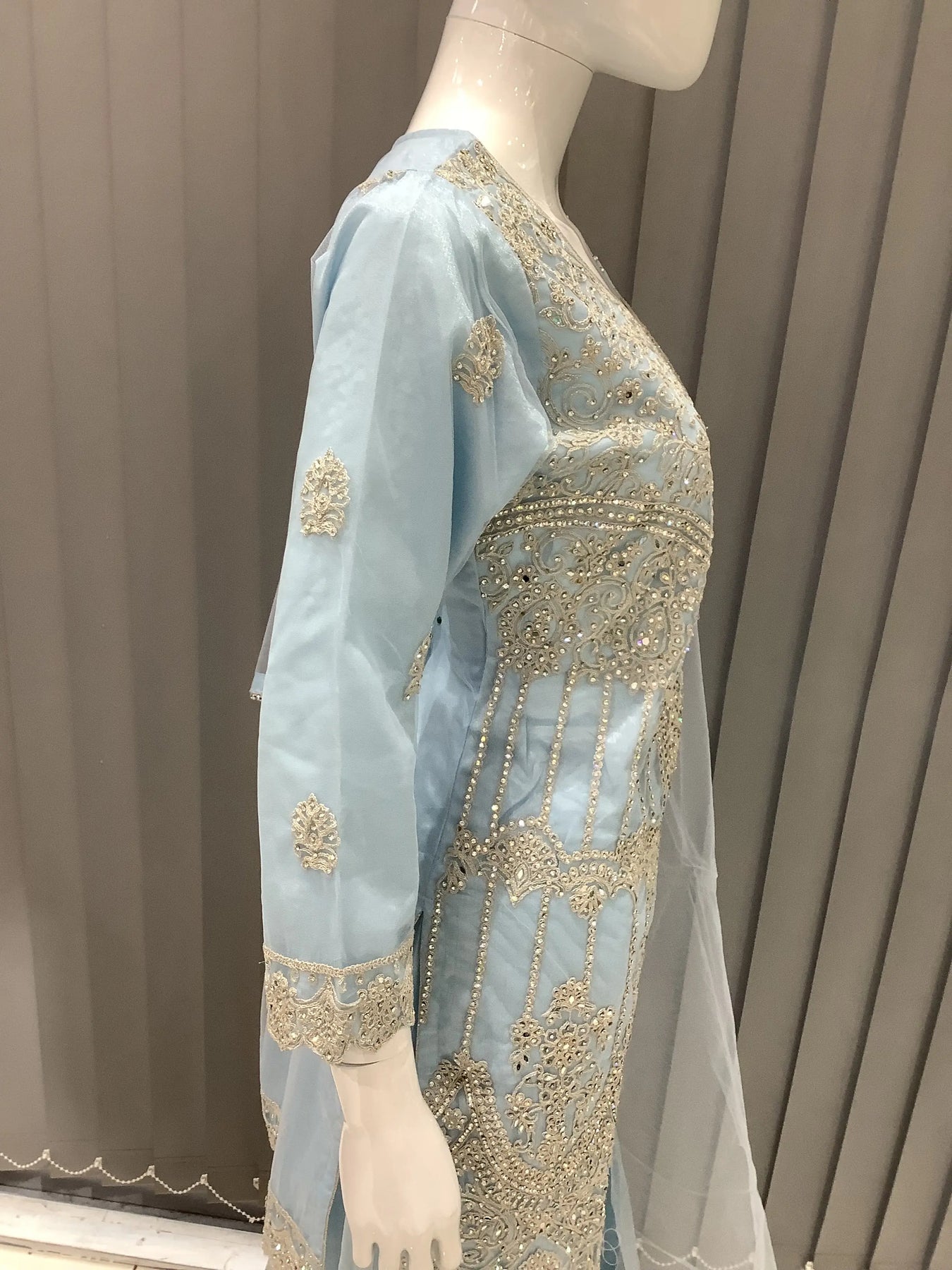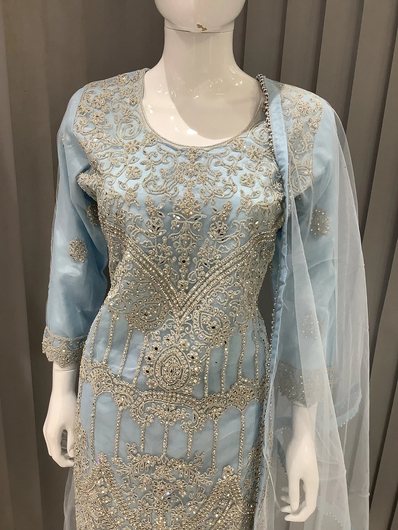 Embroidered Net dress with an embroidered Chiffon Dupatta. The dress includes heavy embroidery with intricate details.