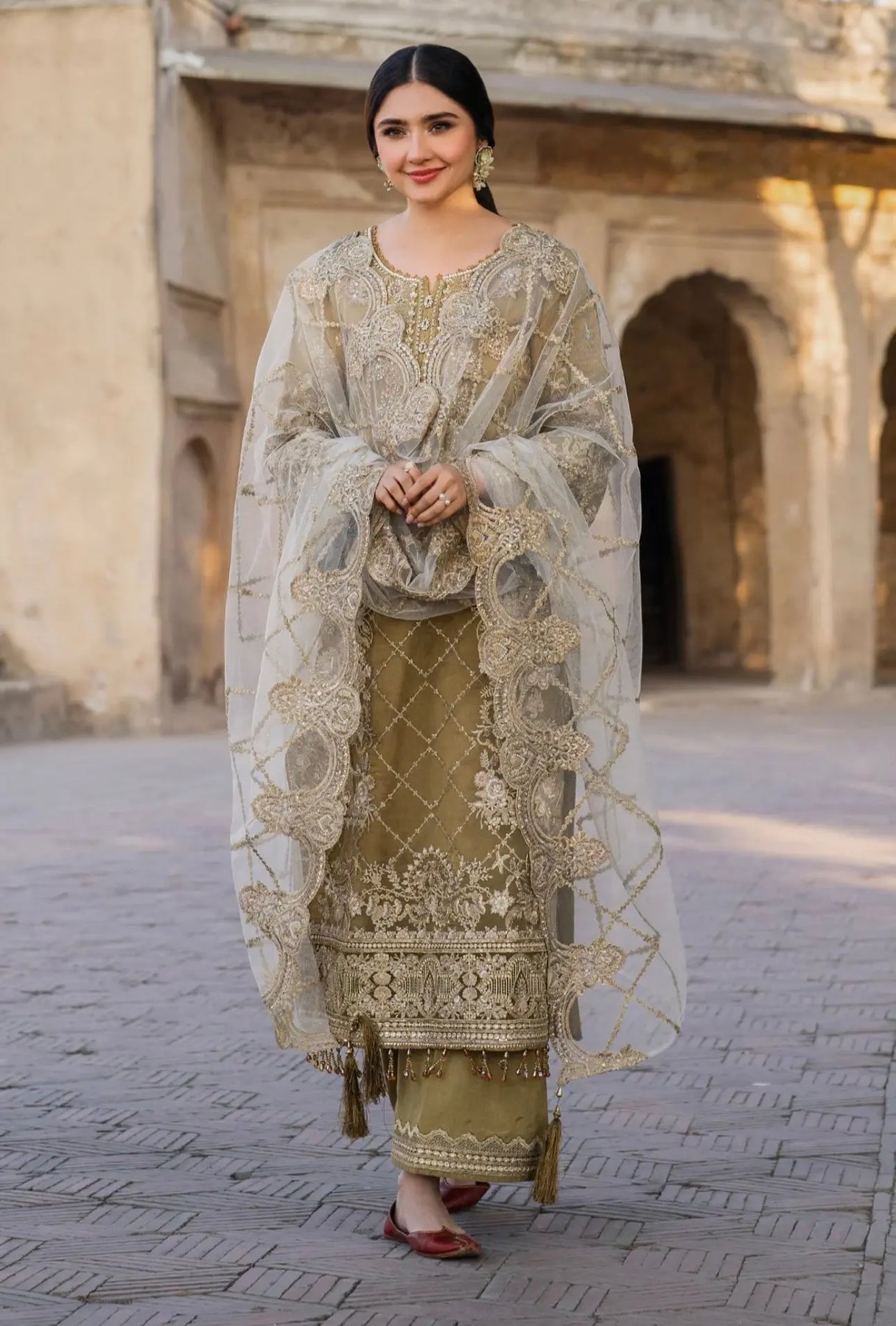 The outfit features a delicate organza front with self-embroidery and a scalloped lace hem, complemented by intricate lace and embroiderydetails on the sleeves. Paired with mustard raw silktrousers and an embroidered net dupatta with lacedetailing, this refined ensemble is perfect for Eid andfestive occasions.