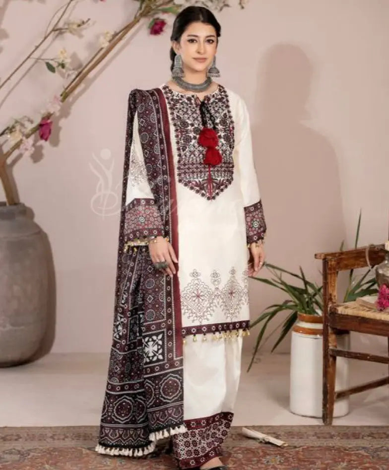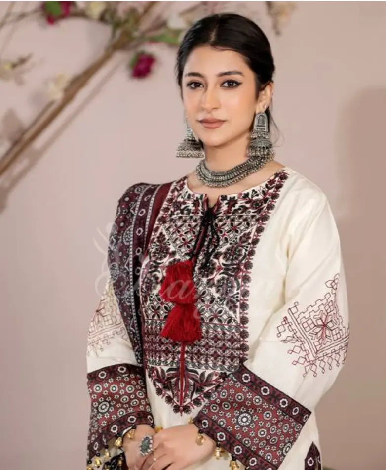 Brighten up your wardrobe with this stunning cotton dress, a perfect blend of elegance and comfort. Featuring intricate embroidery and delicate cutwork on the neckline and hem, this outfit exudes sophistication. The floral motifs and tassel detailing add a graceful charm, making it ideal for festive gatherings and casual outings.