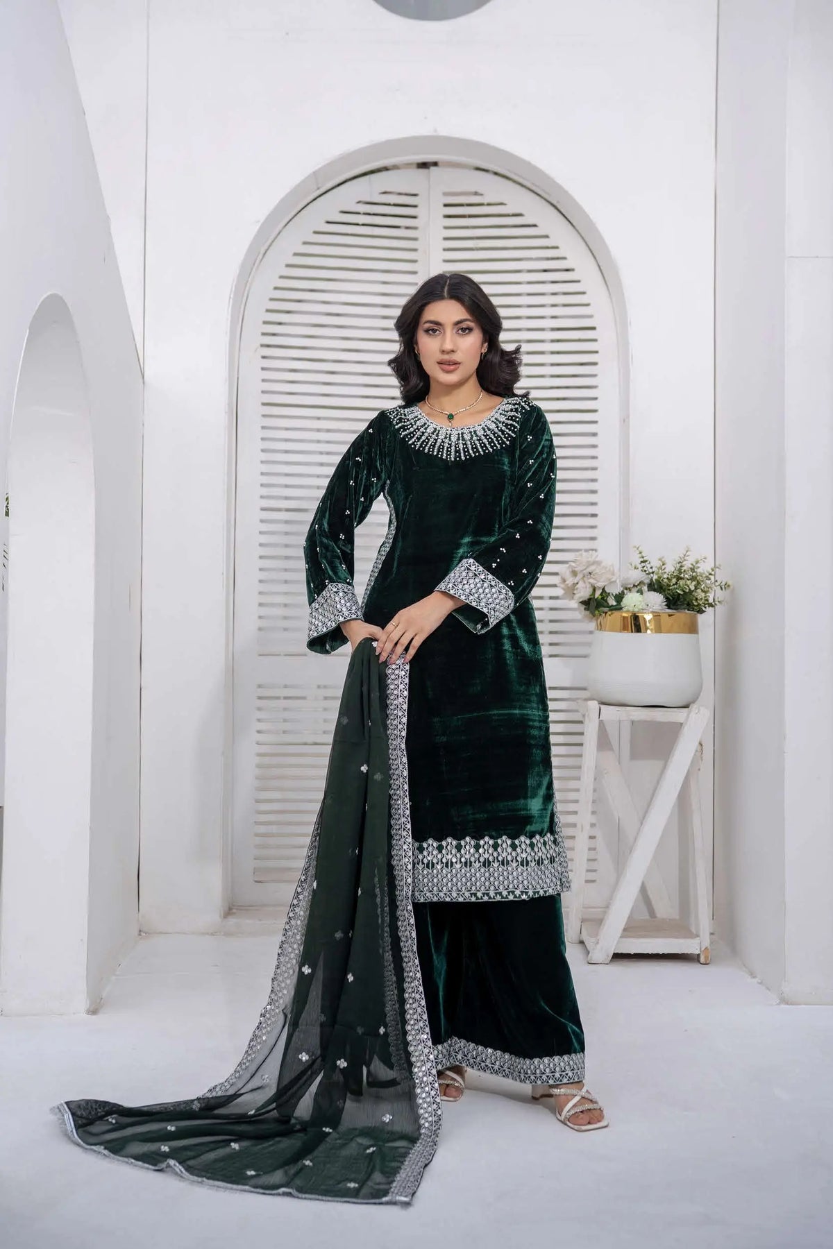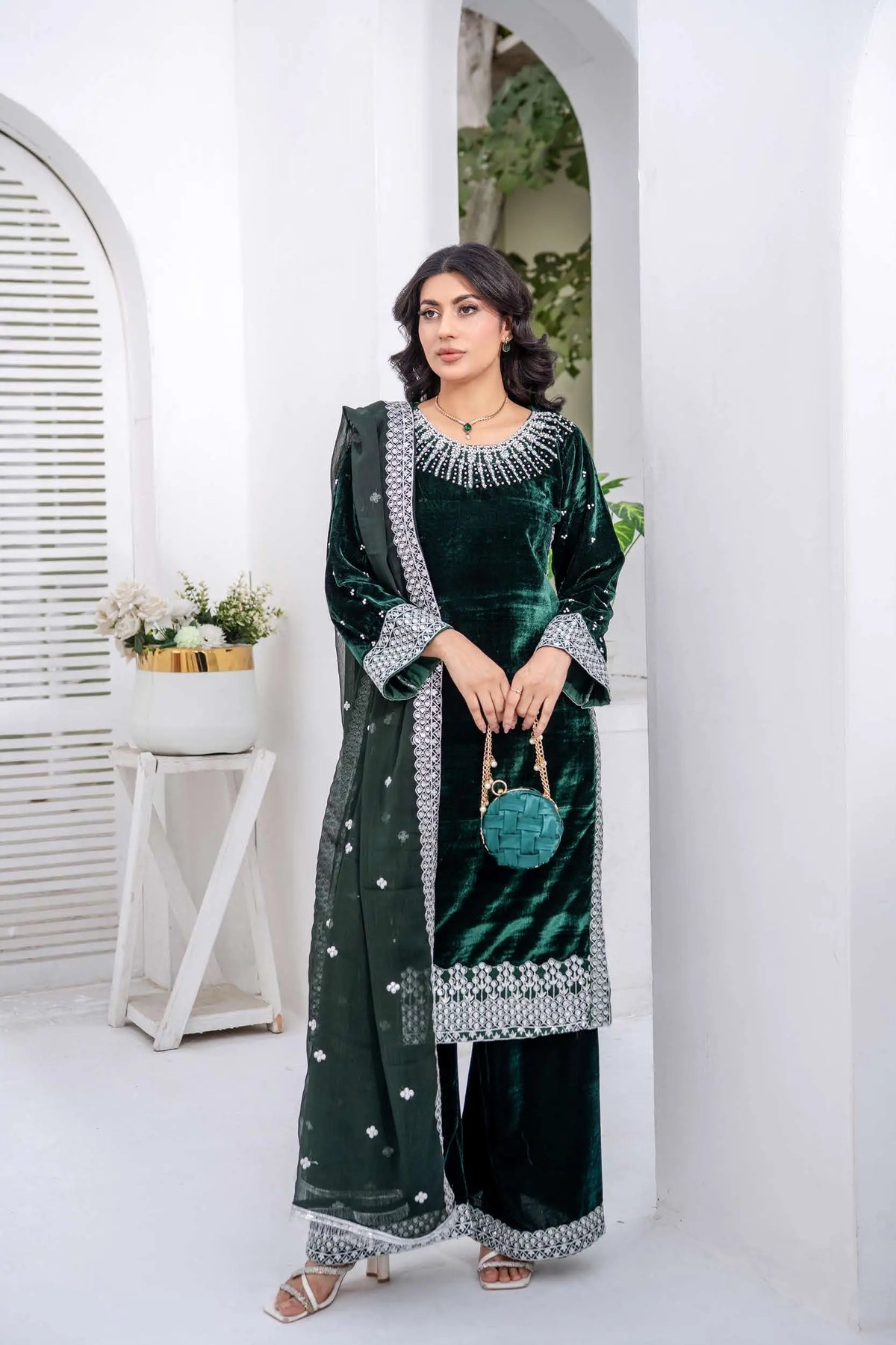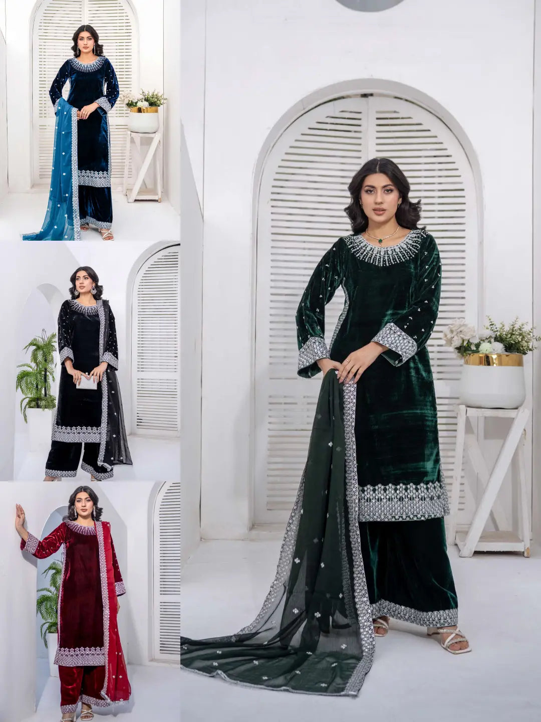 Step into elegance this season with our embroidered velvet masterpiece🪡, crafted for those who love timeless Pakistani fashion 💚. The rich velvet fabric gives a royal touch 👑, while the delicate chiffon dupatta adds a flowy, graceful charm 🌸.