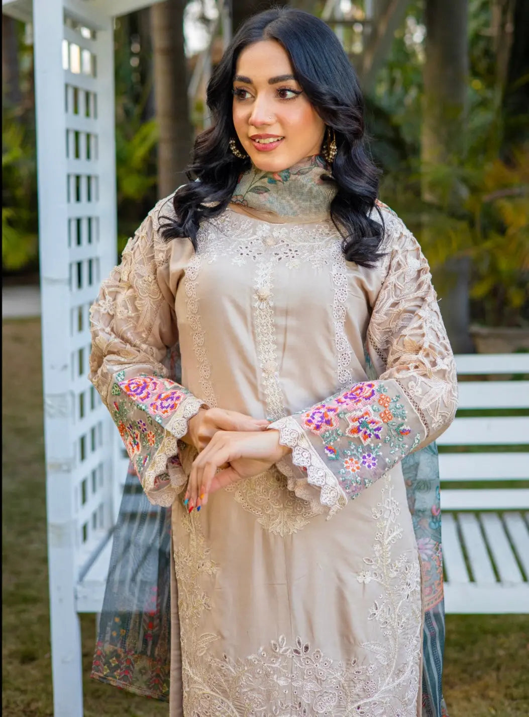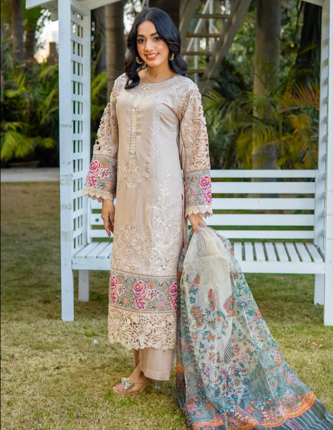 🌿 Paired with a flowing khaddi net dupatta that adds a graceful, airy finish to your look.