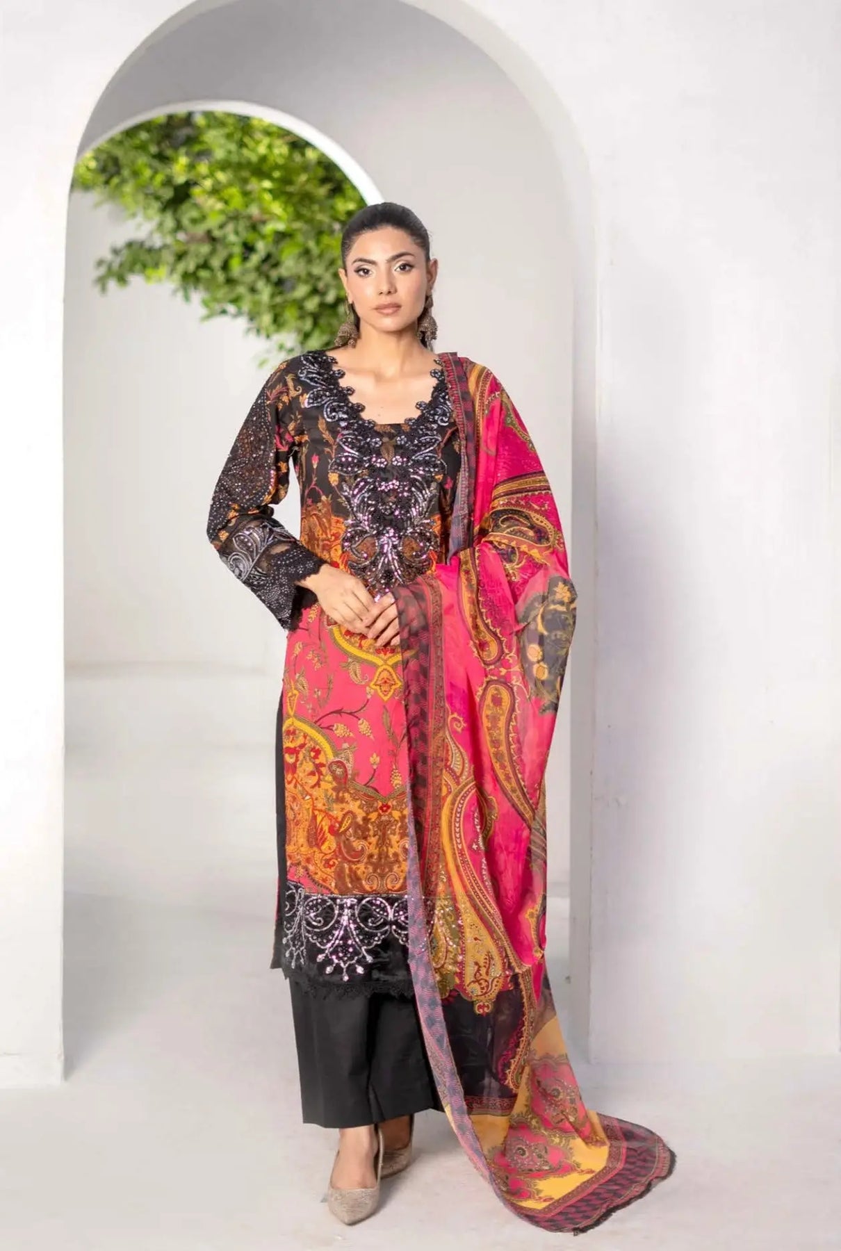 This exquisite set combines the timeless charm of embroidered linen 🌿 with the regal allure of a Banarasi dupatta👑. The soft, breathable linen fabric ensures comfort all day long, while the intricate embroidery 🌸 adds a touch of sophistication. The luxurious dupatta with its rich patterns and shimmering gold or silver threads ✨ elevates the entire ensemble, making it perfect for festive occasions 🎉 or evening affairs 🌙.