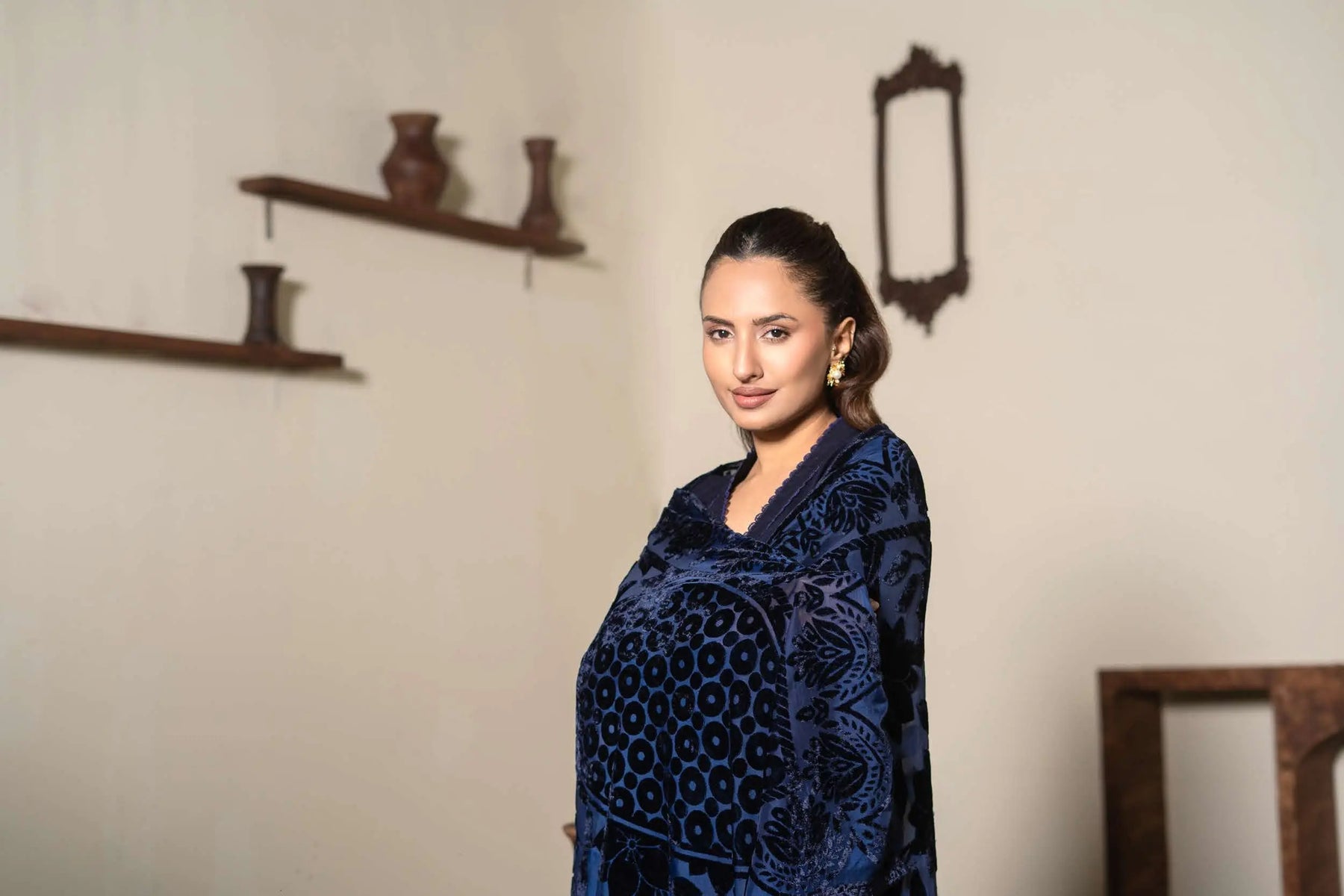 The highlight of the outfit — a Palachi (velvet) shawl, adding depth, luxury, and a royal finish to your winter look. The soft sheen and plush texture make it a must-have statement piece for the season. 👑✨