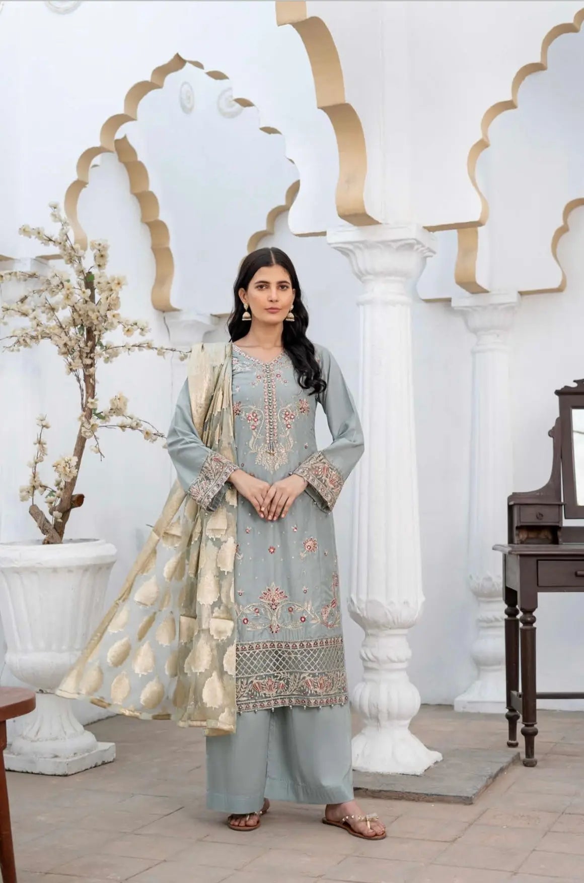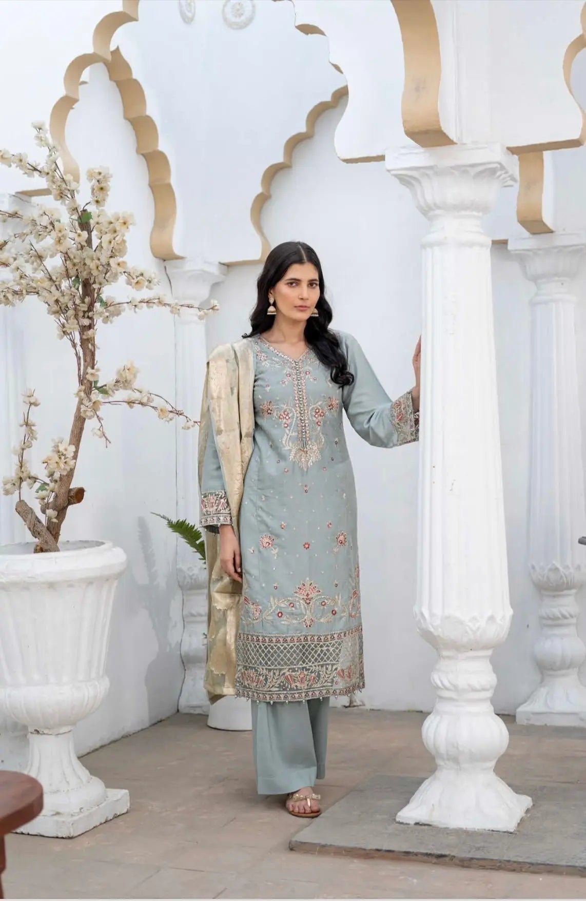 This exquisite set combines the timeless charm of embroidered linen 🌿 with the regal allure of a Banarasi dupatta👑. The soft, breathable linen fabric ensures comfort all day long, while the intricate embroidery 🌸 adds a touch of sophistication. The luxurious Banarasi dupatta with its rich patterns and shimmering gold or silver threads ✨ elevates the entire ensemble, making it perfect for festive occasions 🎉 or evening affairs 🌙.