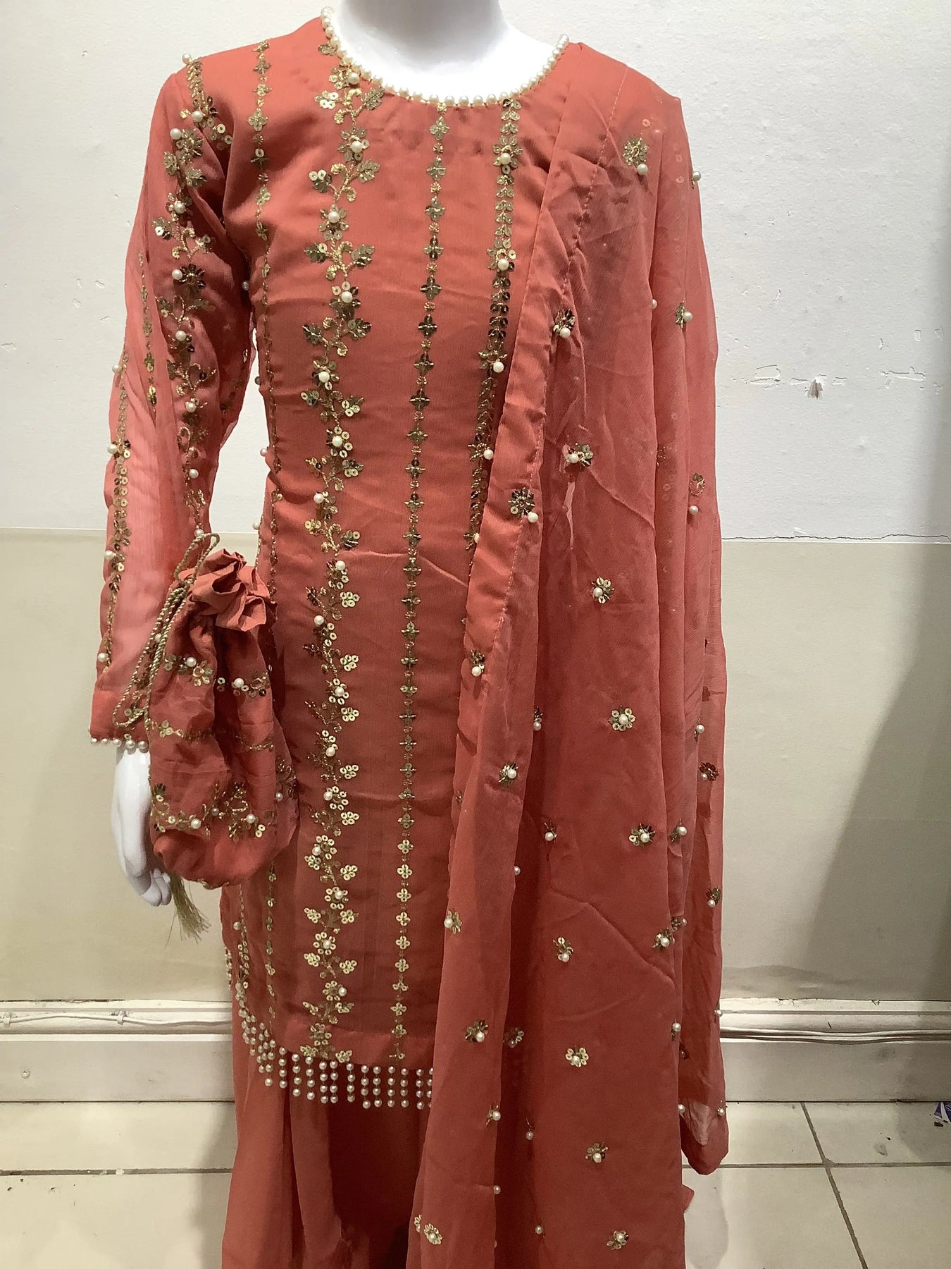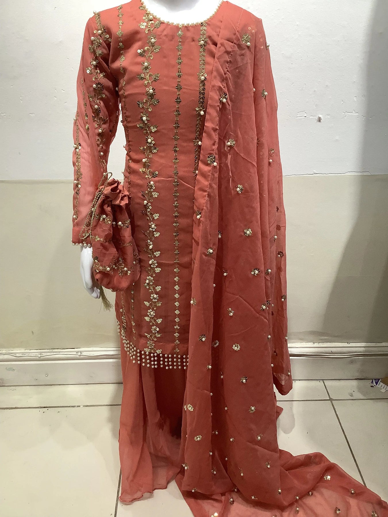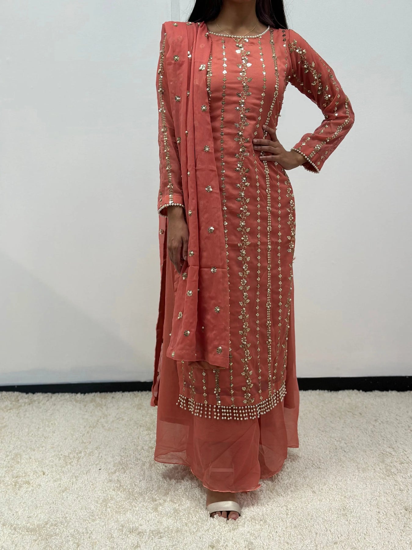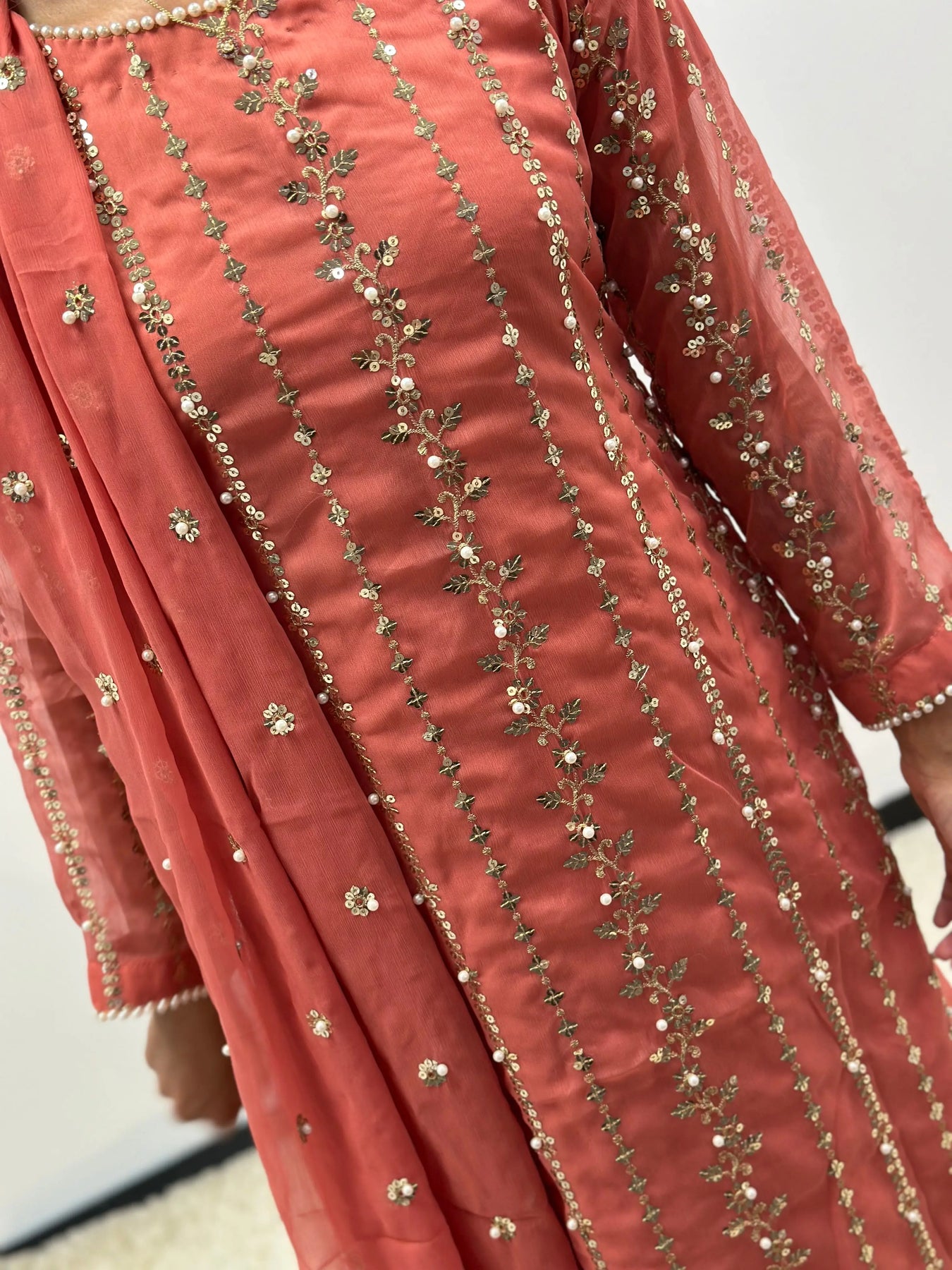 Stunning chiffon outfit with pearl embellishments