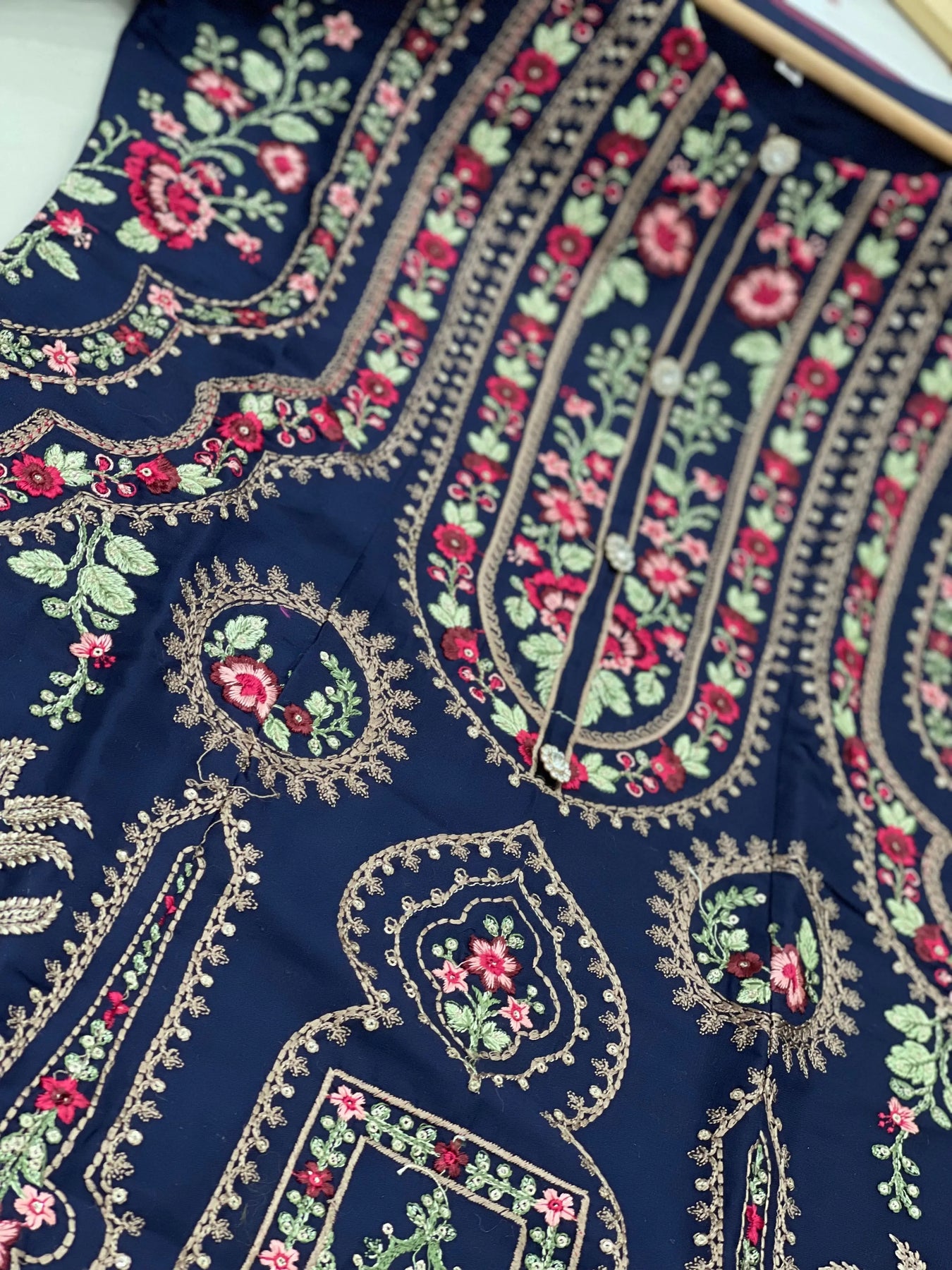 Hand Embroidered items are delicate in nature and can break of beading can become displaced. There is also a possibility in embroidery designs and prints which is unavoidable. By placing an order on our website you agree and accept the possibility of variation in comparison to the advertised images displayed on the website. We make every effort to minimise variations.