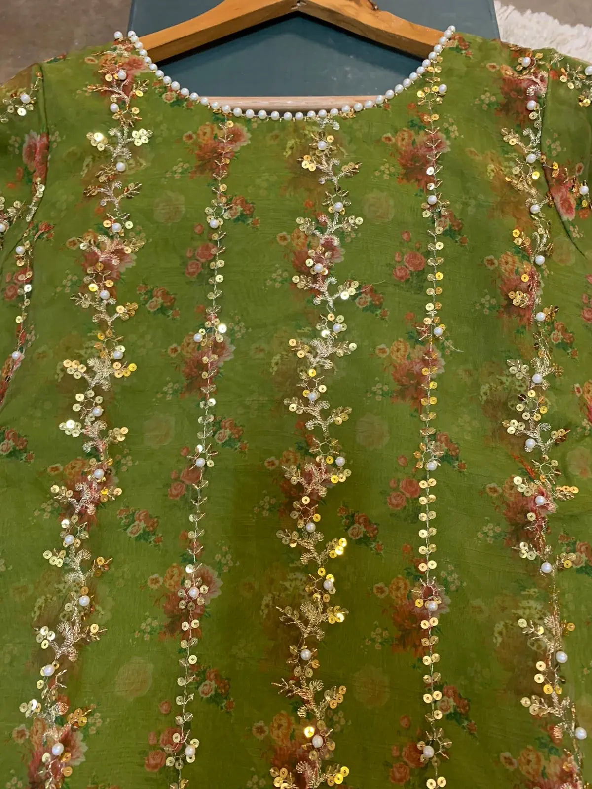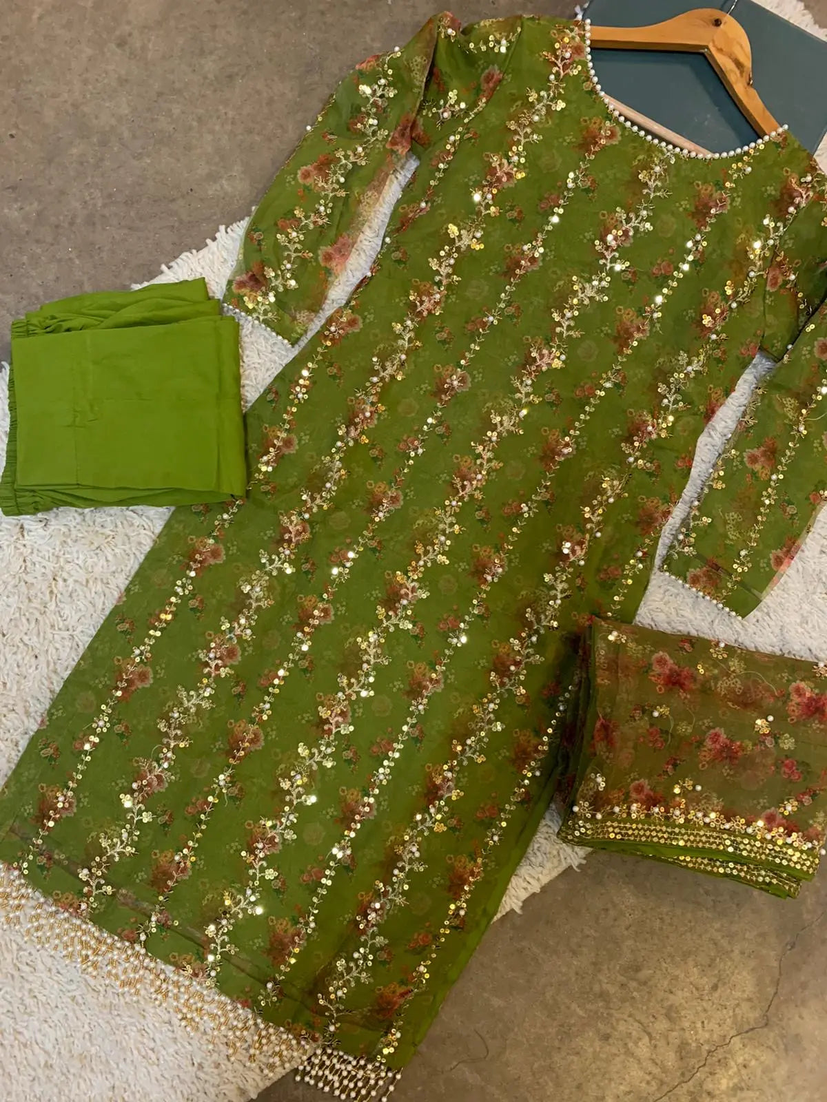 Stunning heavily embroidery organza kameez with work all along the kameez (Long) and pearls. This comes with a stunning embroidered organza dupatta to match