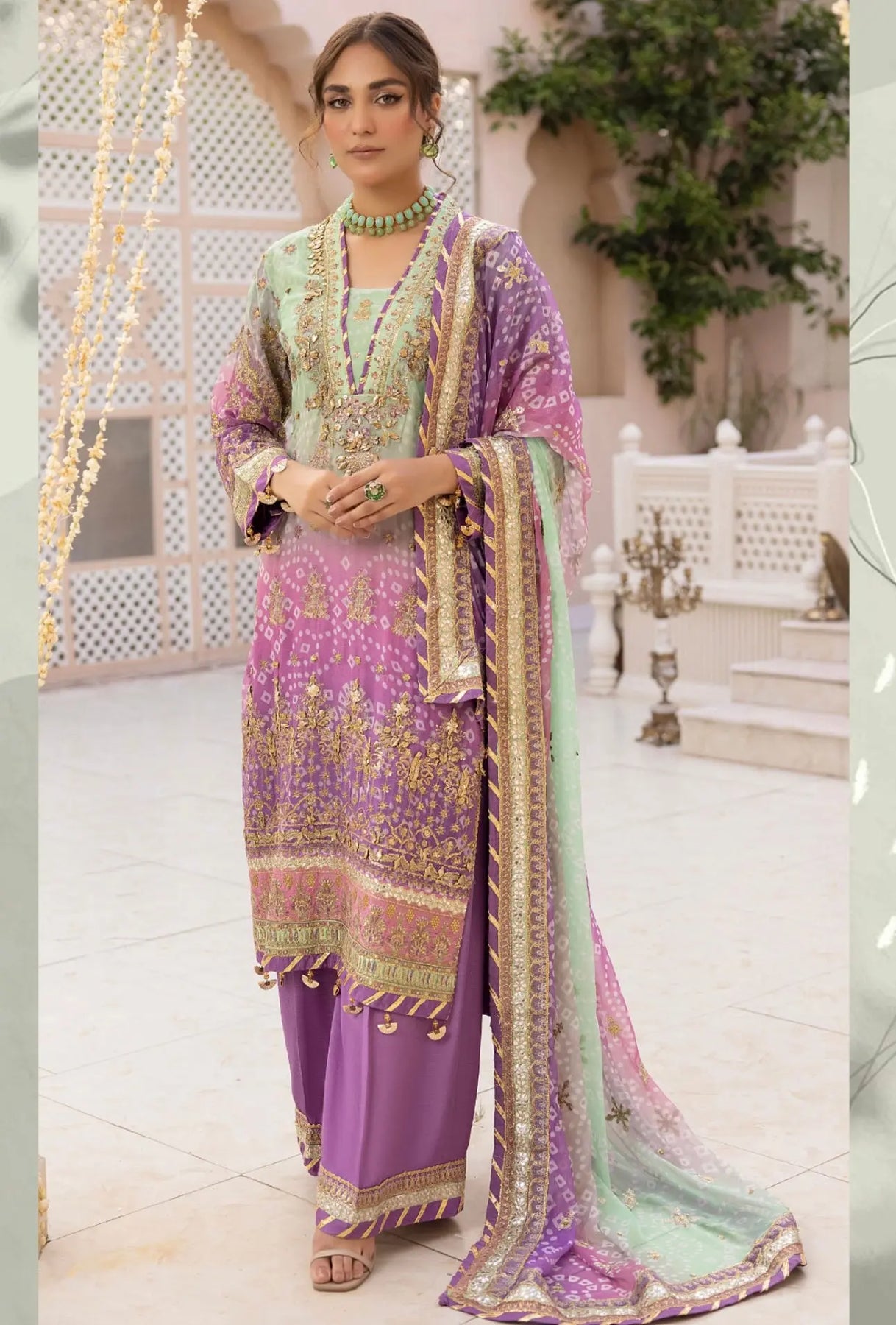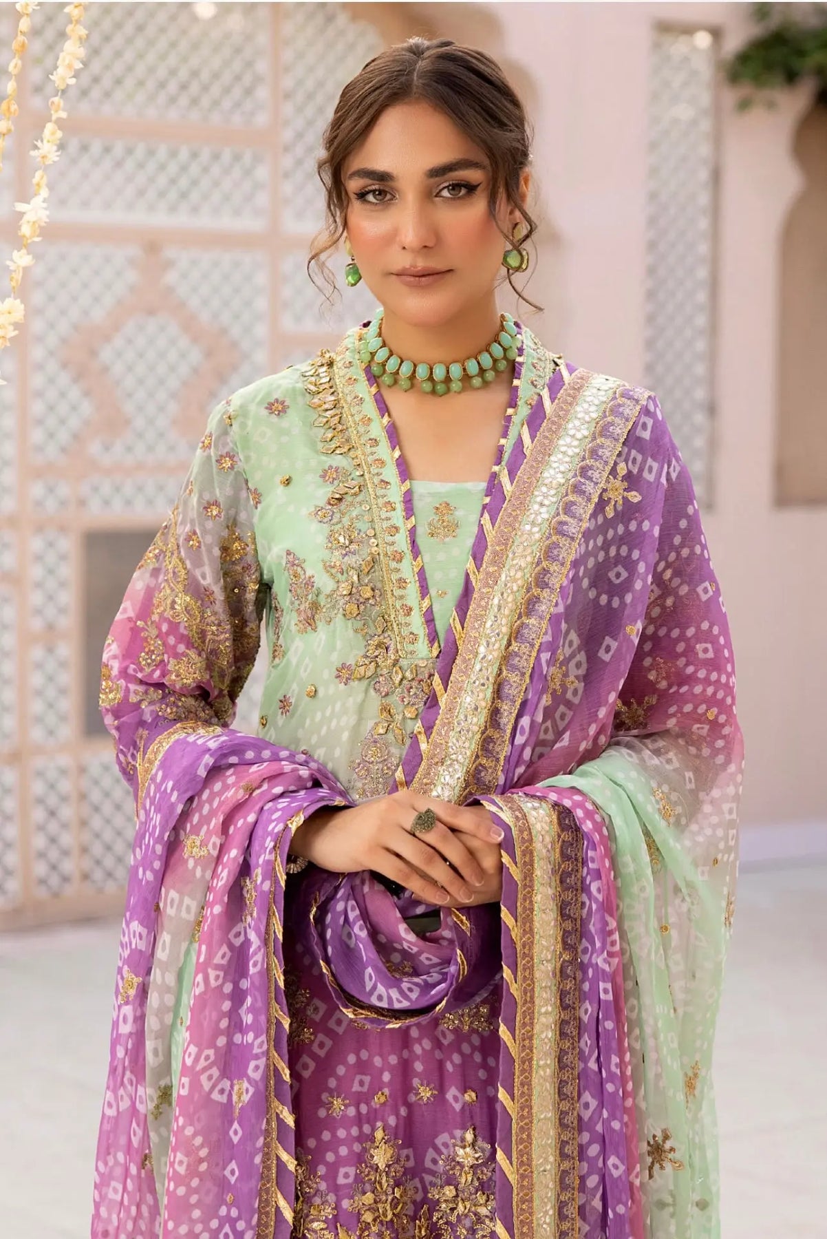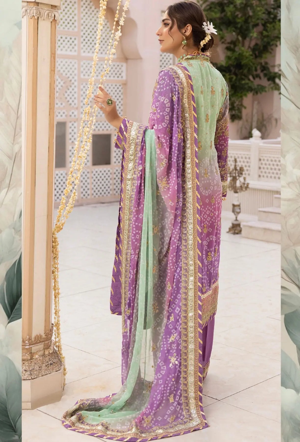 This beautiful baroque inspired 3 piece chiffon suit features a straight chunri printed shirt with luxury gotta. sequins and thread work embellishments. finished with dangling tassels on the border. It comes with full length embroidered sleeves and wide leg contrasted trousers. The look is finished with a luxury embroidered chiffon dupatta.