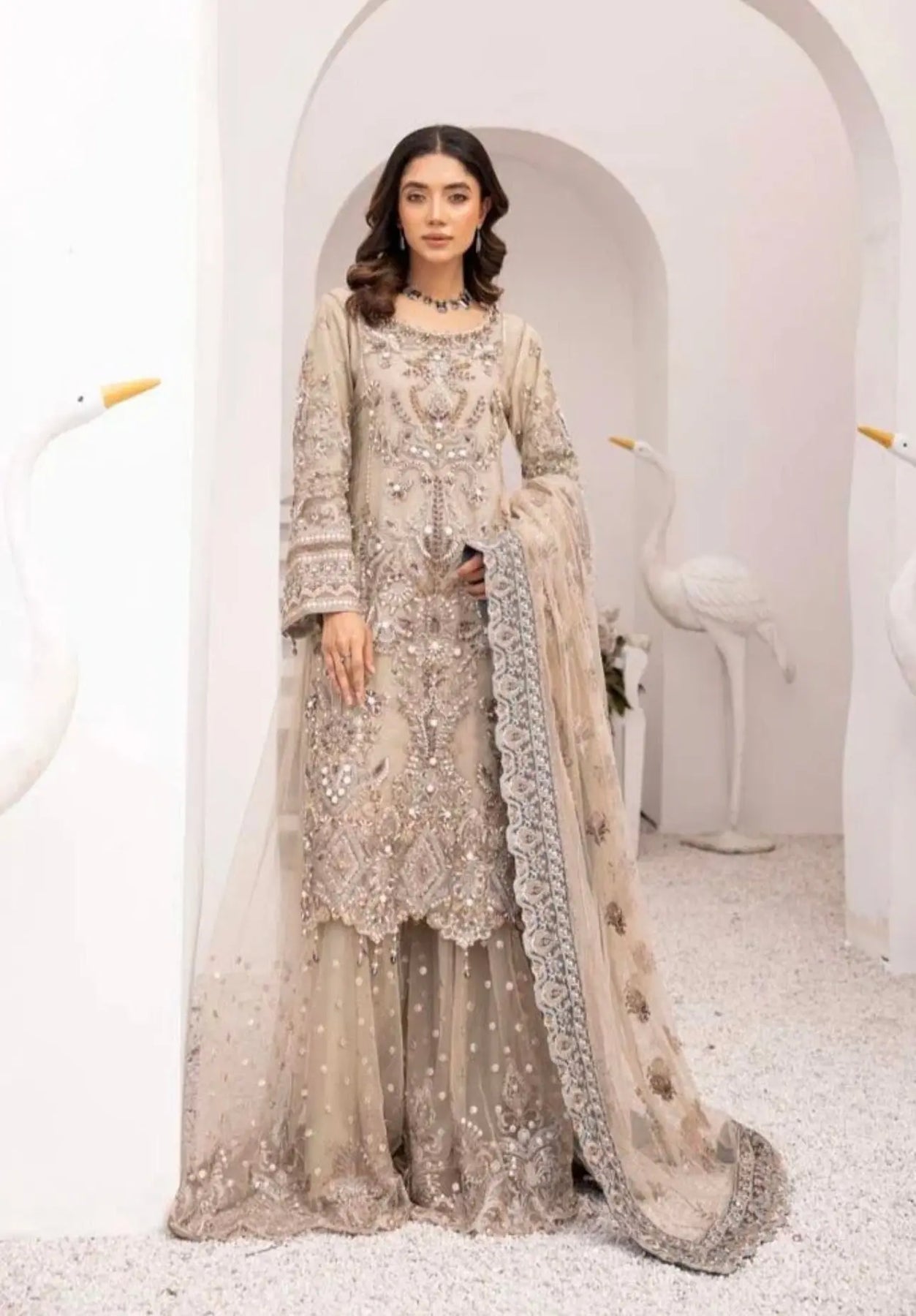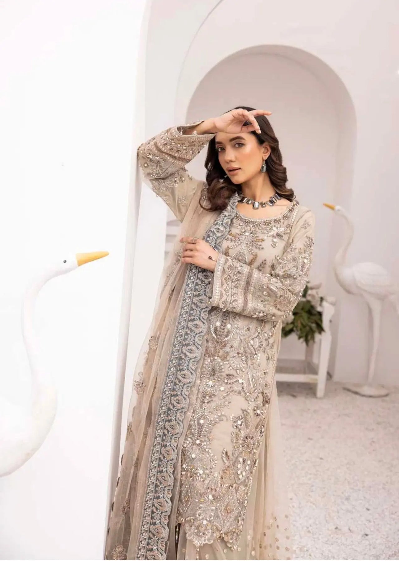 This beautiful 3 piece Imrozia collection suit features a straight shirt with luxury thread and bead work embroidered front, finished with dangling beads on the border. It comes with full length embroidered sleeves and an embroidered sharara. The look is finished with a net embroidered dupatta.