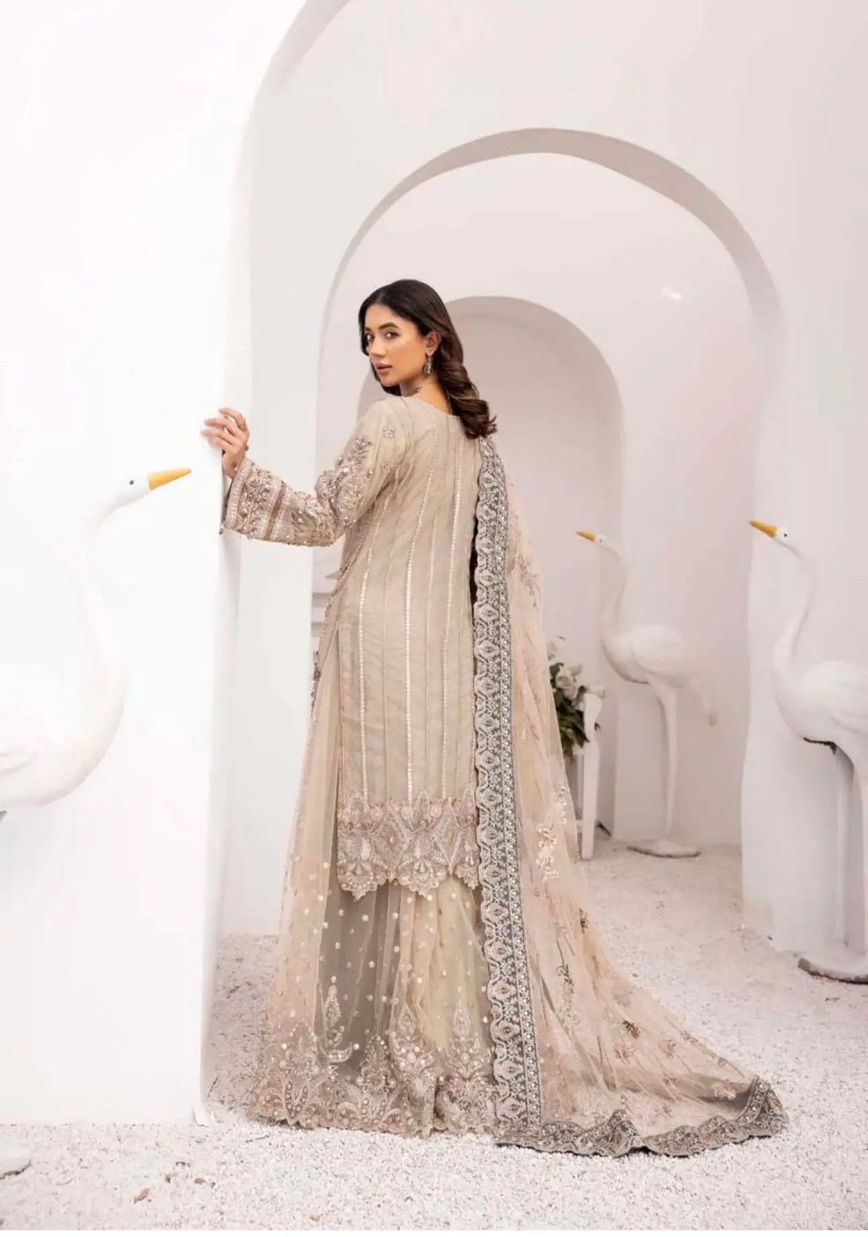 ‘Imrozia Inspired’ | Embroidered Net Readymade | SM686 (Khaki)
