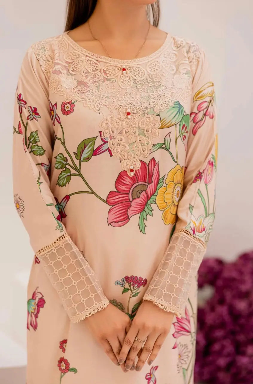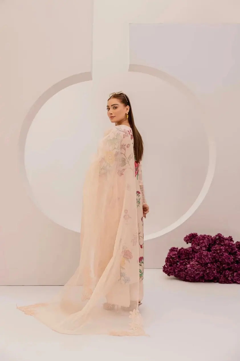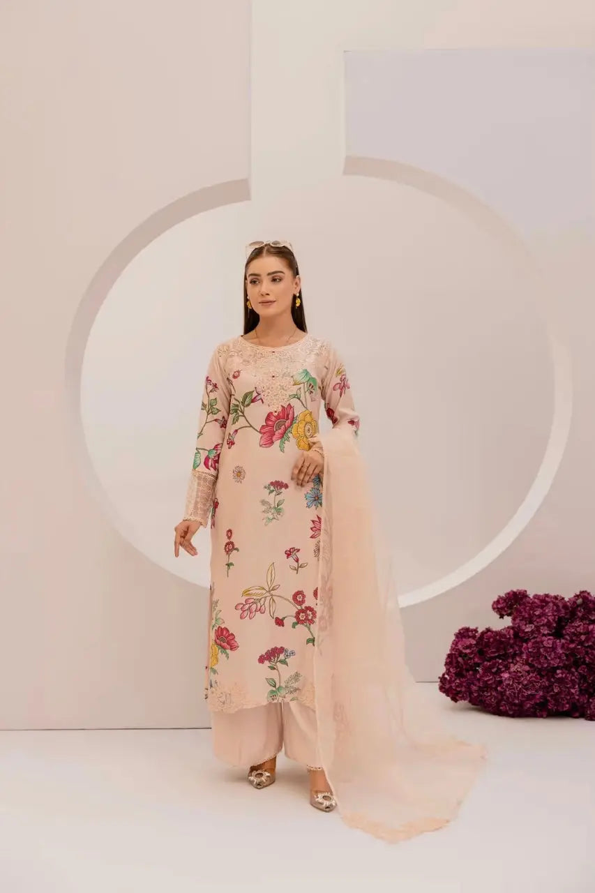 Embroidered linen with trendy digital floral print on the front and back with an organza embroidered daman. This comes with plazzo trousers and an embroidered organza dupatta.