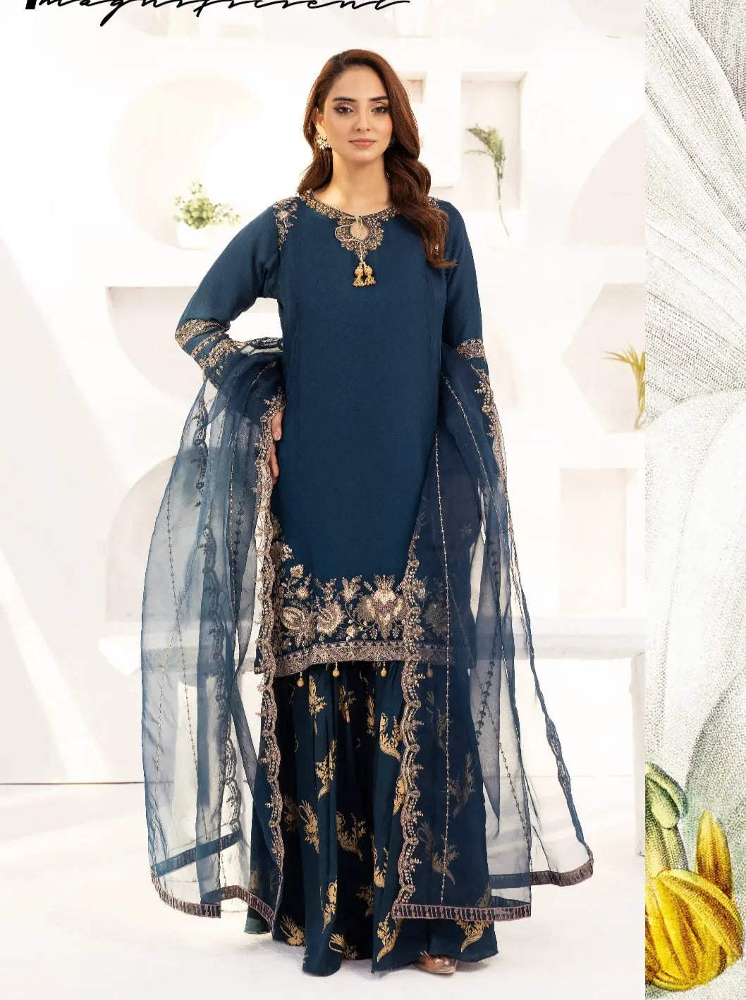 Stunning new Embroidered chiffon kameez with a printed shararah and embroidered net dupatta. Perfect for any special occasion!