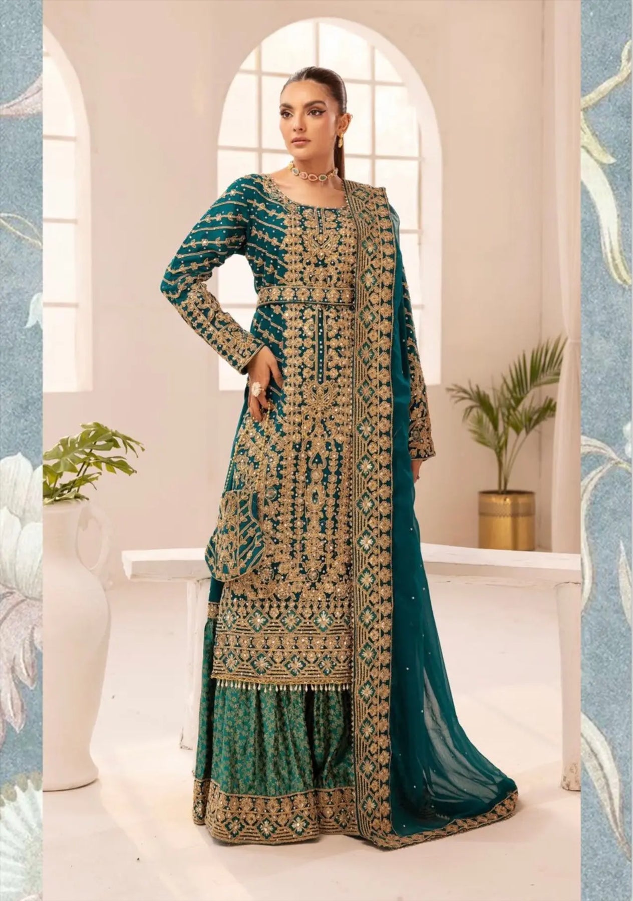 Embroidered Mirrorwork Chiffon with A Heavy Embroidered Scarf. This piece comes with a belt and a hevay farshi gharara