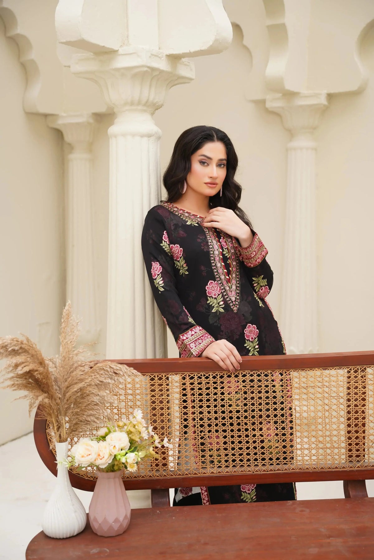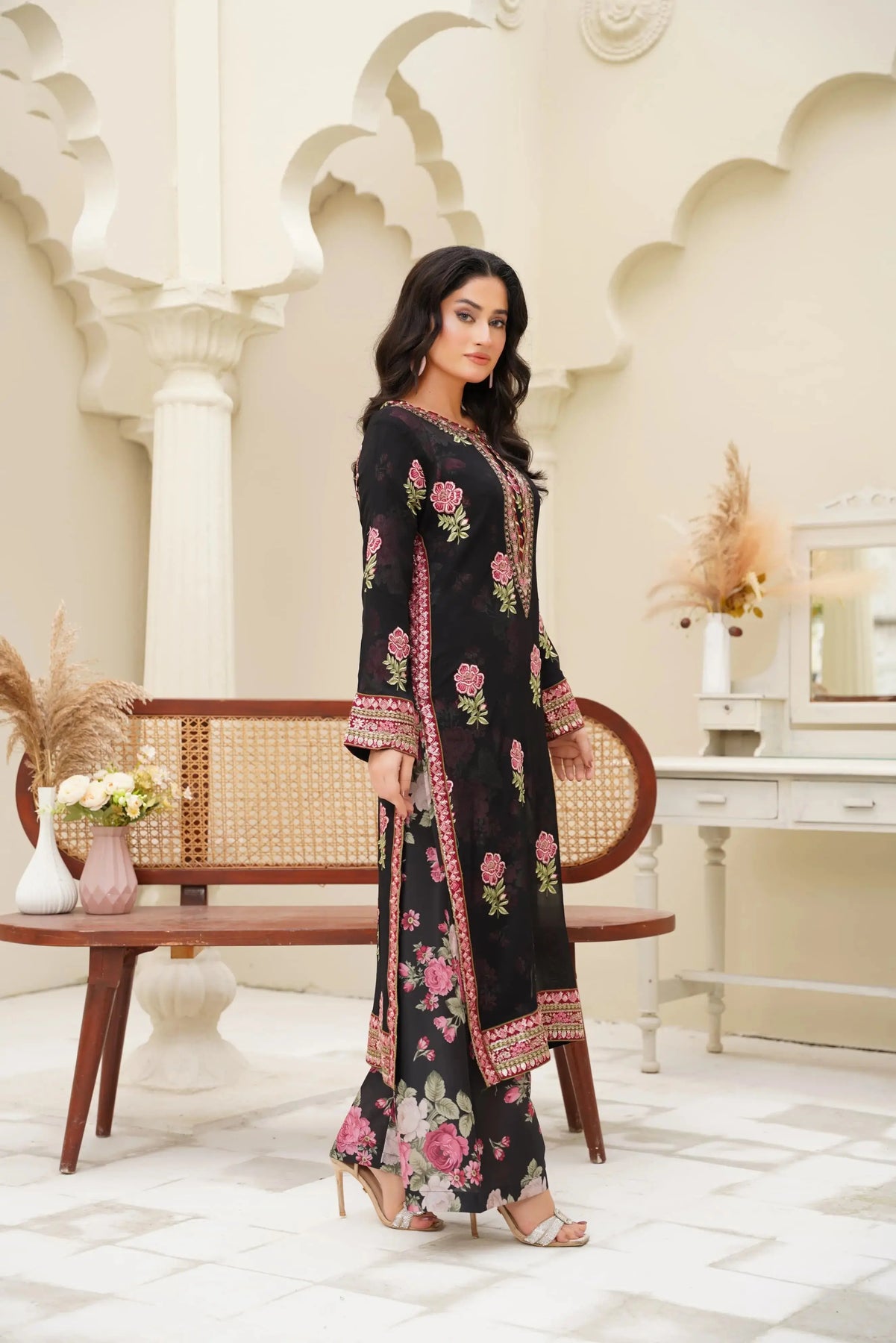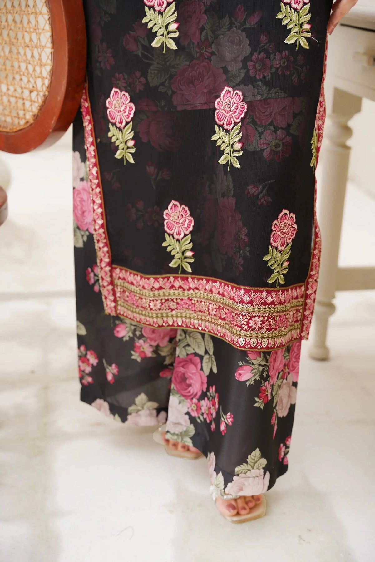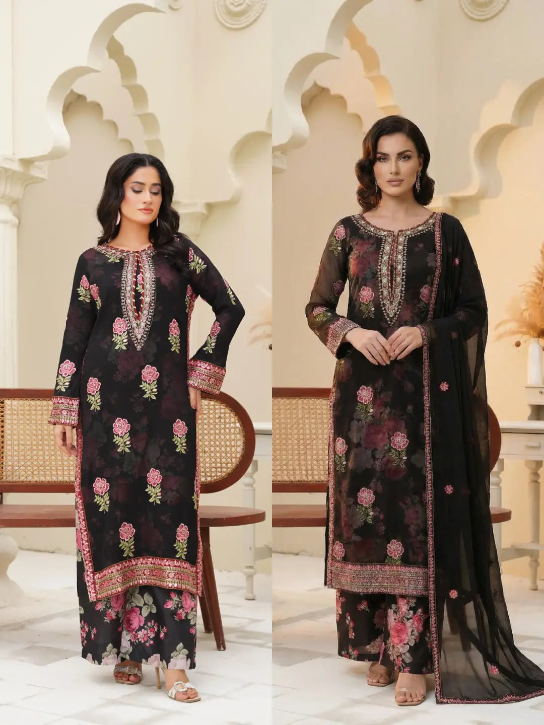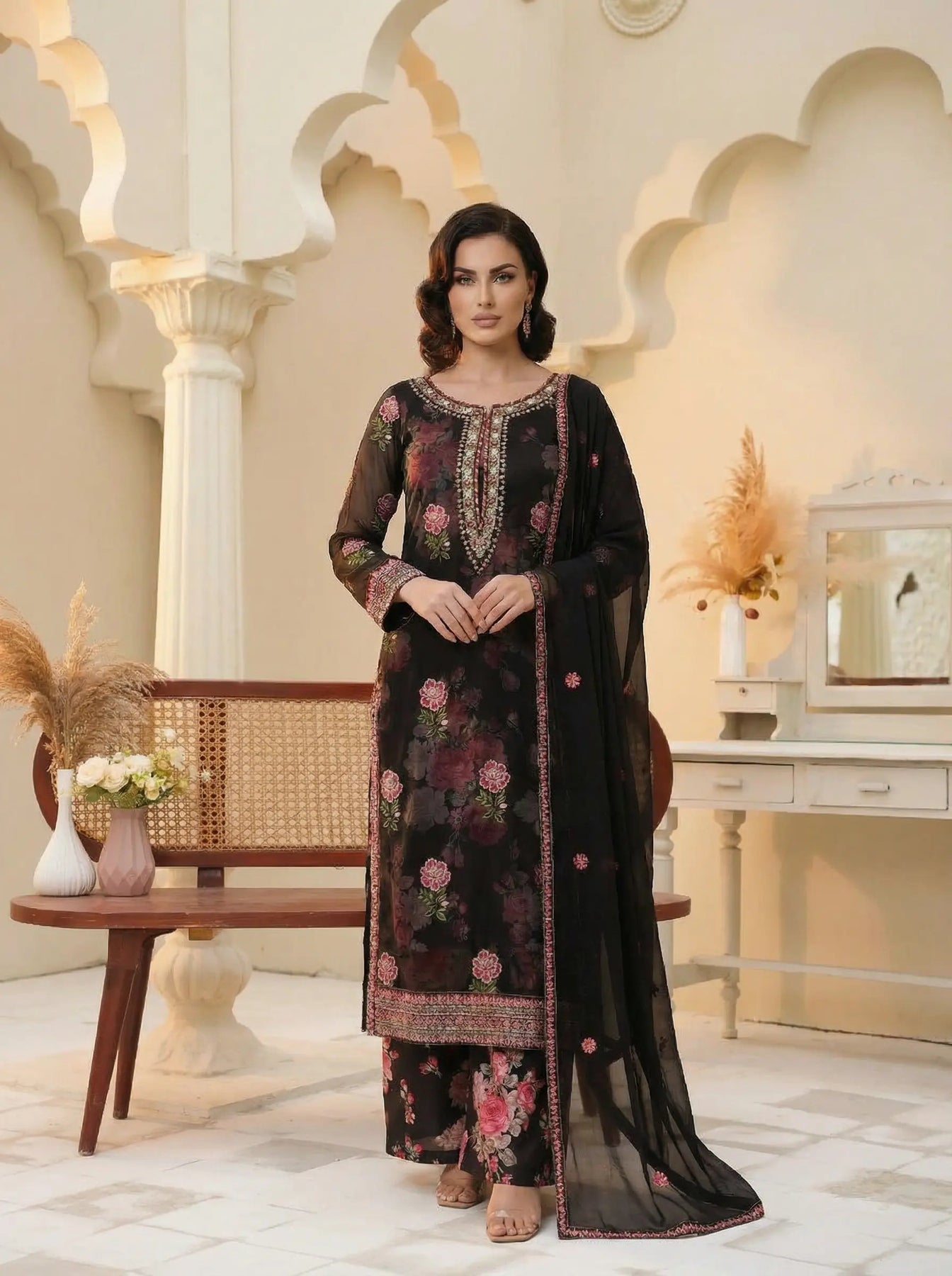Crafted on a premium chiffon with poly french printed inner and trouser, this ensemble blends refined detailing with comfortable drape. Intricate threadwork across the shirt and sleeves frames a graceful silhouette, while the coordinated trouser and delicate organza dupatta complete a polished look ideal for weddings, formal dinners, and festive evenings. A perfect ready-to-wear choice for those who value elegance and ease.